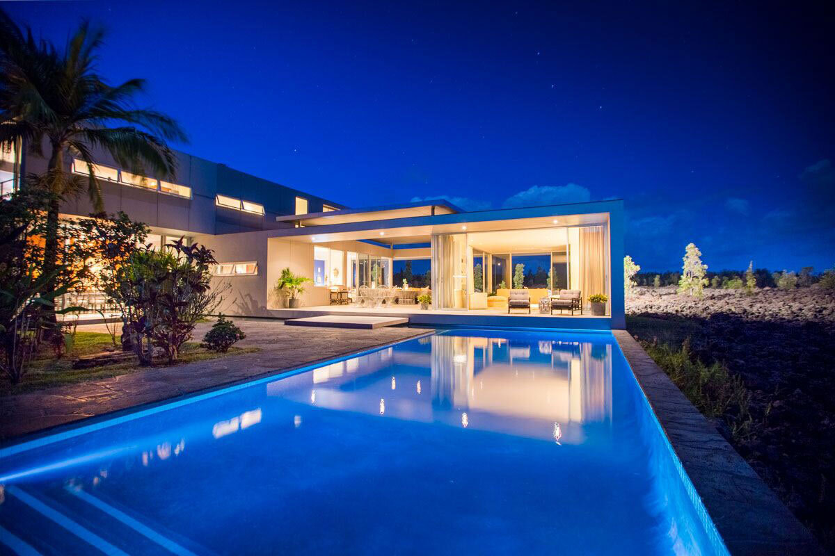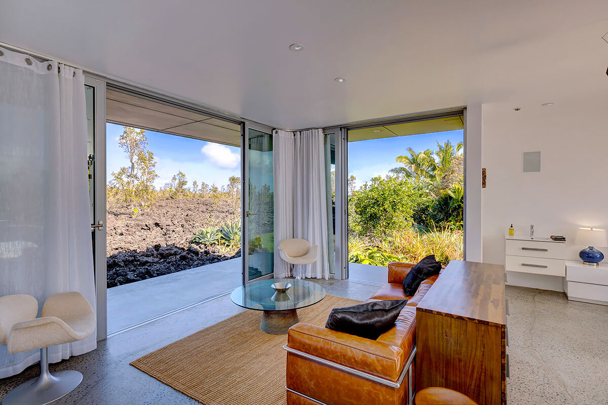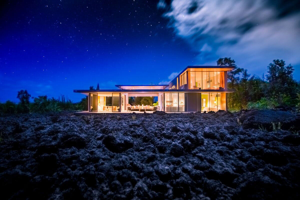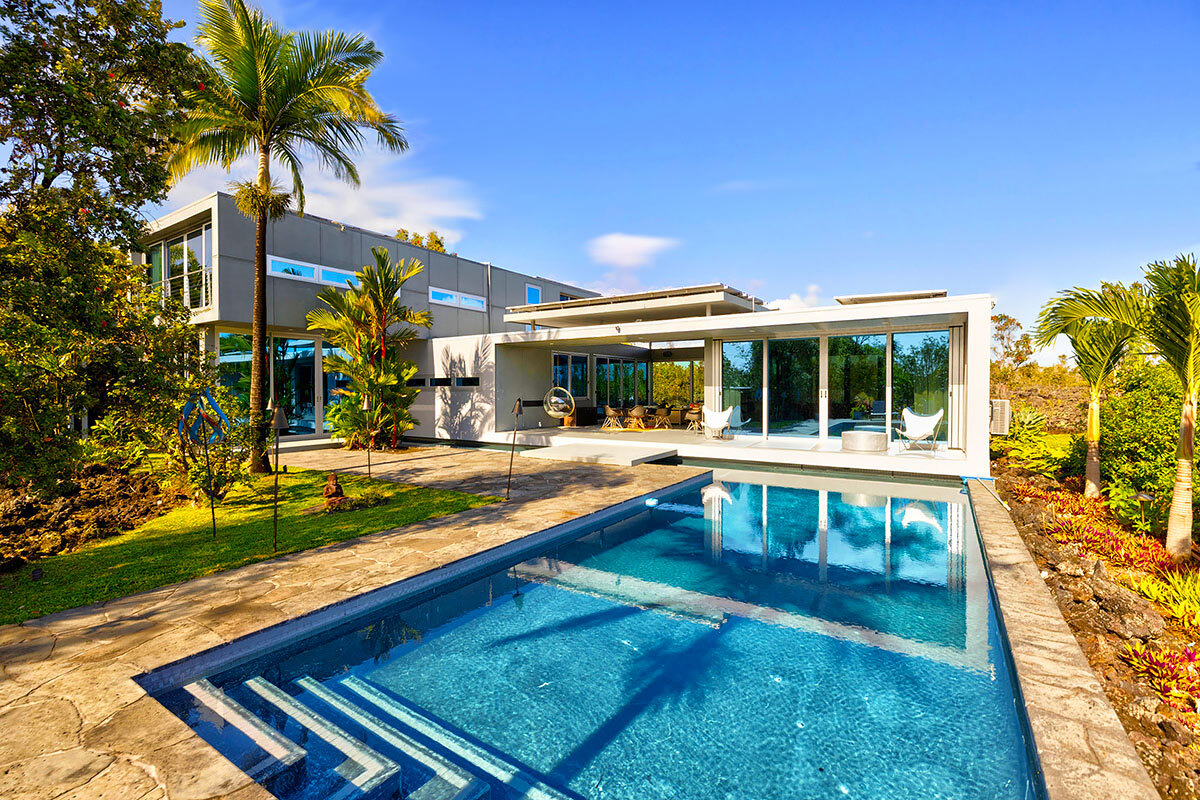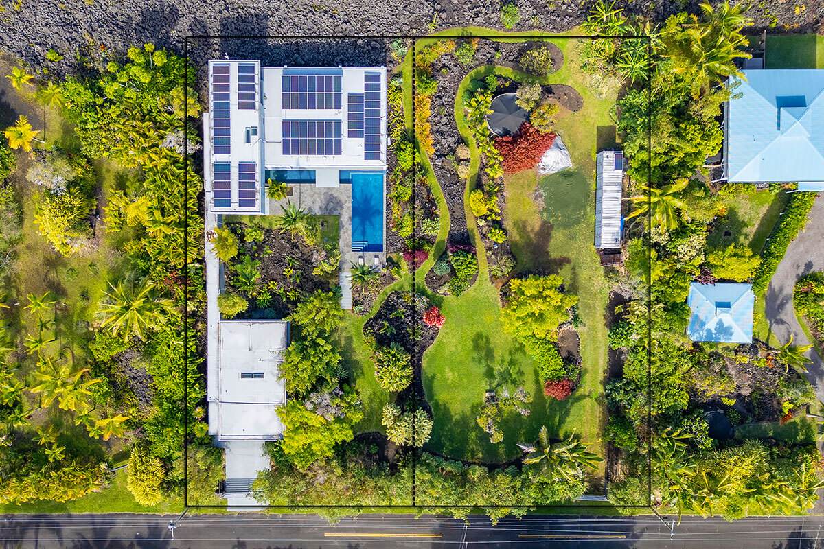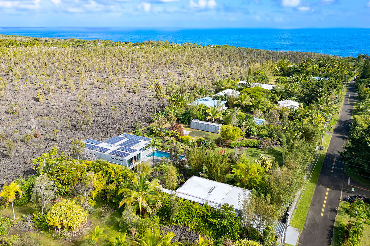 This stunning contemporary home is the flagship Hawaii creation of AIA award-winning architect Craig Steely. Lavaflow1 has been featured on the front page of the New York Times and numerous other publications. It is a turnkey permitted vacation rental nestled between dramatic lava fields and lush tropical gardens with expansive ocean views beyond, offering a place of intentional peacefulness and unparalleled beauty. Located in the coastal community of Puna Beach Palisades on the spectacular East Hawaii Coastline minutes from black sand beaches, azure blue ocean, and lush jungle; this is the perfect setting to unwind and renew the mind, body and spirit. The focal point of the property is a 30,000-gallon in-ground saltwater pool, surrounded by the structure’s two wings linked by a covered walkway. In front, the 820sf private guest suite w/full bath, patio & garage/workshop; To the rear, the 2800sf, 2-story main house w/walls of windows, 2 bedrooms, 2 full baths, office, formal dining room, 2 living rooms and grand covered lanai. Attention to detail is evident throughout in the clean lines, soothing colors, updated interior and more! The home’s gourmet kitchen has beautiful cabinetry, Jurassic granite counter tops, 3 sinks & high-end stainless appliances. A Mango wood cantilevered stairway leads to the primary suite and study, each with sweeping views. A favorite place to entertain or enjoy the quiet beauty around you is the 800 sqft lanai with its uninterrupted views over pristine lava fields and the ocean beyond. To the other side of the lanai is a stunning glass-enclosed room with a variety of uses, bedroom, living room, yoga room, with pool views and garden vistas to the south and lava scape to the north. The current owner has extensively refurbished and upgraded the home, including adding an owned robust solar system. Please see attachment. Kehena Beach is a short few minutes away. Pahoa Town and all in convinces is a short 20 minute drive away.
