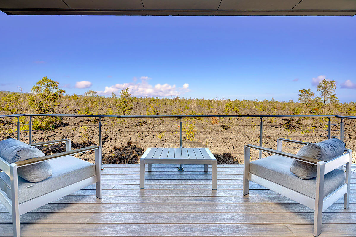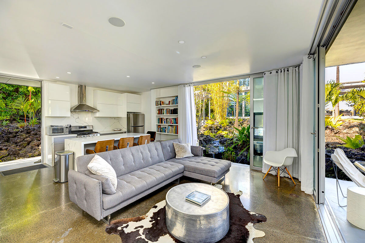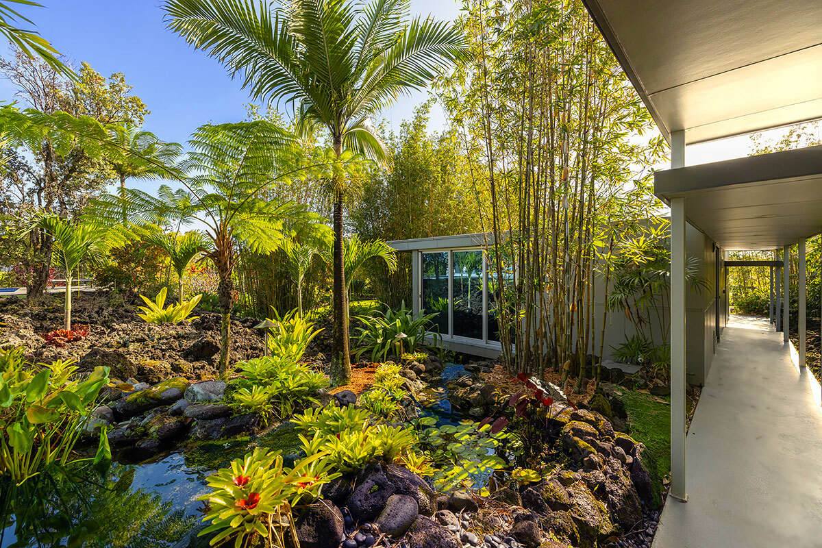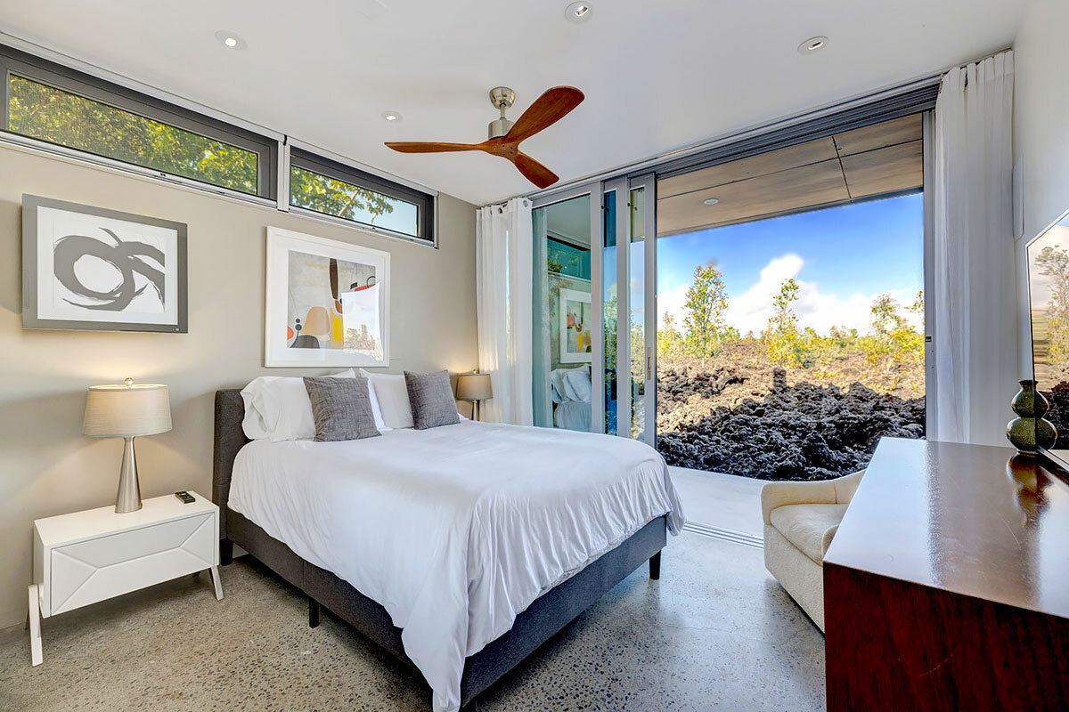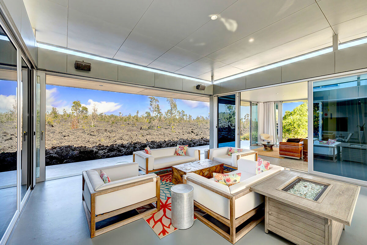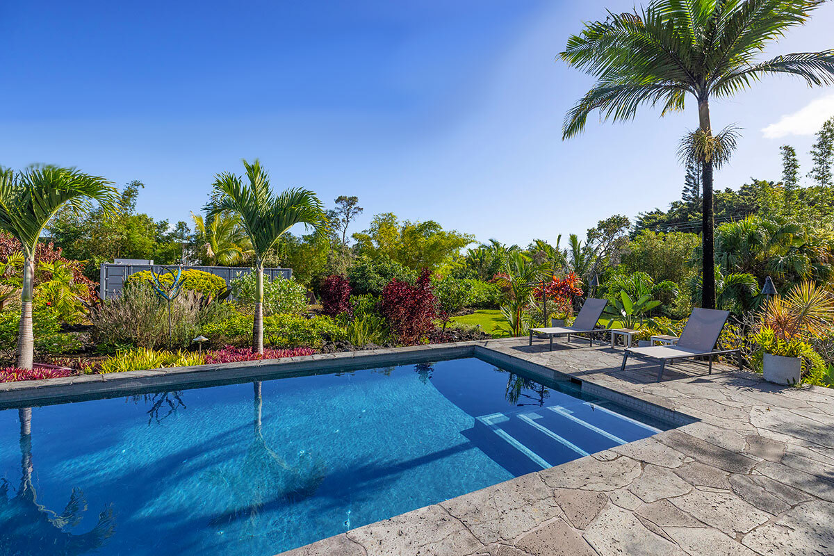 This stunning contemporary home is the flagship Hawaii creation of AIA award-winning architect Craig Steely. Lavaflow1 has been featured on the front page of the New York Times and numerous other publications. It is a turnkey permitted vacation rental nestled between dramatic lava fields and lush tropical gardens with expansive ocean views beyond, offering a place of intentional peacefulness and unparalleled beauty. Located in the coastal community of Puna Beach Palisades on the spectacular East Hawaii Coastline minutes from black sand beaches, azure blue ocean, and lush jungle; this is the perfect setting to unwind and renew the mind, body and spirit. The focal point of the property is a 30,000-gallon in-ground saltwater pool, surrounded by the structure’s two wings linked by a covered walkway. In front, the 820sf private guest suite w/full bath, patio & garage/workshop; To the rear, the 2800sf, 2-story main house w/walls of windows, 2 bedrooms, 2 full baths, office, formal dining room, 2 living rooms and grand covered lanai. Attention to detail is evident throughout in the clean lines, soothing colors, updated interior and more! The home’s gourmet kitchen has beautiful cabinetry, Jurassic granite counter tops, 3 sinks & high-end stainless appliances. A Mango wood cantilevered stairway leads to the primary suite and study, each with sweeping views. A favorite place to entertain or enjoy the quiet beauty around you is the 800 sqft lanai with its uninterrupted views over pristine lava fields and the ocean beyond. To the other side of the lanai is a stunning glass-enclosed room with a variety of uses, bedroom, living room, yoga room, with pool views and garden vistas to the south and lava scape to the north. The current owner has extensively refurbished and upgraded the home, including adding an owned robust solar system. Please see attachment. Kehena Beach is a short few minutes away. Pahoa Town and all in convinces is a short 20 minute drive away.