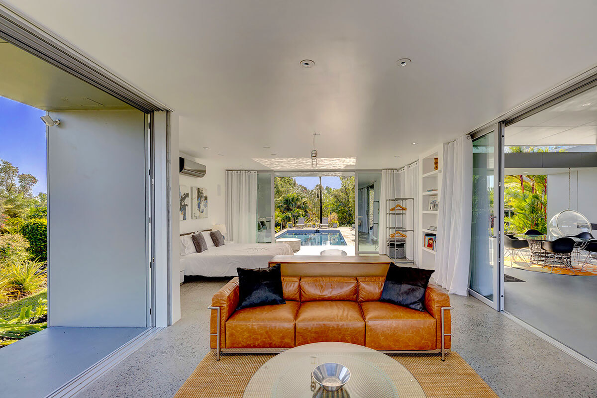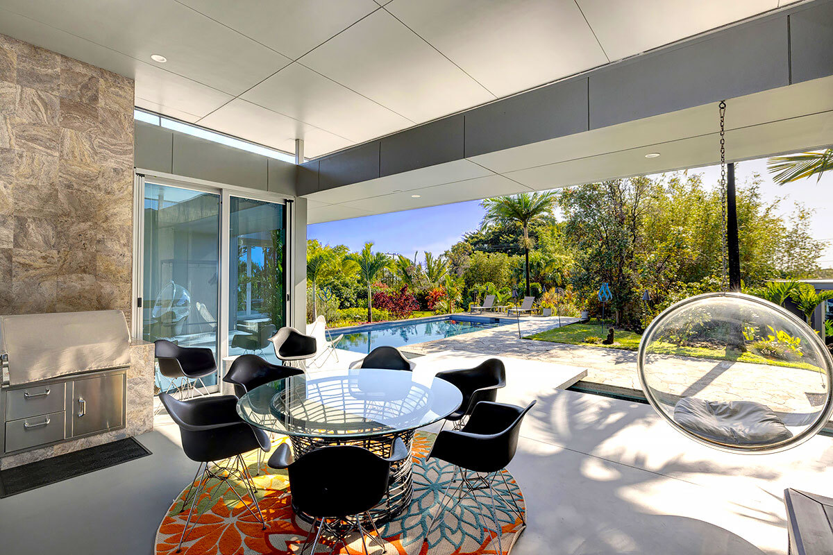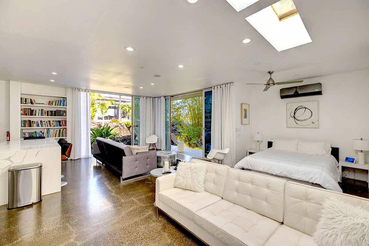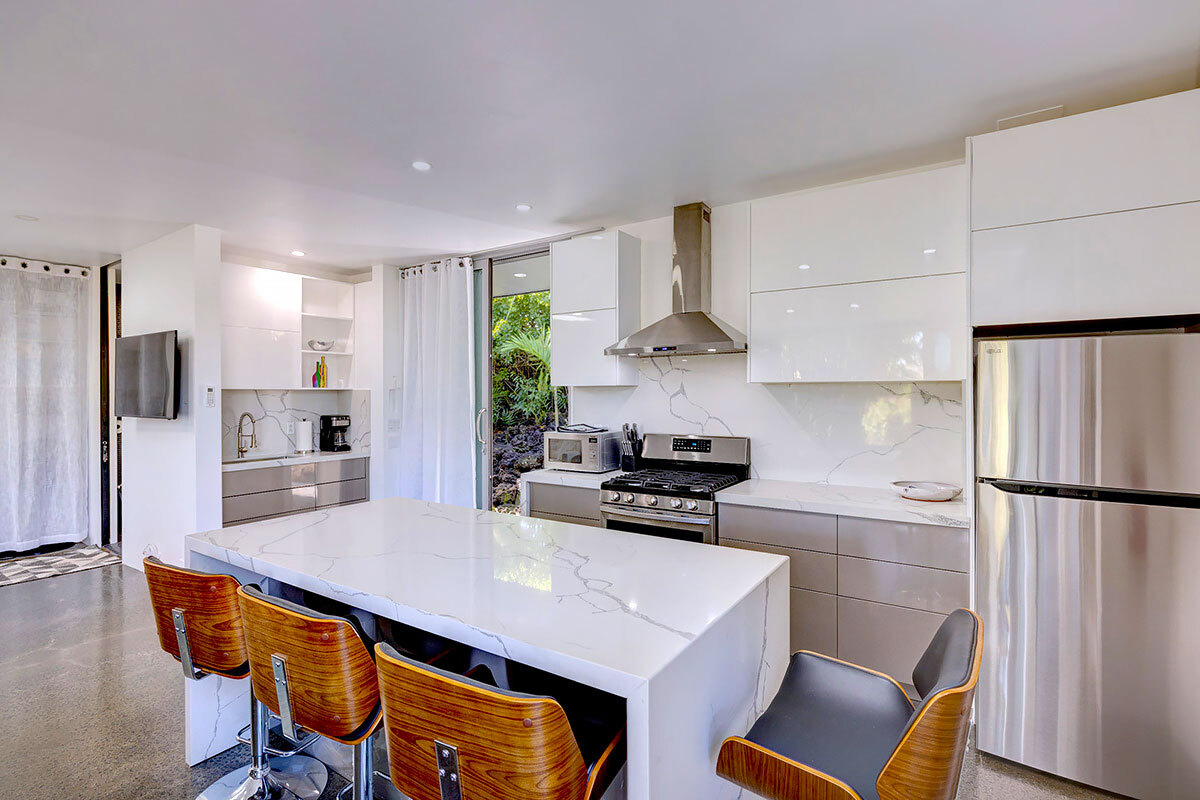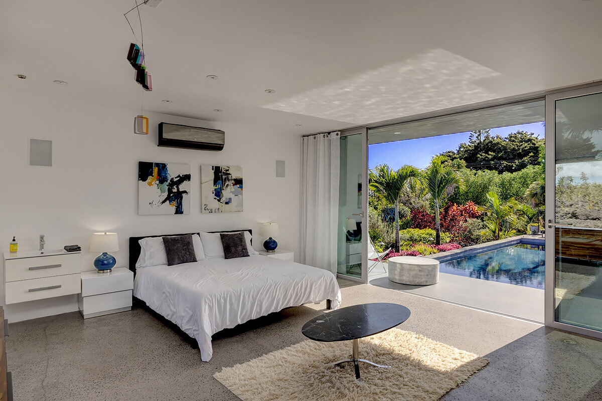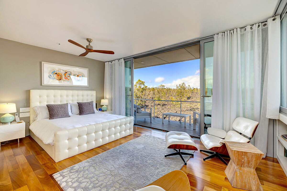 This stunning contemporary home is the flagship Hawaii creation of AIA award-winning architect Craig Steely. Lavaflow1 has been featured on the front page of the New York Times and numerous other publications. It is a turnkey permitted vacation rental nestled between dramatic lava fields and lush tropical gardens with expansive ocean views beyond, offering a place of intentional peacefulness and unparalleled beauty. Located in the coastal community of Puna Beach Palisades on the spectacular East Hawaii Coastline minutes from black sand beaches, azure blue ocean, and lush jungle; this is the perfect setting to unwind and renew the mind, body and spirit. The focal point of the property is a 30,000-gallon in-ground saltwater pool, surrounded by the structure’s two wings linked by a covered walkway. In front, the 820sf private guest suite w/full bath, patio & garage/workshop; To the rear, the 2800sf, 2-story main house w/walls of windows, 2 bedrooms, 2 full baths, office, formal dining room, 2 living rooms and grand covered lanai. Attention to detail is evident throughout in the clean lines, soothing colors, updated interior and more! The home’s gourmet kitchen has beautiful cabinetry, Jurassic granite counter tops, 3 sinks & high-end stainless appliances. A Mango wood cantilevered stairway leads to the primary suite and study, each with sweeping views. A favorite place to entertain or enjoy the quiet beauty around you is the 800 sqft lanai with its uninterrupted views over pristine lava fields and the ocean beyond. To the other side of the lanai is a stunning glass-enclosed room with a variety of uses, bedroom, living room, yoga room, with pool views and garden vistas to the south and lava scape to the north. The current owner has extensively refurbished and upgraded the home, including adding an owned robust solar system. Please see attachment. Kehena Beach is a short few minutes away. Pahoa Town and all in convinces is a short 20 minute drive away.