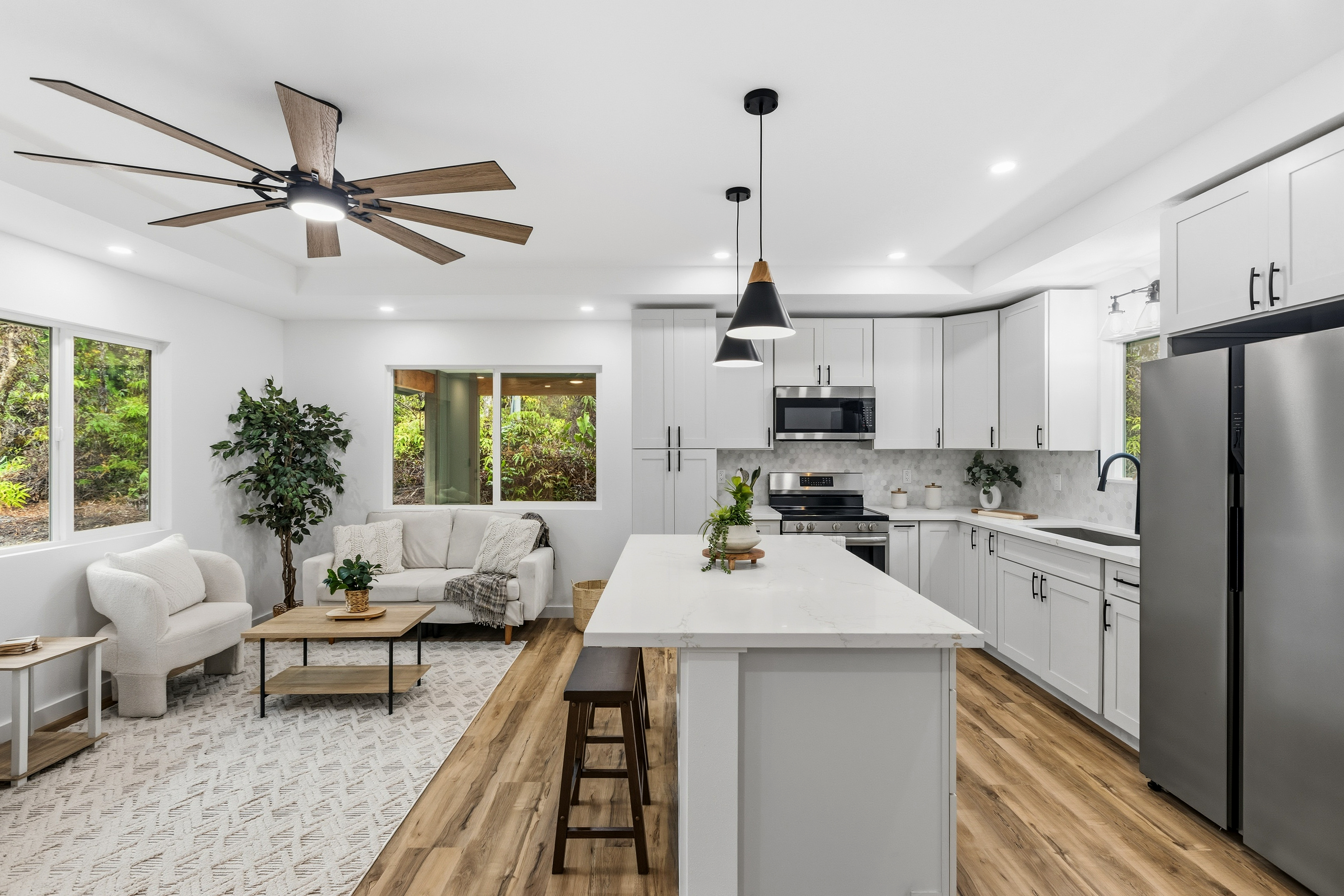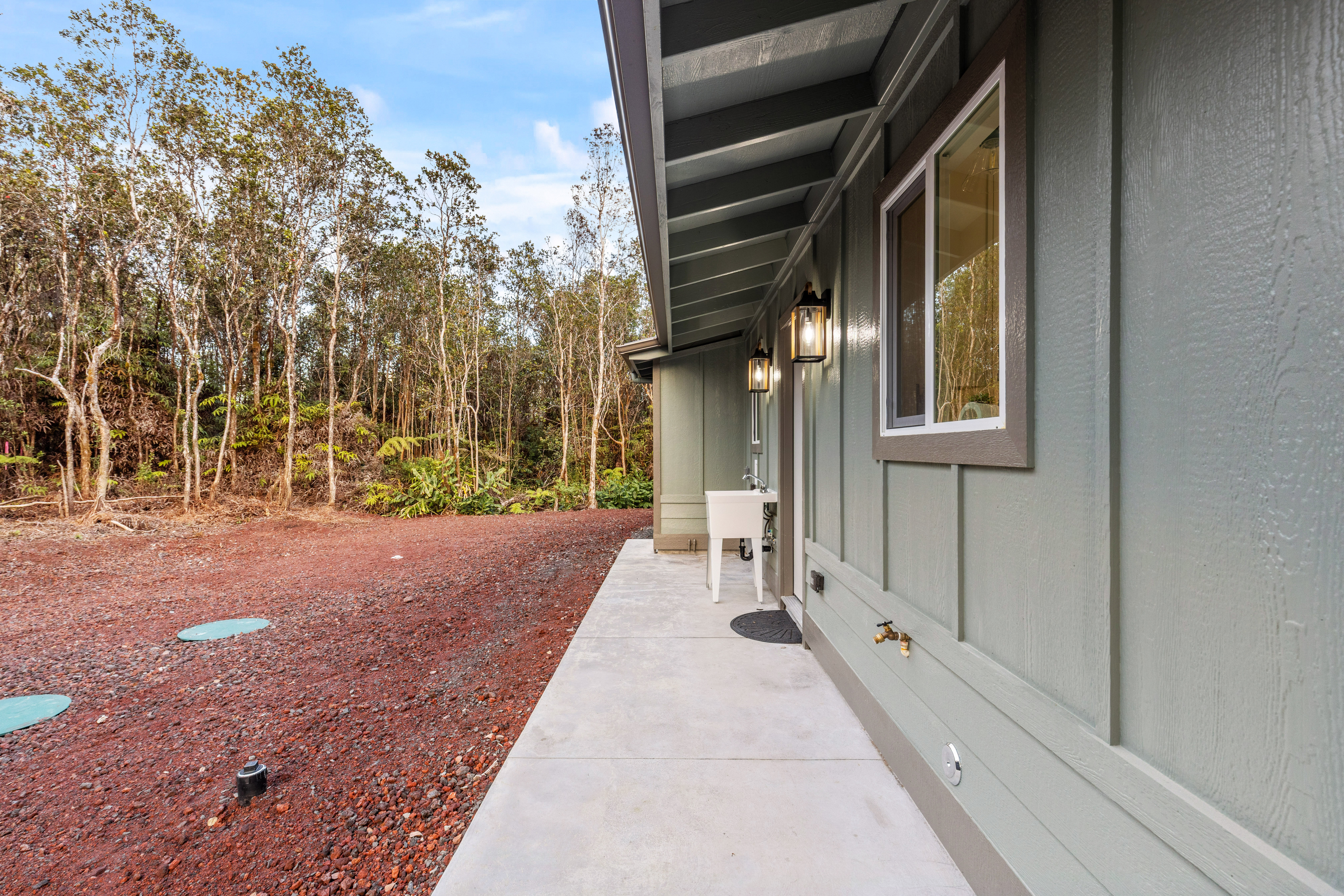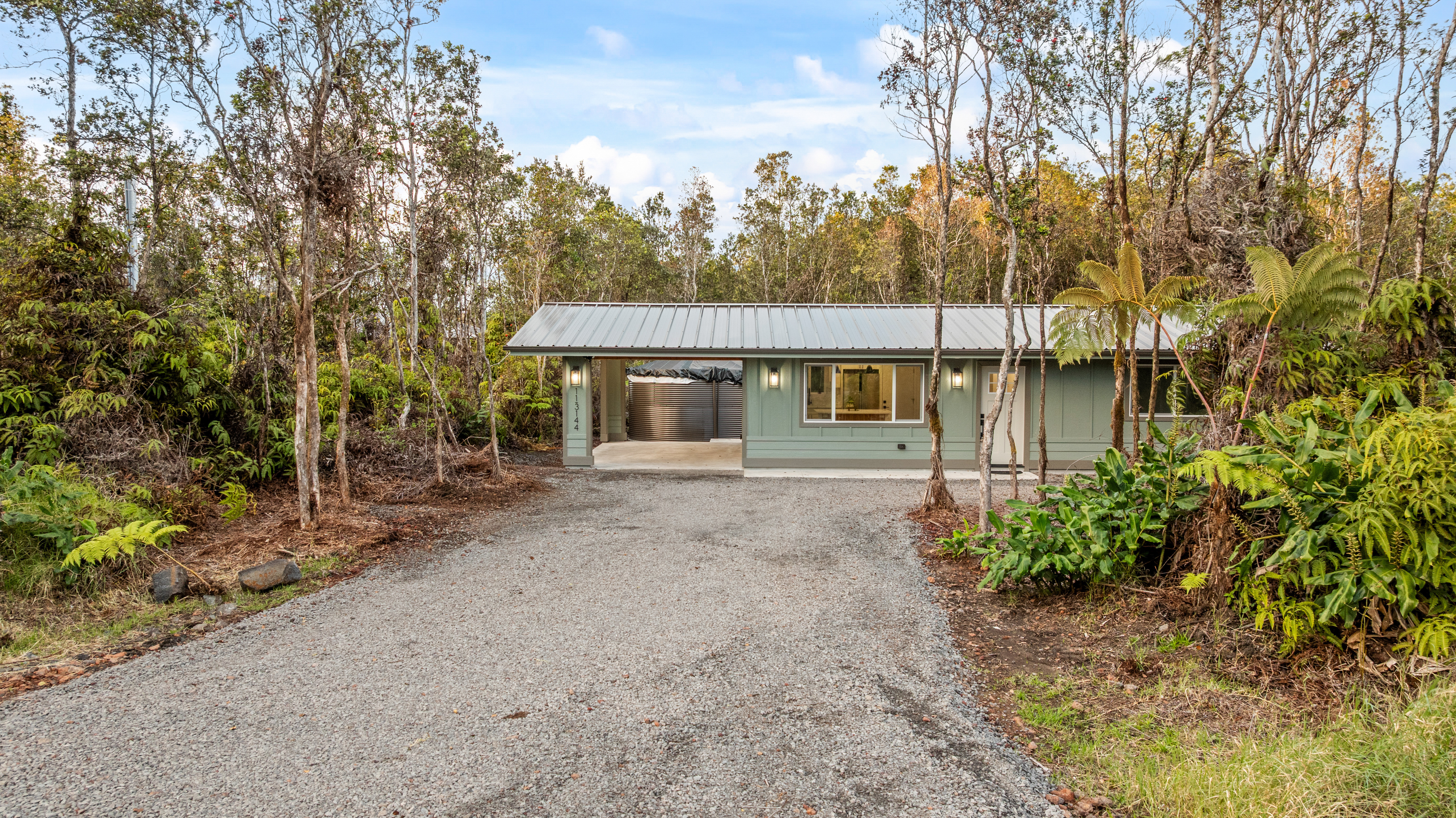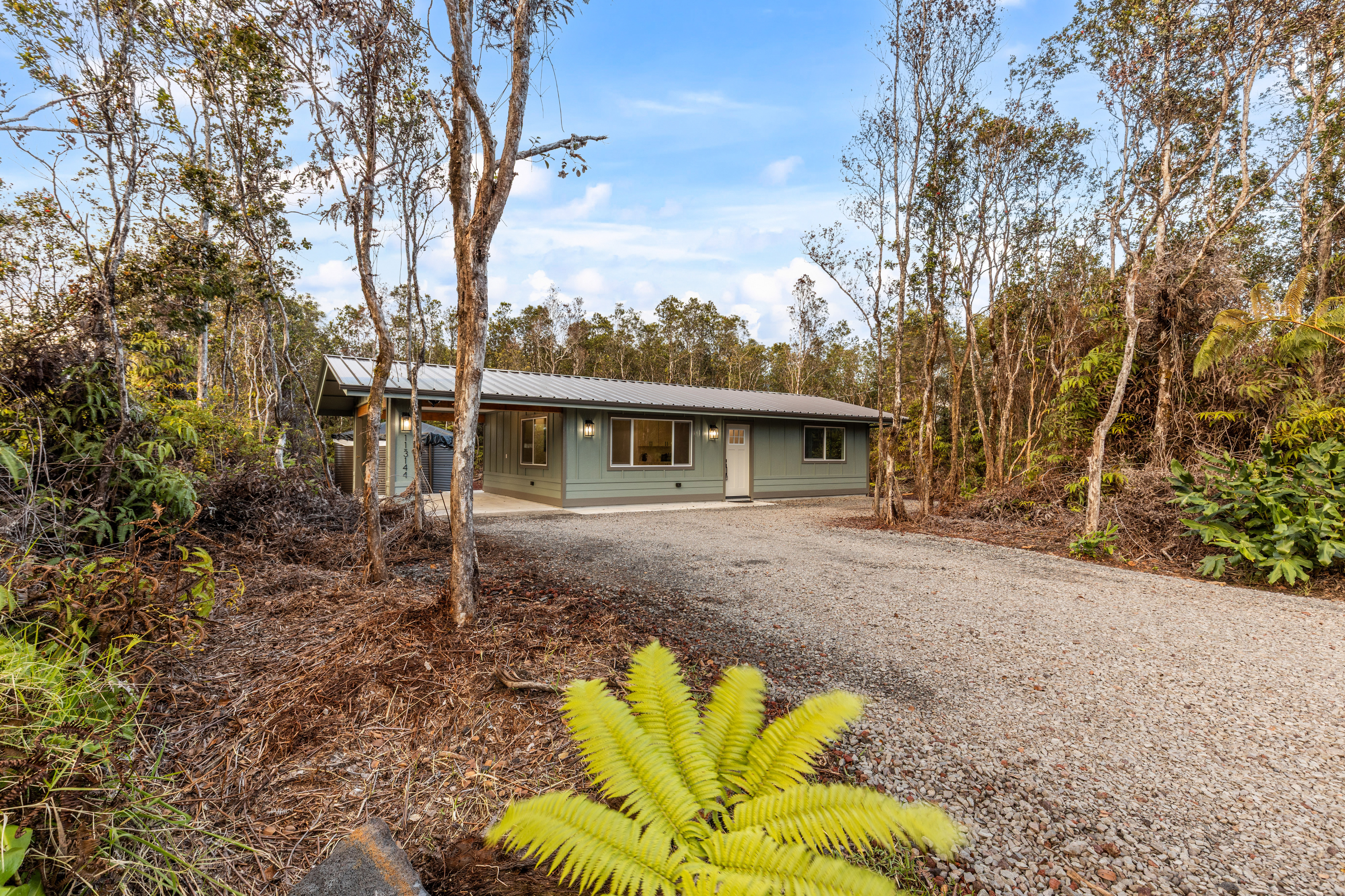Brand new 2-bedroom, 1-bath residence located in the desirable Royal Hawaiian Estates, just minutes from Hawai?i Volcanoes National Park. This thoughtfully designed home showcases modern living with brand-new appliances, elegant quartzite countertops, and a stunning built-in electric fireplace that adds warmth and style. Nestled in a quiet, cozy neighborhood surrounded by native ?ohi?a forest, this property offers a peaceful retreat while remaining conveniently accessible. Enjoy the perfect blend of new construction, contemporary finishes, and the natural beauty of Hawai?i. A rare opportunity you won’t want to miss.
