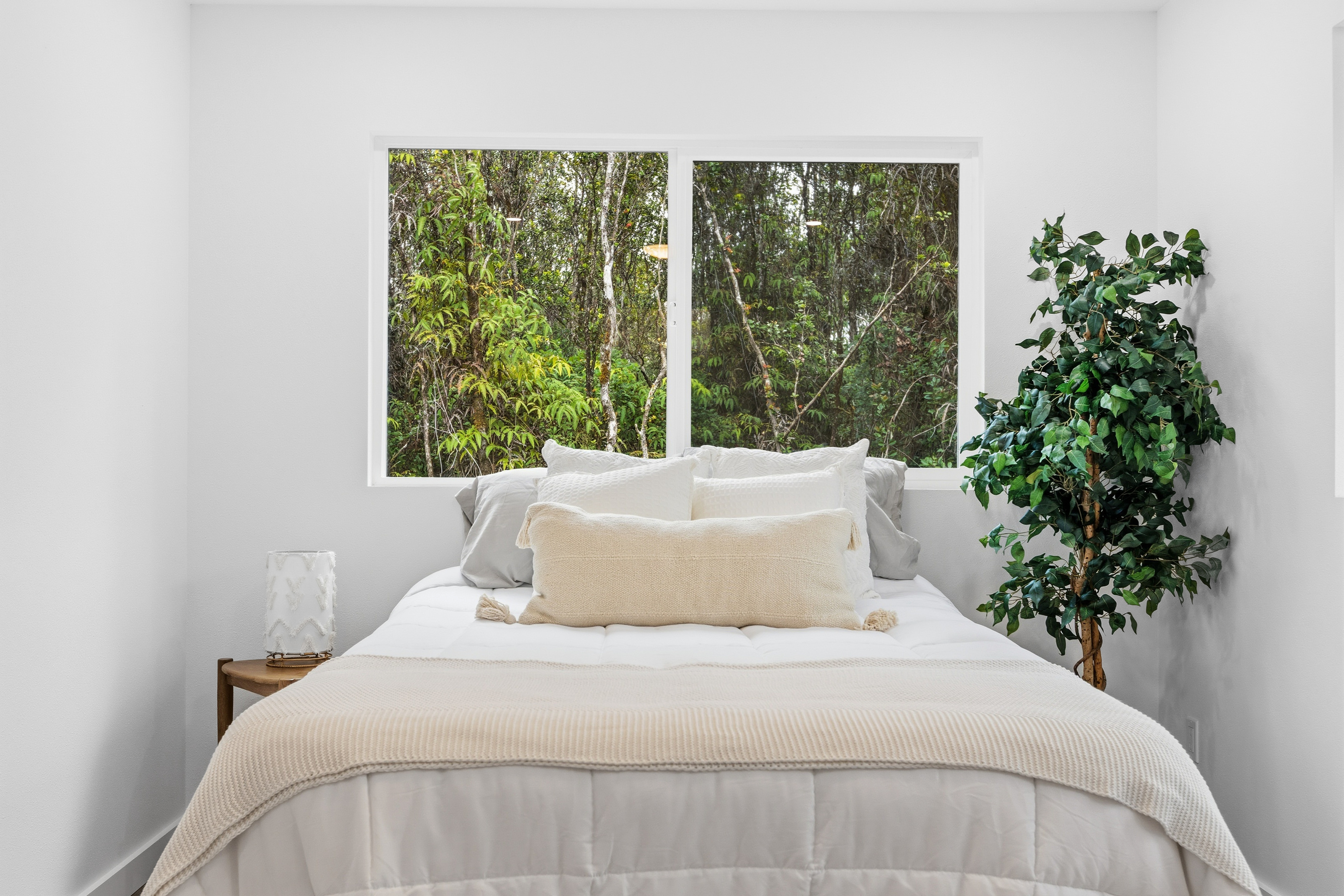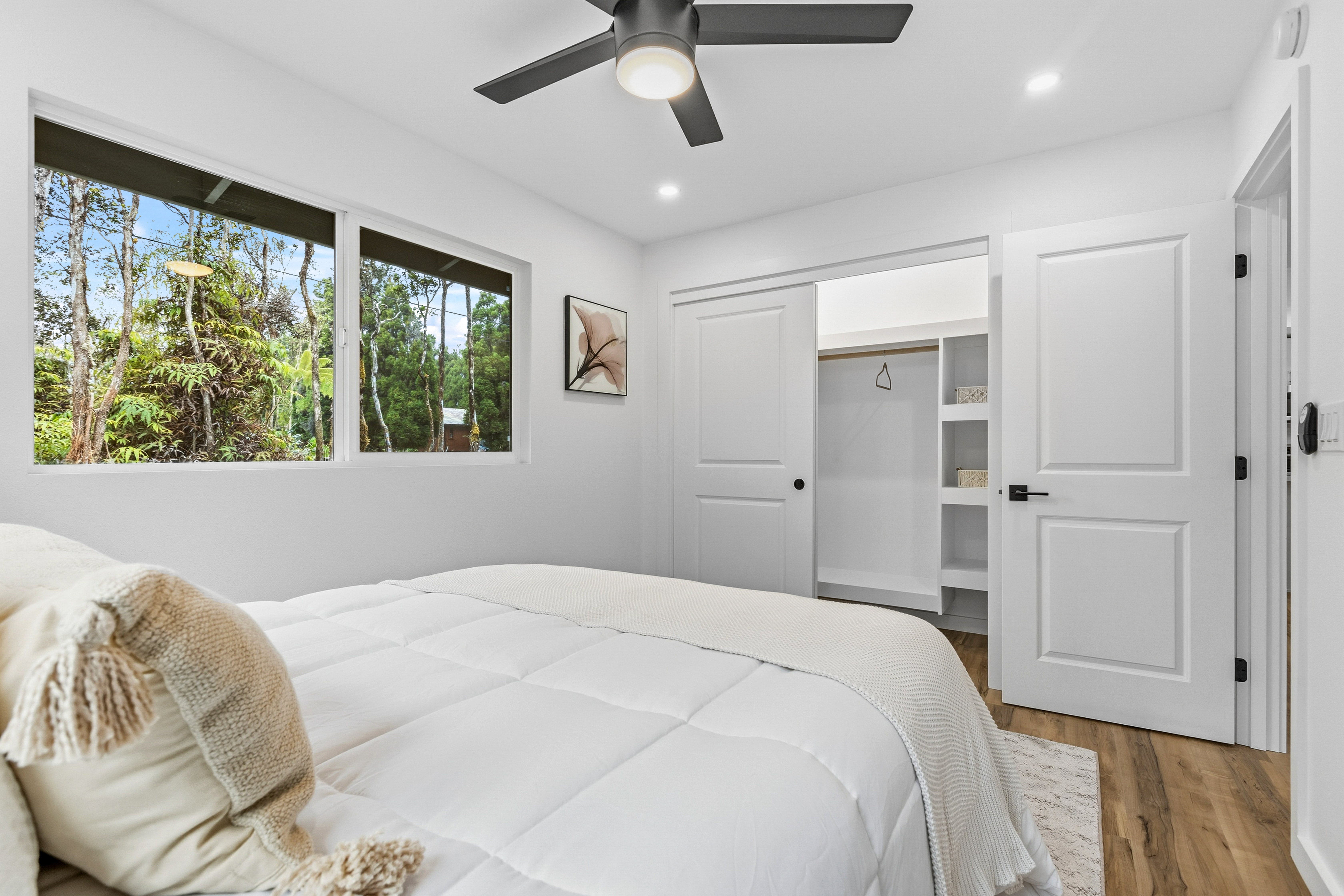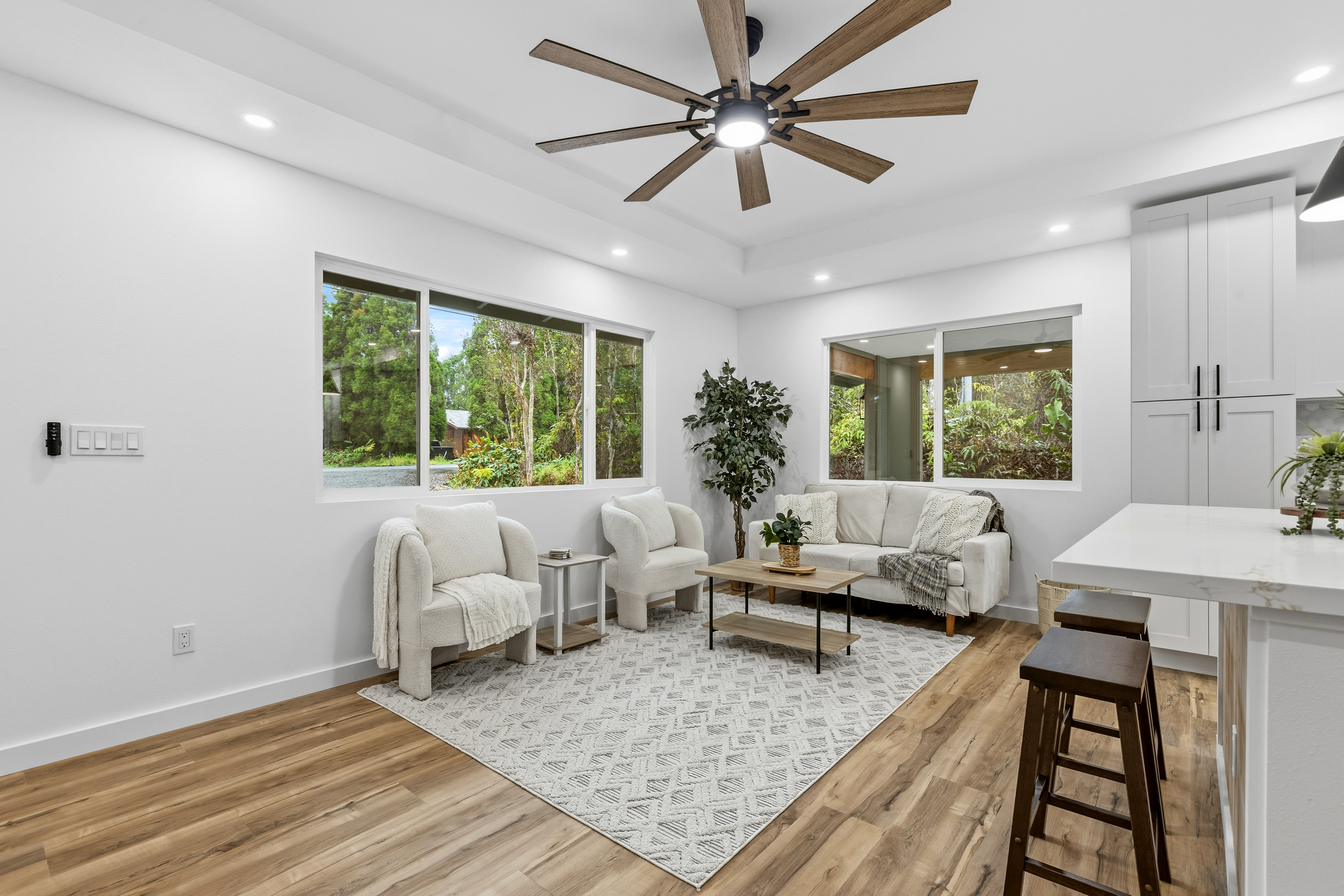 Brand new 2-bedroom, 1-bath residence located in the desirable Royal Hawaiian Estates, just minutes from Hawai?i Volcanoes National Park. This thoughtfully designed home showcases modern living with brand-new appliances, elegant quartzite countertops, and a stunning built-in electric fireplace that adds warmth and style. Nestled in a quiet, cozy neighborhood surrounded by native ?ohi?a forest, this property offers a peaceful retreat while remaining conveniently accessible. Enjoy the perfect blend of new construction, contemporary finishes, and the natural beauty of Hawai?i. A rare opportunity you won’t want to miss.