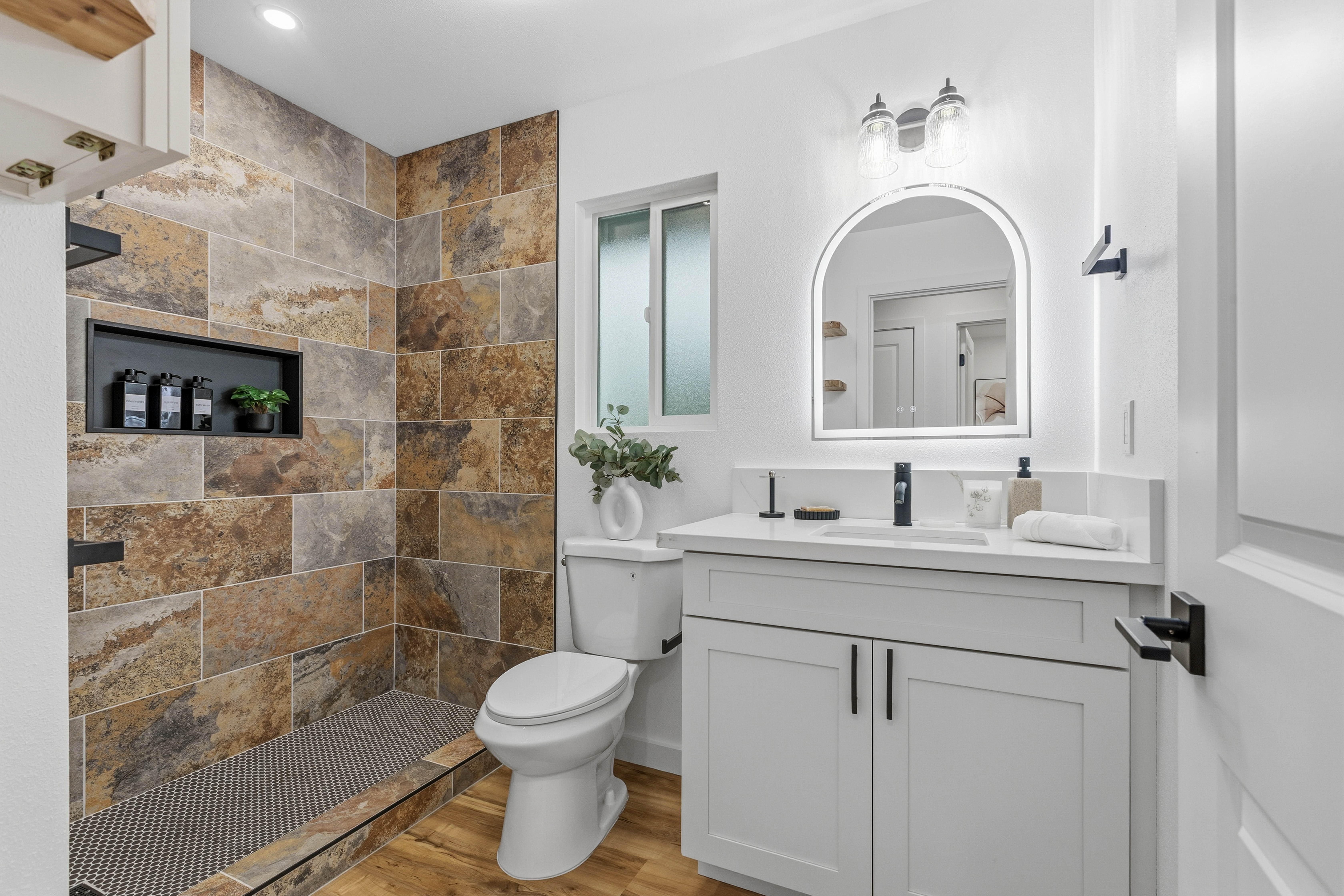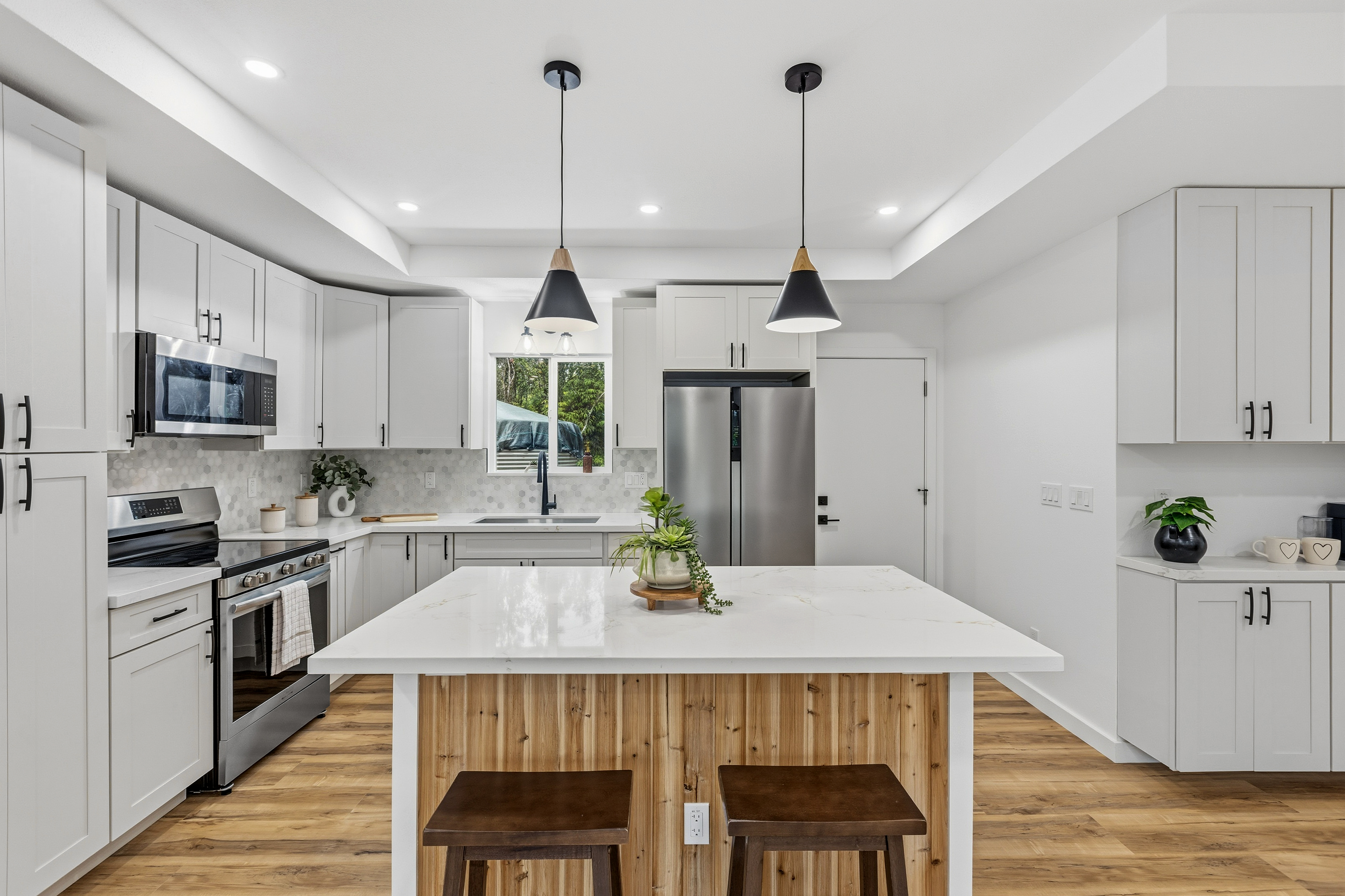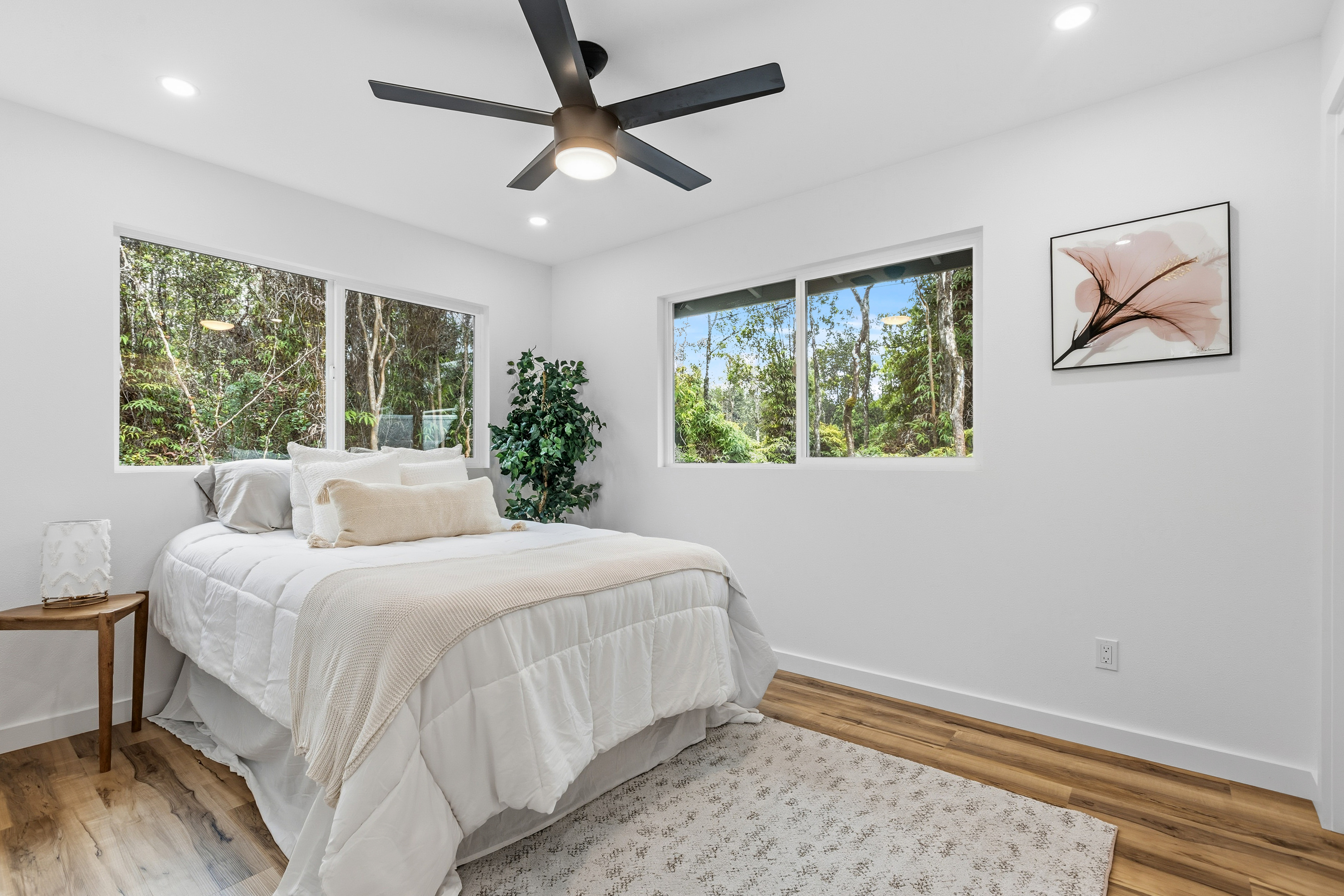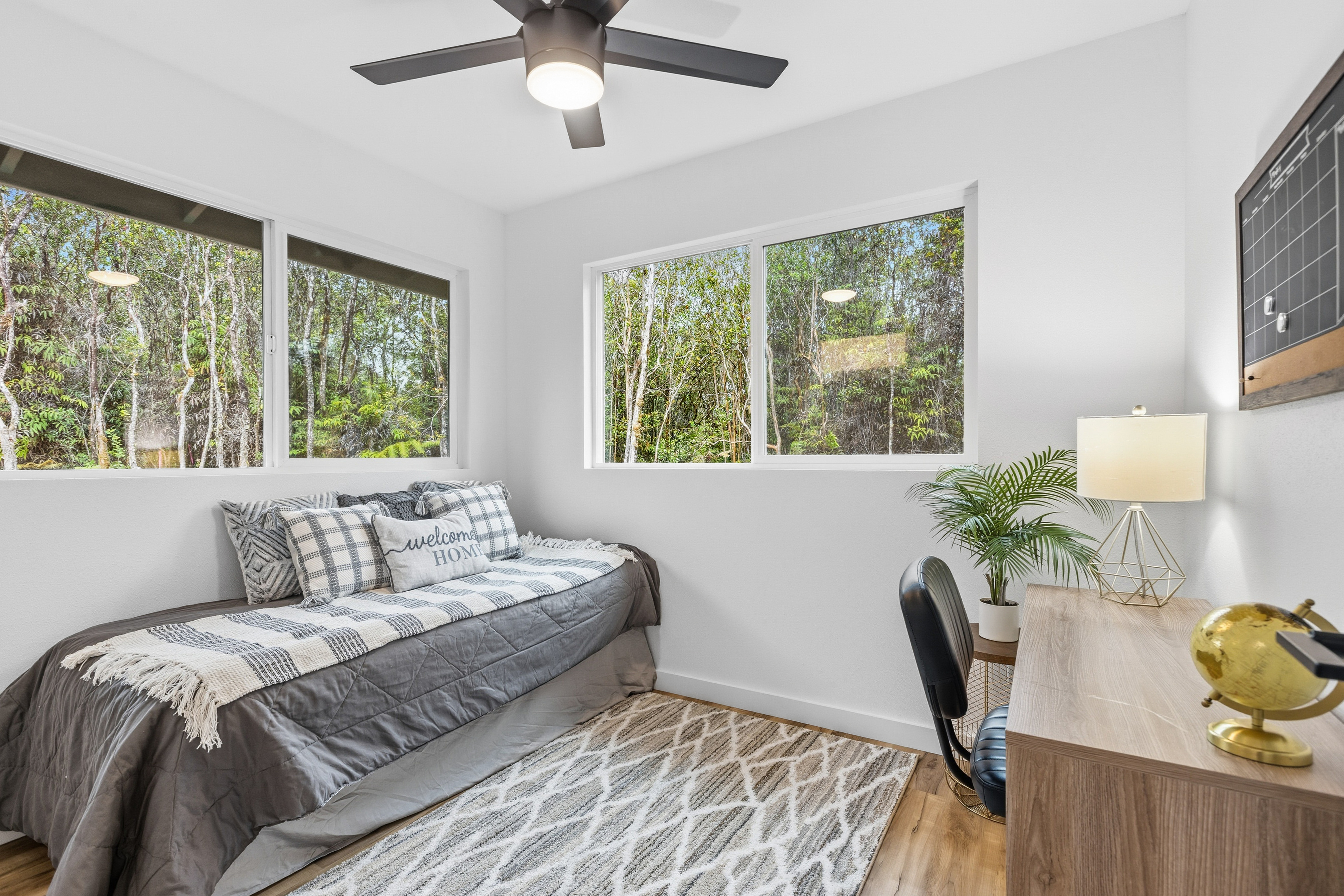 Brand new 2-bedroom, 1-bath residence located in the desirable Royal Hawaiian Estates, just minutes from Hawai?i Volcanoes National Park. This thoughtfully designed home showcases modern living with brand-new appliances, elegant quartzite countertops, and a stunning built-in electric fireplace that adds warmth and style. Nestled in a quiet, cozy neighborhood surrounded by native ?ohi?a forest, this property offers a peaceful retreat while remaining conveniently accessible. Enjoy the perfect blend of new construction, contemporary finishes, and the natural beauty of Hawai?i. A rare opportunity you won’t want to miss.