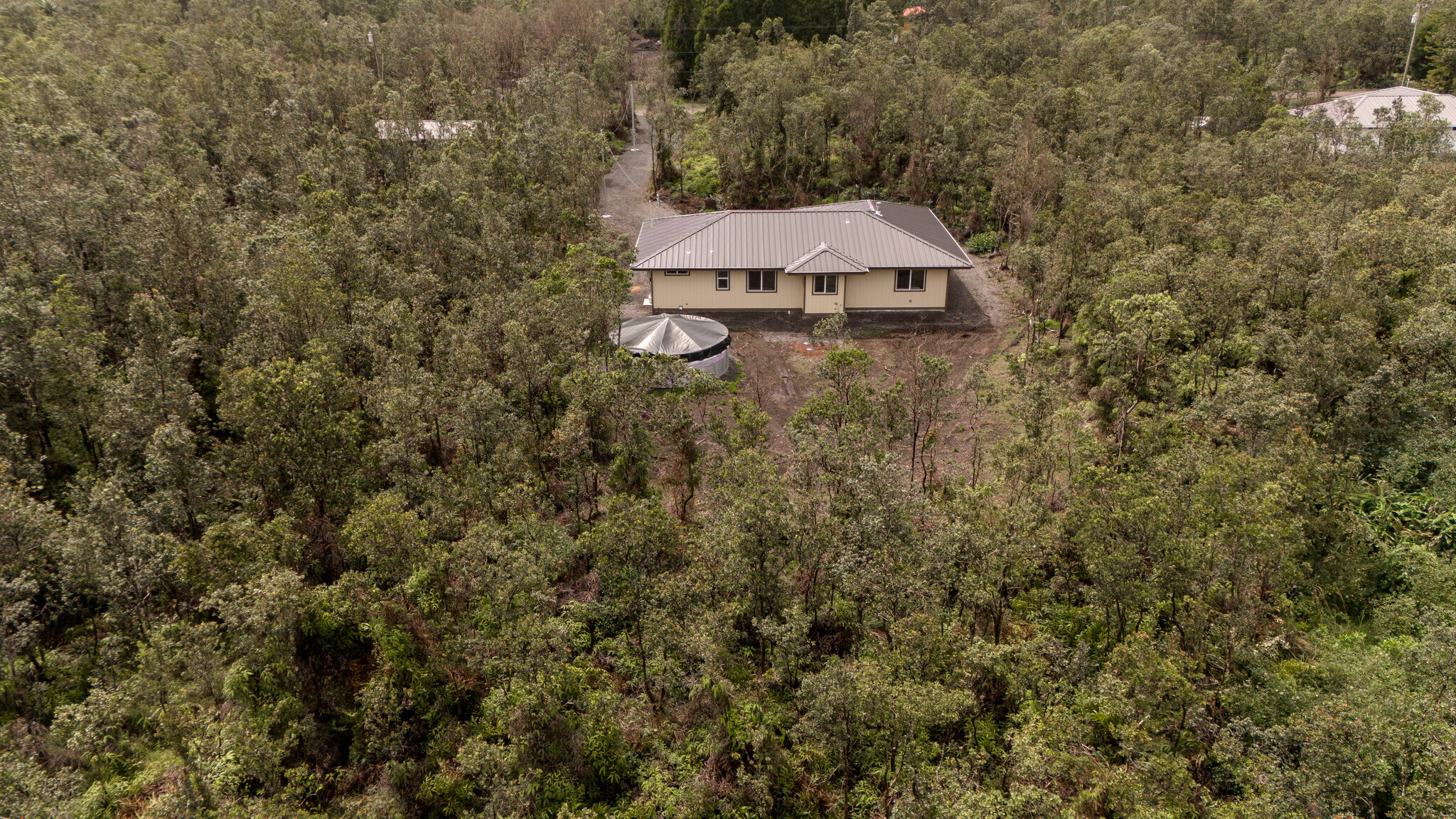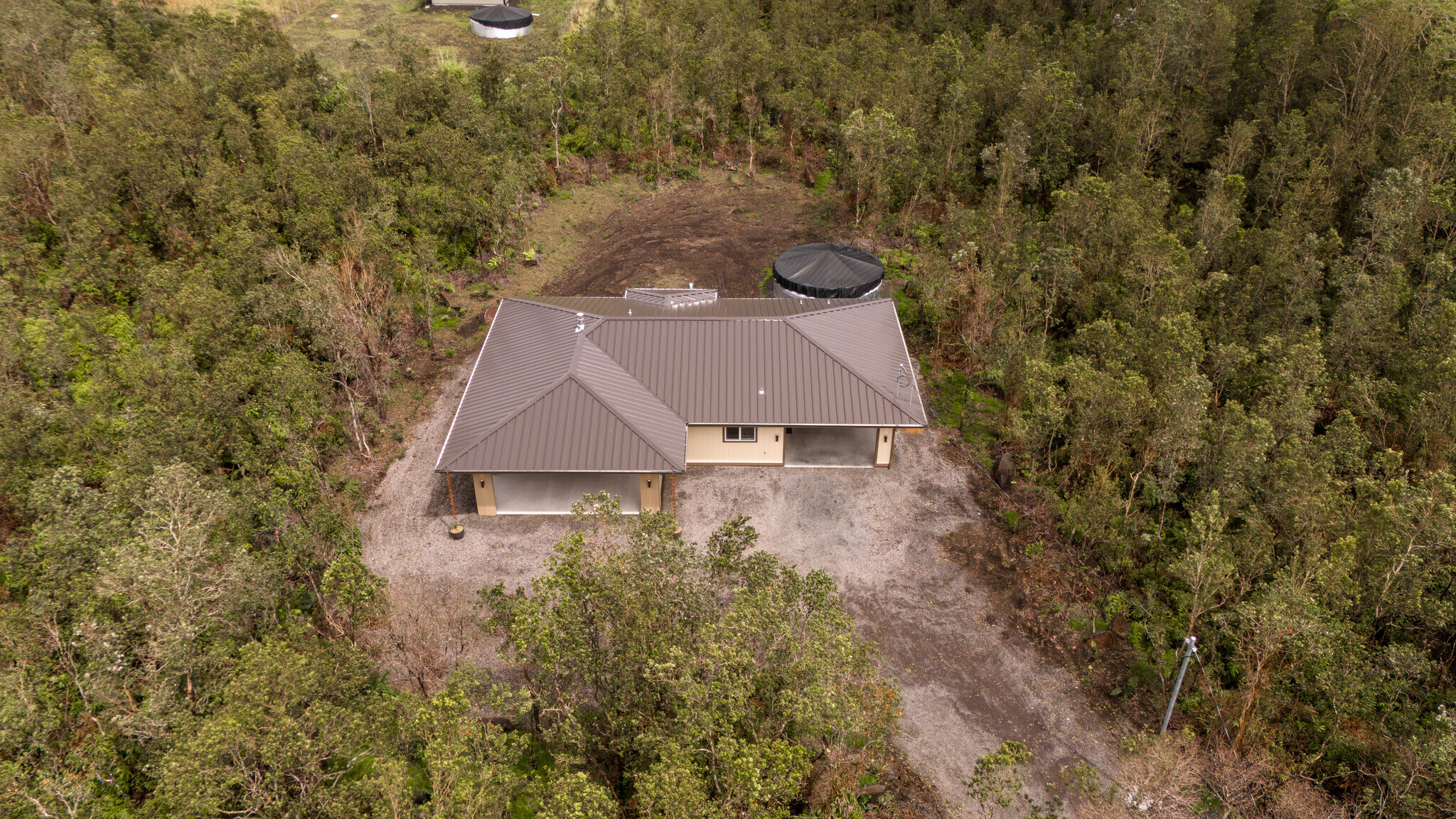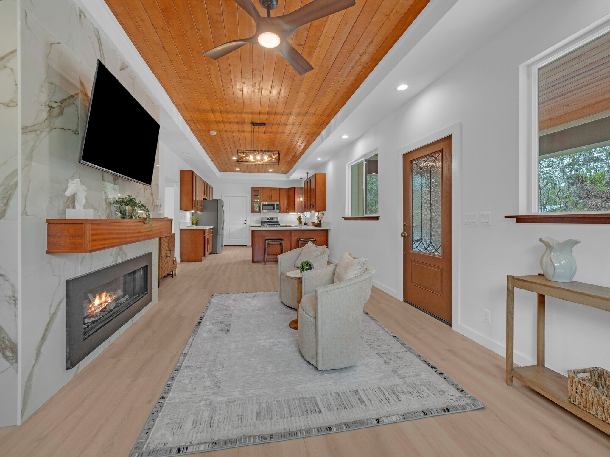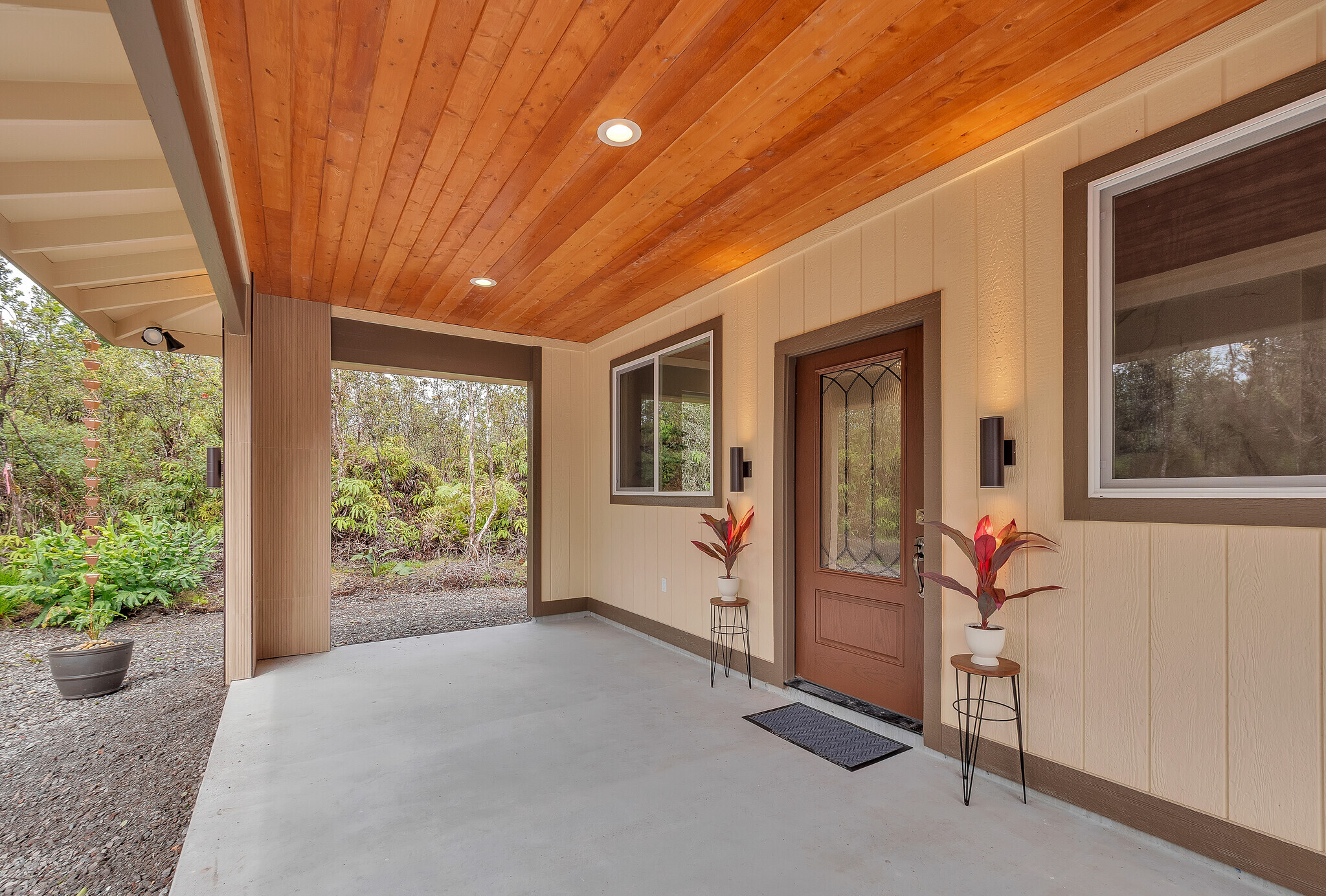 This thoughtfully crafted custom home is well suited to beautifully compliment the Volcano lifestyle. Enter into your home from the spacious private front lanai, featuring floor to ceiling tiled columns set behind rain chains for added ambiance. The living room has a large gas fireplace that will warm you up on cold rainy nights. Another great feature is the fireplace also heats the main bedroom through a split unit venting system. The living room, kitchen and both bedrooms feature beautiful 10 foot high tongue and groove wood ceilings. Use the other room for a home office, second bedroom or for guests visiting. The spa-like bathroom has a soaking tub with jets, surrounded by windows for natural lighting perfect for relaxing. This bathroom also has dual sinks, a full shower and a private toilet room. The kitchen has ample space with a peninsula quartz countertop for bar seating. The custom layout also has glass paned upper cabinets for added customization. Brand new appliances feature a gas stove, refrigerator, microwave & dishwasher. The home has a spacious carport for covered parking including an attached second bathroom that can be accessed from outside. The laundry room is also in the carport featuring a new washer and dryer and the water filtration system with an added UV light filter. Outside, the property has been thoughtfully cleared leaving some of the natural forest as well as beautiful rock features. Located in Volcano, you're less than 5 miles away from the world-renowned Hawaii Volcanoes National Park, offering endless opportunities for exploration and adventure. Property tax only reflects the land and will update to include the home.
