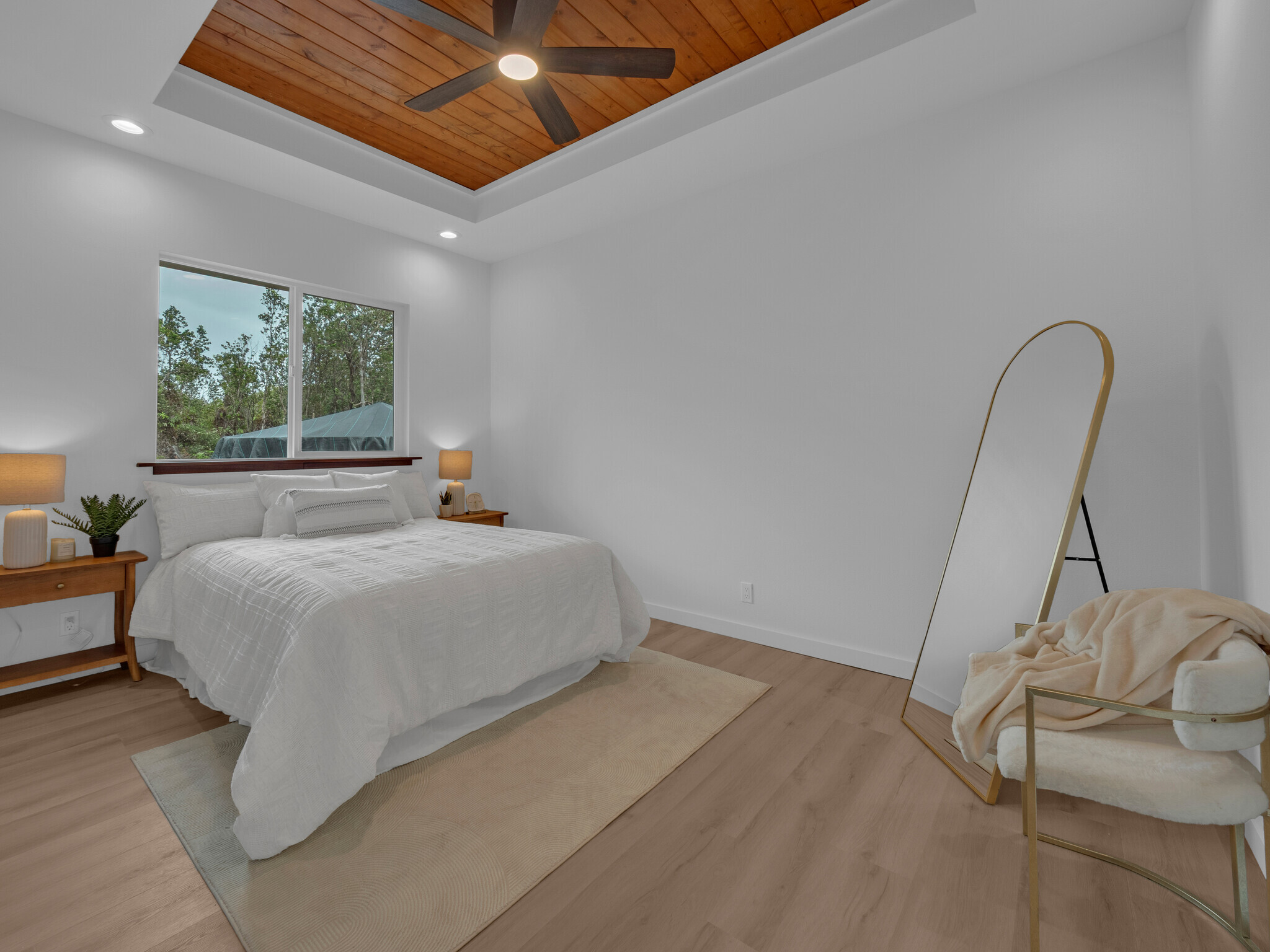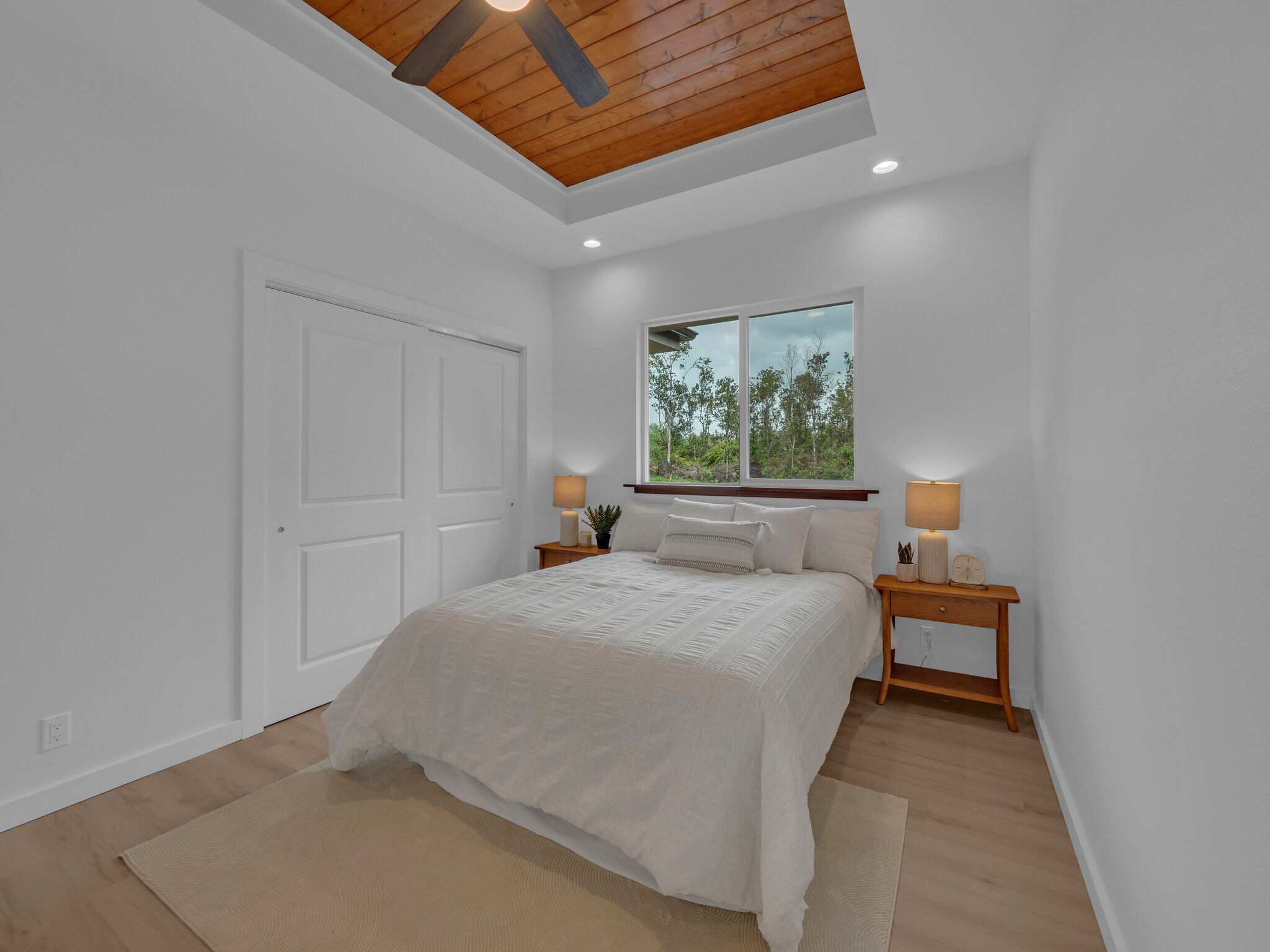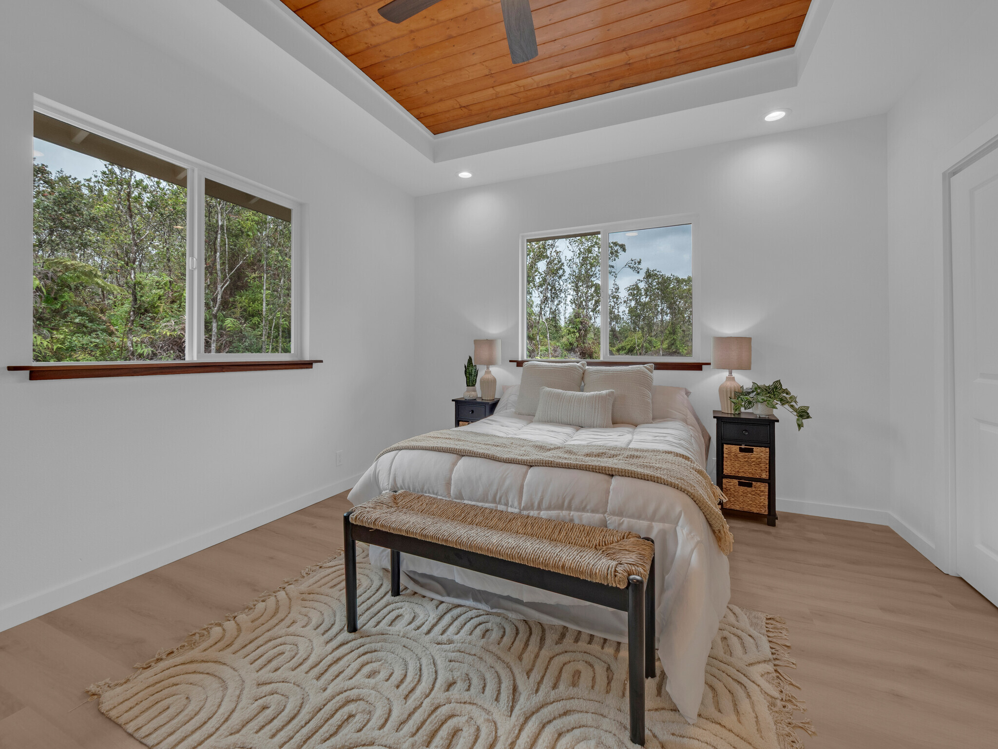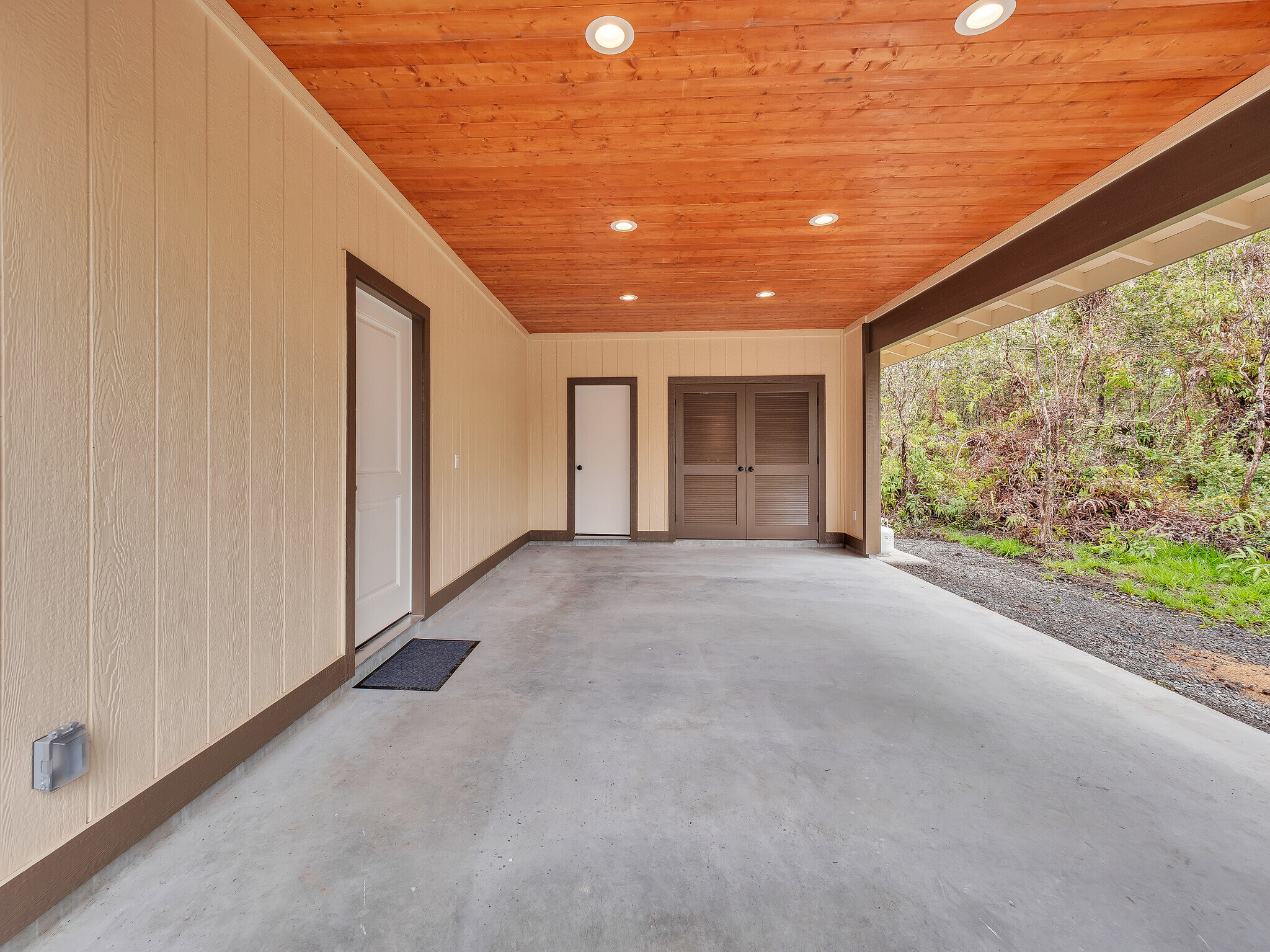 This thoughtfully crafted custom home is well suited to beautifully compliment the Volcano lifestyle. Enter into your home from the spacious private front lanai, featuring floor to ceiling tiled columns set behind rain chains for added ambiance. The living room has a large gas fireplace that will warm you up on cold rainy nights. Another great feature is the fireplace also heats the main bedroom through a split unit venting system. The living room, kitchen and both bedrooms feature beautiful 10 foot high tongue and groove wood ceilings. Use the other room for a home office, second bedroom or for guests visiting. The spa-like bathroom has a soaking tub with jets, surrounded by windows for natural lighting perfect for relaxing. This bathroom also has dual sinks, a full shower and a private toilet room. The kitchen has ample space with a peninsula quartz countertop for bar seating. The custom layout also has glass paned upper cabinets for added customization. Brand new appliances feature a gas stove, refrigerator, microwave & dishwasher. The home has a spacious carport for covered parking including an attached second bathroom that can be accessed from outside. The laundry room is also in the carport featuring a new washer and dryer and the water filtration system with an added UV light filter. Outside, the property has been thoughtfully cleared leaving some of the natural forest as well as beautiful rock features. Located in Volcano, you're less than 5 miles away from the world-renowned Hawaii Volcanoes National Park, offering endless opportunities for exploration and adventure. Property tax only reflects the land and will update to include the home.