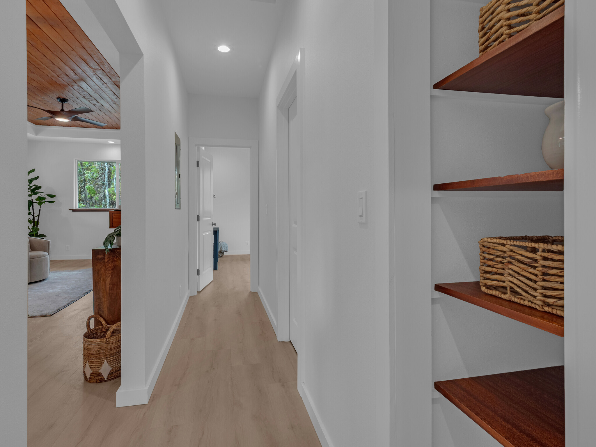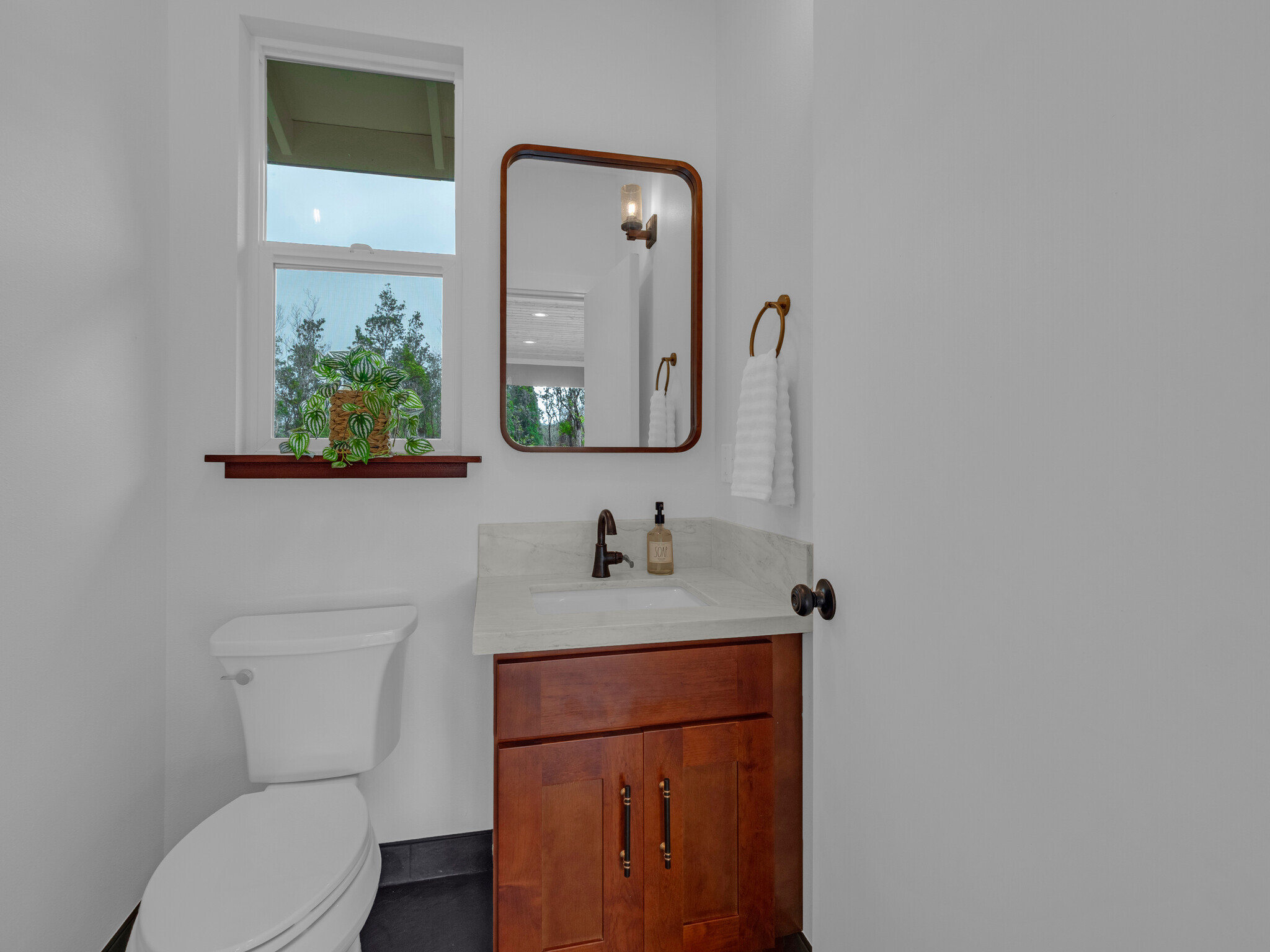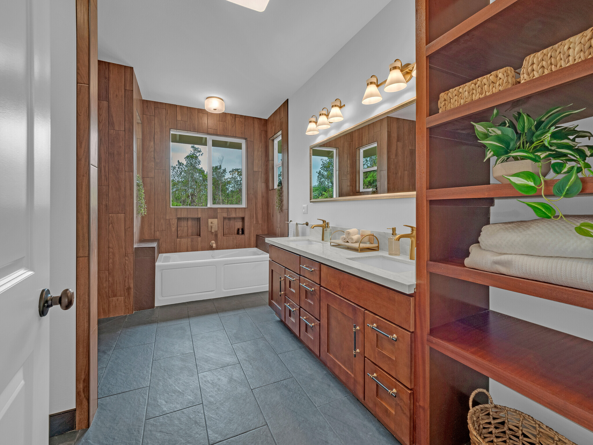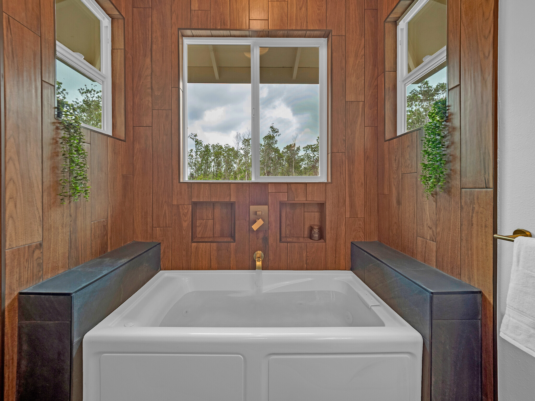 This thoughtfully crafted custom home is well suited to beautifully compliment the Volcano lifestyle. Enter into your home from the spacious private front lanai, featuring floor to ceiling tiled columns set behind rain chains for added ambiance. The living room has a large gas fireplace that will warm you up on cold rainy nights. Another great feature is the fireplace also heats the main bedroom through a split unit venting system. The living room, kitchen and both bedrooms feature beautiful 10 foot high tongue and groove wood ceilings. Use the other room for a home office, second bedroom or for guests visiting. The spa-like bathroom has a soaking tub with jets, surrounded by windows for natural lighting perfect for relaxing. This bathroom also has dual sinks, a full shower and a private toilet room. The kitchen has ample space with a peninsula quartz countertop for bar seating. The custom layout also has glass paned upper cabinets for added customization. Brand new appliances feature a gas stove, refrigerator, microwave & dishwasher. The home has a spacious carport for covered parking including an attached second bathroom that can be accessed from outside. The laundry room is also in the carport featuring a new washer and dryer and the water filtration system with an added UV light filter. Outside, the property has been thoughtfully cleared leaving some of the natural forest as well as beautiful rock features. Located in Volcano, you're less than 5 miles away from the world-renowned Hawaii Volcanoes National Park, offering endless opportunities for exploration and adventure. Property tax only reflects the land and will update to include the home.