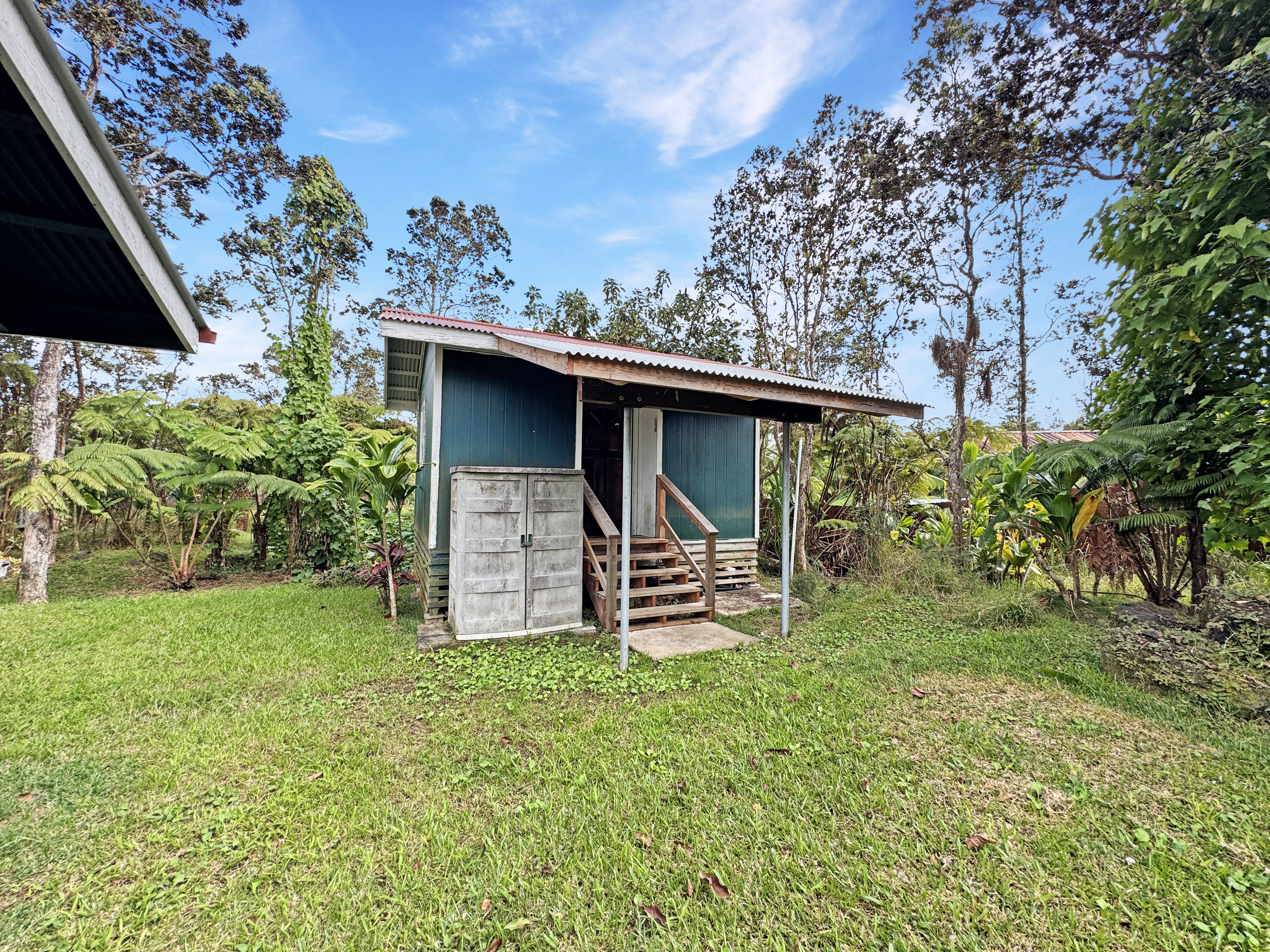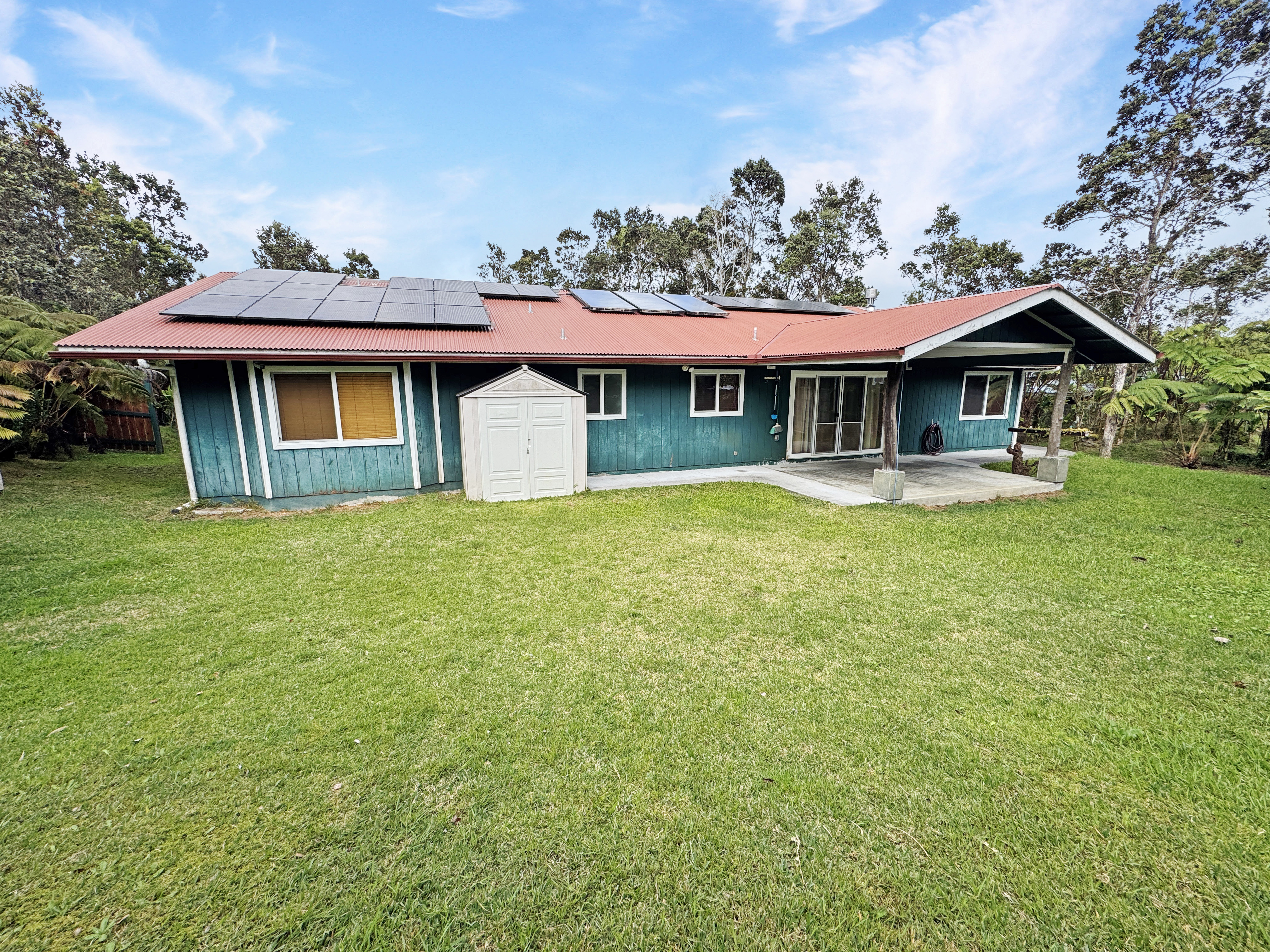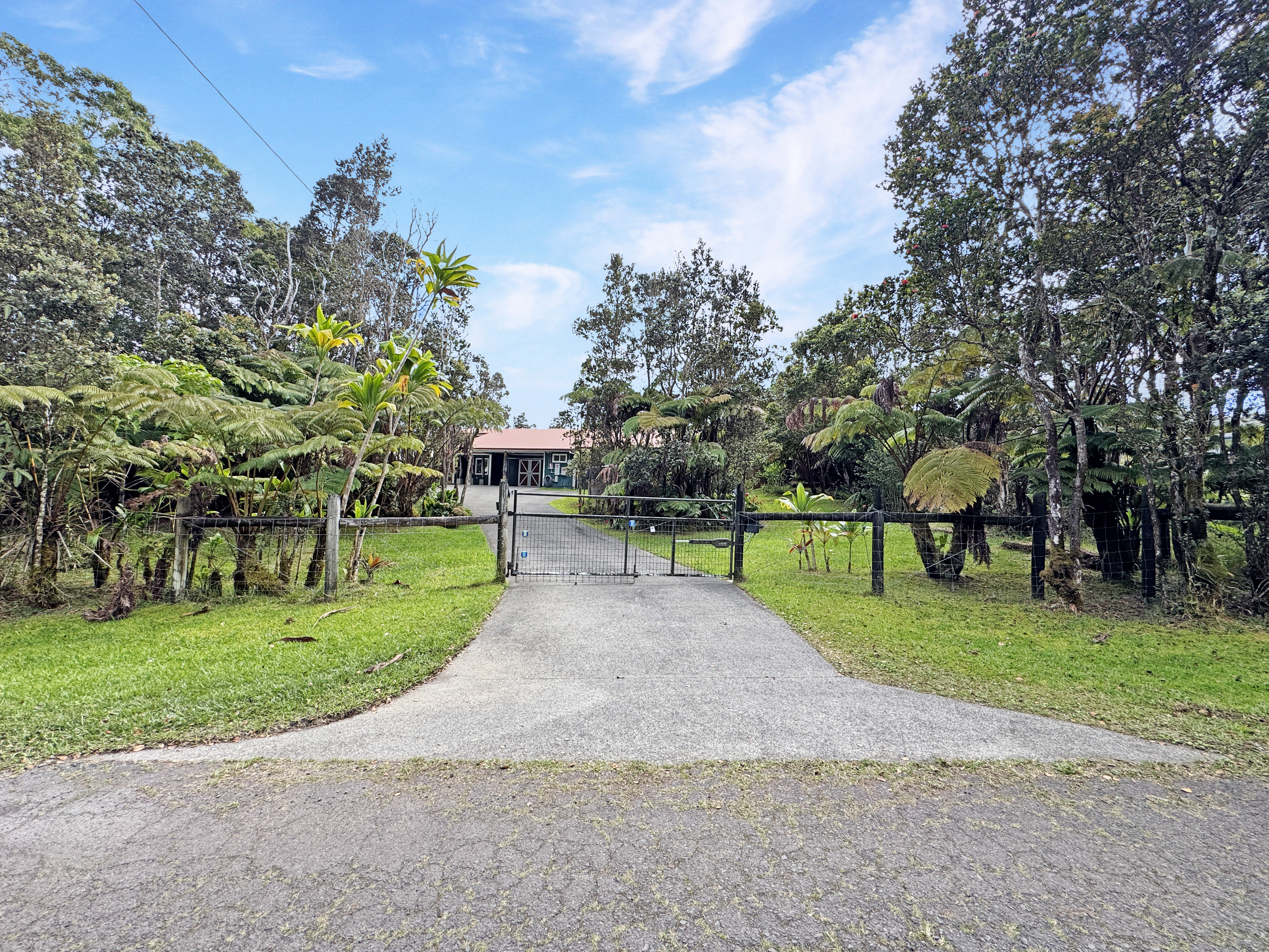 Nestled in the serene, cool rainforest of Royal Hawaiian Estates in Volcano, Hawaii, this charming custom-built 3-bedroom, 2-bathroom home offers the perfect blend of cozy comfort and modern sustainability on a spacious nearly 20,000 sq ft lot. Step inside to discover an inviting open-concept layout featuring a large living room warmed by a classic wood-burning fireplace–ideal for relaxing on misty Volcano evenings–and an expansive kitchen designed for gathering and entertaining. Rich mahogany cabinetry graces both the kitchen and bathrooms, adding warmth and elegance throughout. The generous master suite boasts a large bathroom and a spacious walk-in closet, while one of the additional bedrooms includes convenient pull-down stairs to an attic with abundant, easy-to-access storage space. Practical features include a UV water filtration system for pure, clean water, a robust 21-panel solar system to keep energy costs low in this off-grid-friendly paradise, and an installed alarm system for added peace of mind. Outside, the fully fenced property with an electric gate ensures privacy and security. The grounds are meticulously landscaped with lush native Hawaiian plants, including ?ohi?a trees, hapu'u fern, and a variety of other plants and trees. At the back, an enclosed but unfinished studio unit presents exciting potential as additional living space, a guest quarters, or a dedicated workshop. Just minutes from Hawaii Volcanoes National Park, Volcano Village amenities, and the cool, elevated climate that makes everyday living feel like a retreat–this custom home is a rare gem in one of the Big Island's most serene locations. Information herein deemed reliable but not guaranteed. Buyer and buyers agent to do their own due diligence on all pertinent facts.