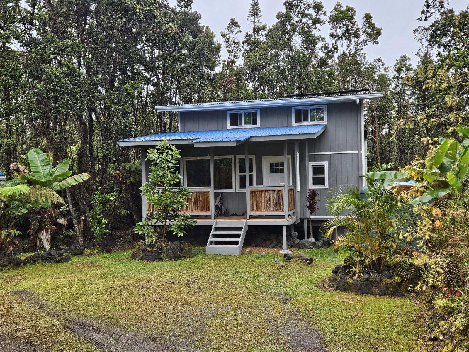 Discover this newly renovated off-grid gem in the secluded Royal Hawaiian Estates, offering 1010 SQFT of living space. This charming 1 bedroom, 1 bathroom, plus large upstairs loft non-permitted cottage presents a unique opportunity for sustainable living. Equipped with a composting toilet, it embraces eco-friendly practices. Tesla solar panels ensure a steady supply of renewable energy, while a rainwater catchment system provides an independent, sustainable water source. The property also includes a water filtration system for purified tap water. Nestled on nearly half an acre, you'll find avocado trees, banana groves, Ohia trees, and more. Located just 7 minutes from Volcano National Park, this elevated spot offers cool, comfortable temperatures. Additional features include a 12x8 shed and an outdoor hot water shower. Experience the perfect balance of sustainability and comfort in this off-grid paradise. Front lot TMK 3-1-1-15-87 is available for purchase for $32,000 only with the purchase of this flag lot TMK 3-1-1-15-88.