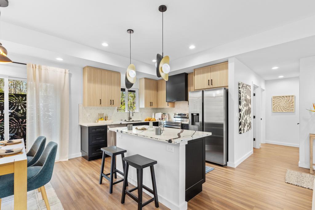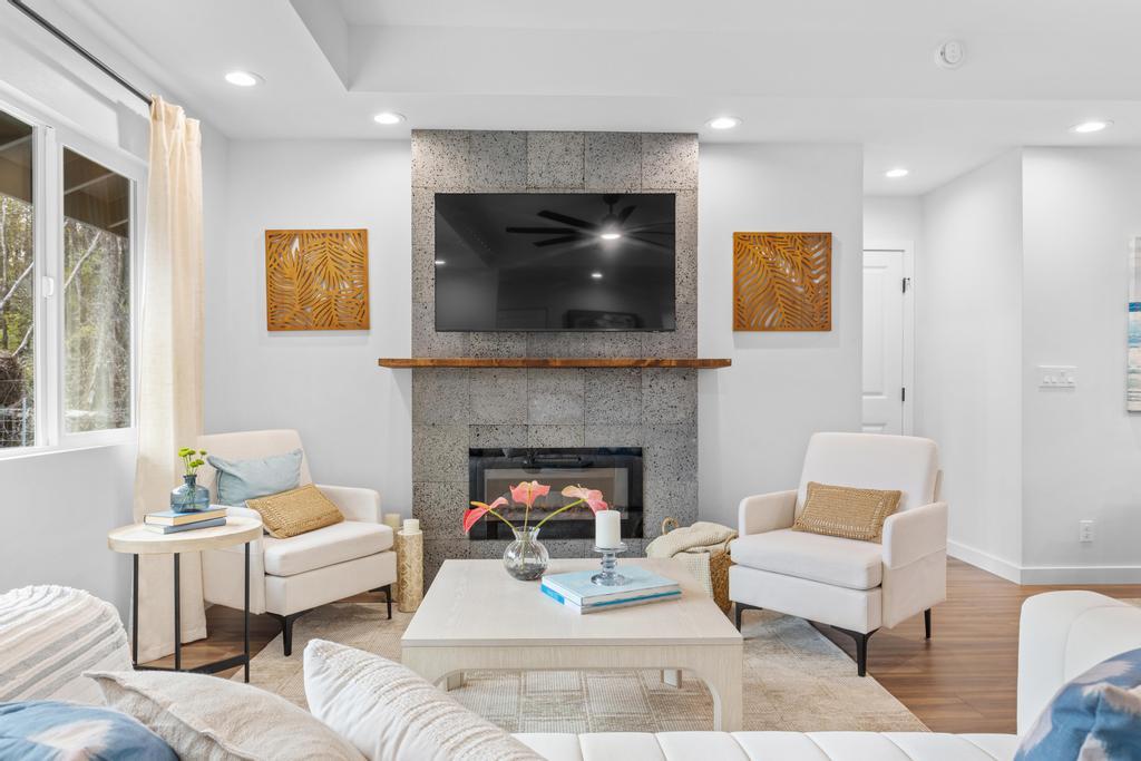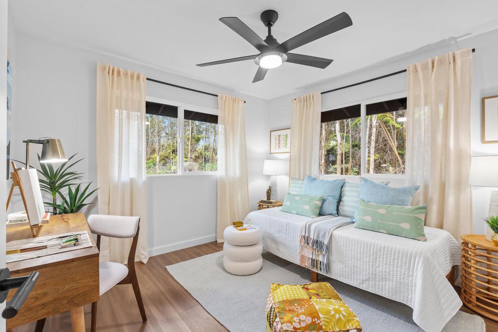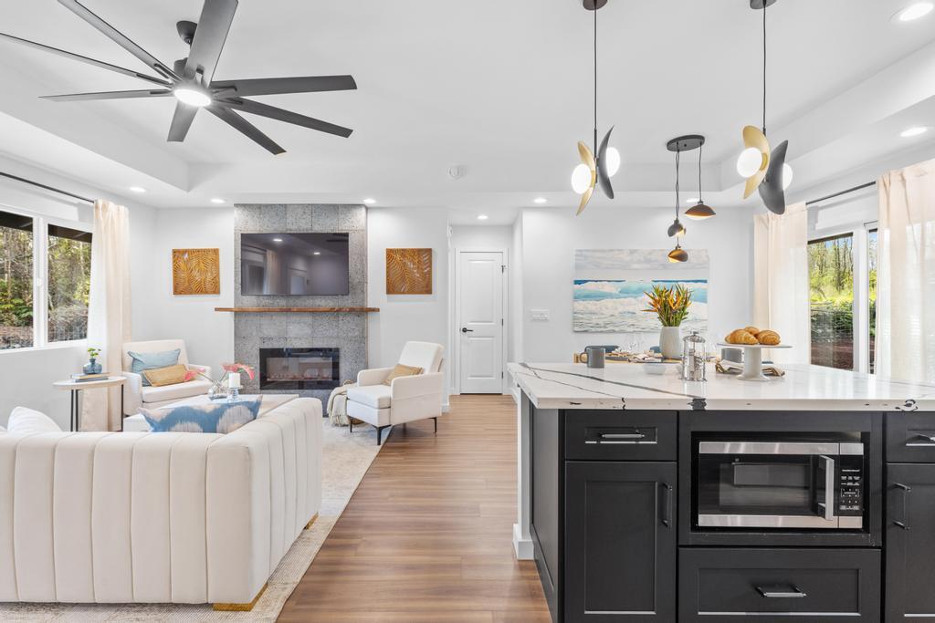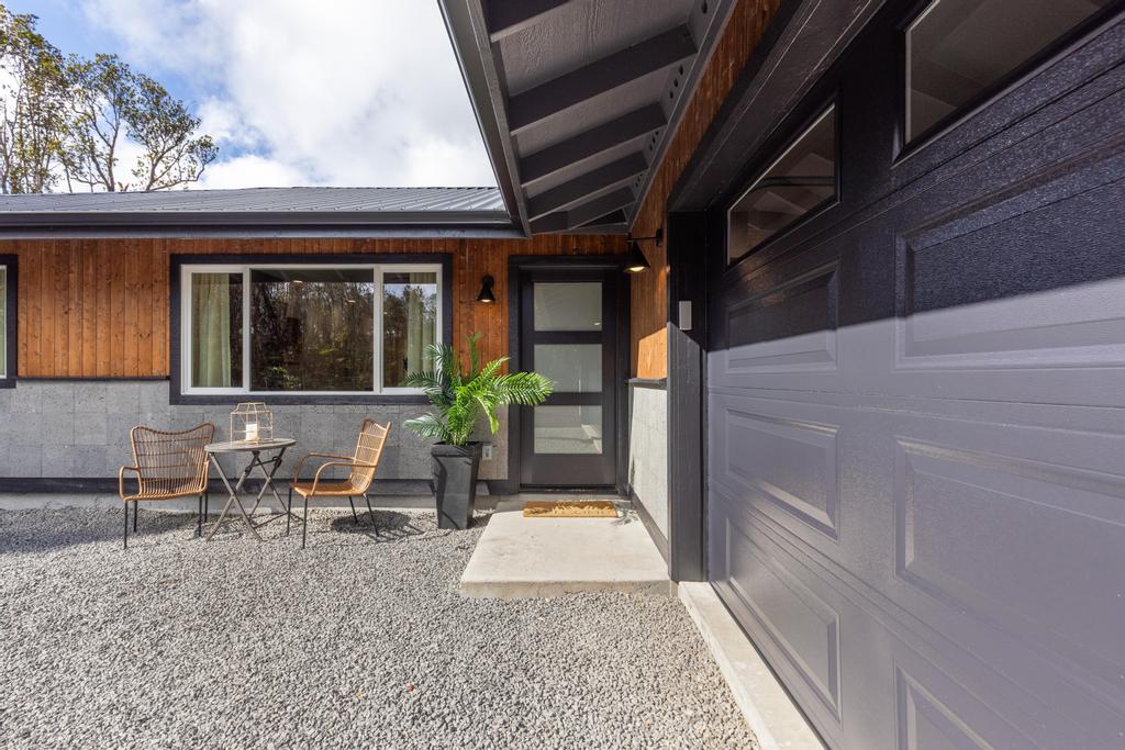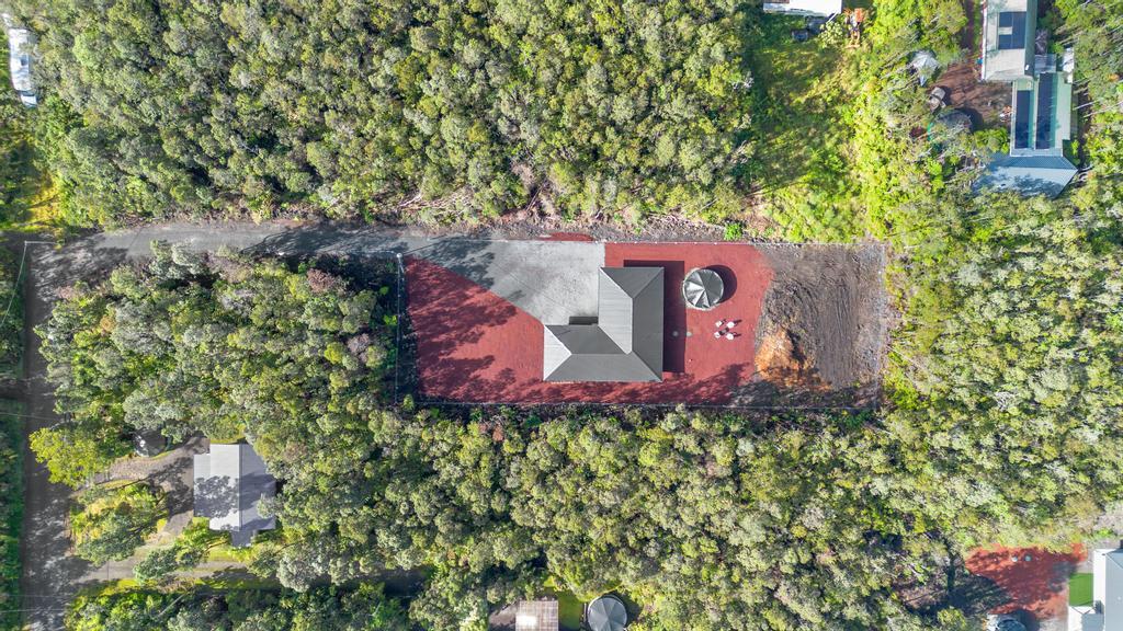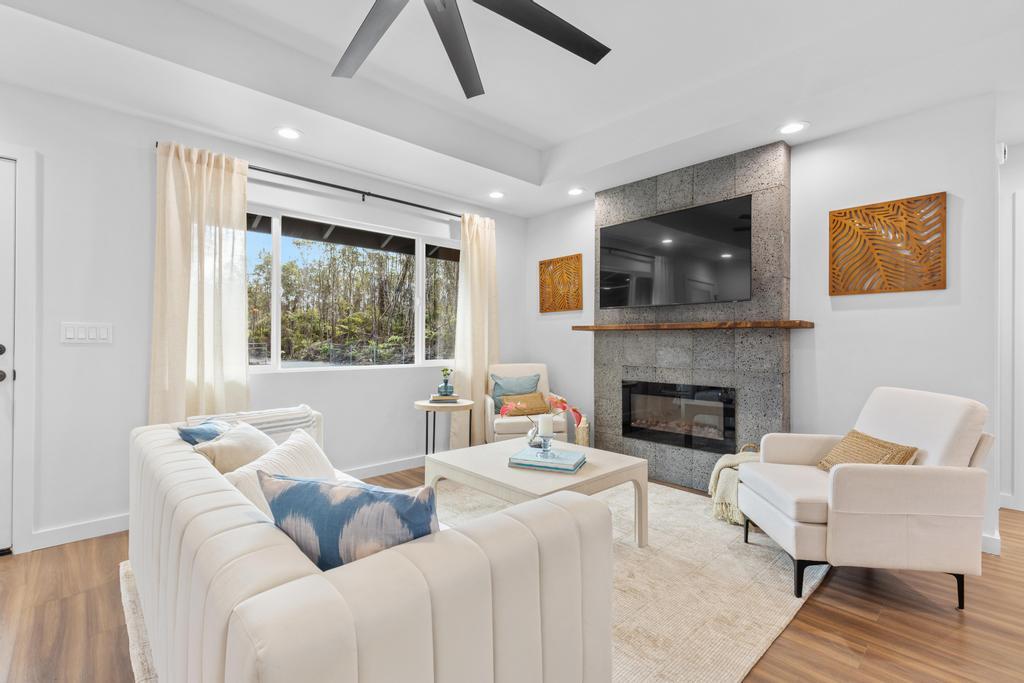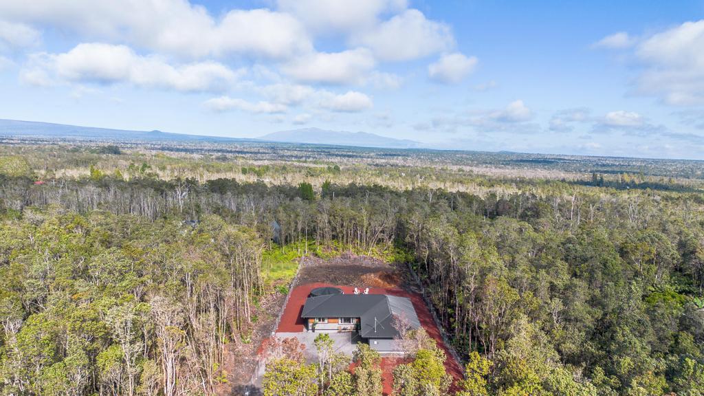 Welcome to this beautifully crafted custom 3-bedroom, 2-bath residence located in the fast-growing Royal Hawaiian Estates subdivision of Volcano. Designed with quality and comfort in mind, this luxury build offers an open-concept living area highlighted by a striking stone electric fireplace, adding both warmth and architectural interest. The home features upgraded fixtures, modern lighting, custom cabinetry, and tasteful finishes throughout, creating a cohesive and elevated interior aesthetic. A desirable split-floor plan enhances privacy, with the primary suite offering a walk-in closet and a well-appointed en-suite bath showcasing custom tile work and designer vessel sinks. Two additional bedrooms provide flexibility for guests, a home office, or creative space, while the second bathroom reflects the same attention to craftsmanship and detail. An enclosed two-car garage with a dedicated laundry room provides secure parking, storage, and everyday convenience. The fully fenced property is ideally situated at the end of a quiet dead-end street on Ala ?Oki Place, offering enhanced privacy and a peaceful setting. The lot remains a blank canvas–perfect for creating a personalized outdoor oasis, whether a landscaped garden, entertaining area, or serene Volcano retreat. Set in a community known for its cooler climate and lush natural surroundings, yet conveniently close to local amenities, this custom home delivers refined island living with excellent future potential in one of Volcano’s most desirable and growing neighborhoods. click on the video icon or copy and paste https://show.tours/v/MV3DF29