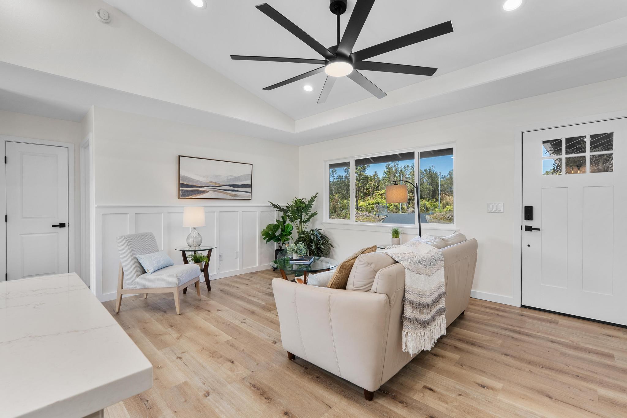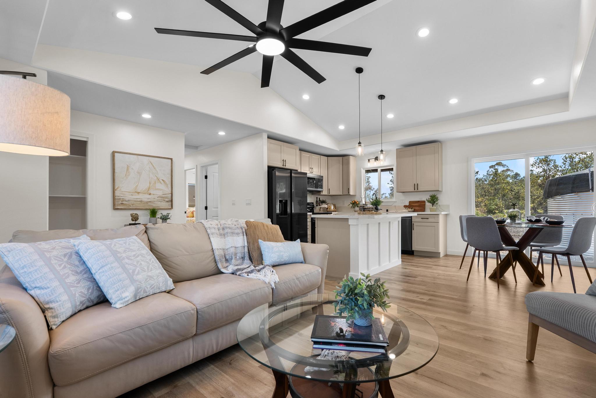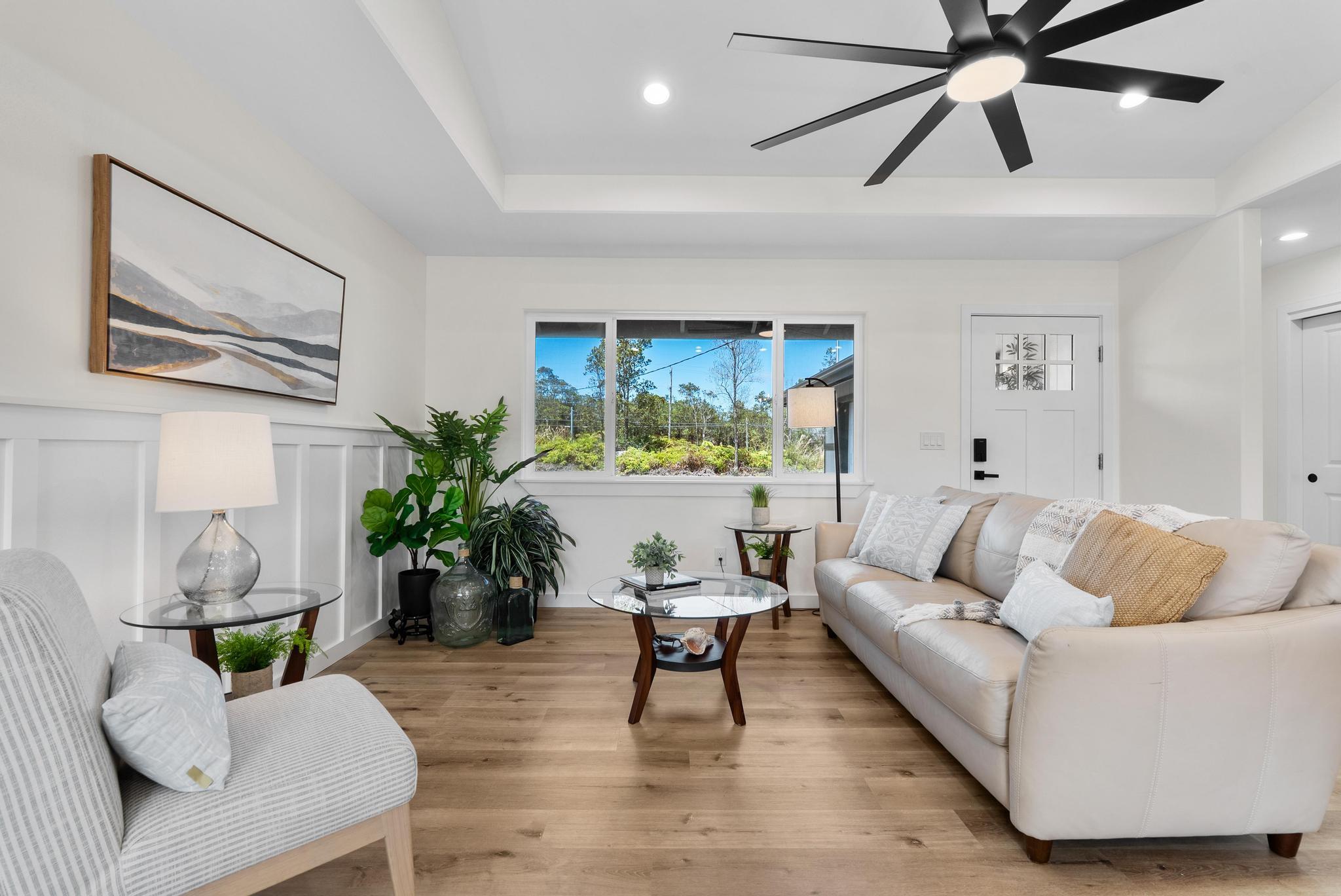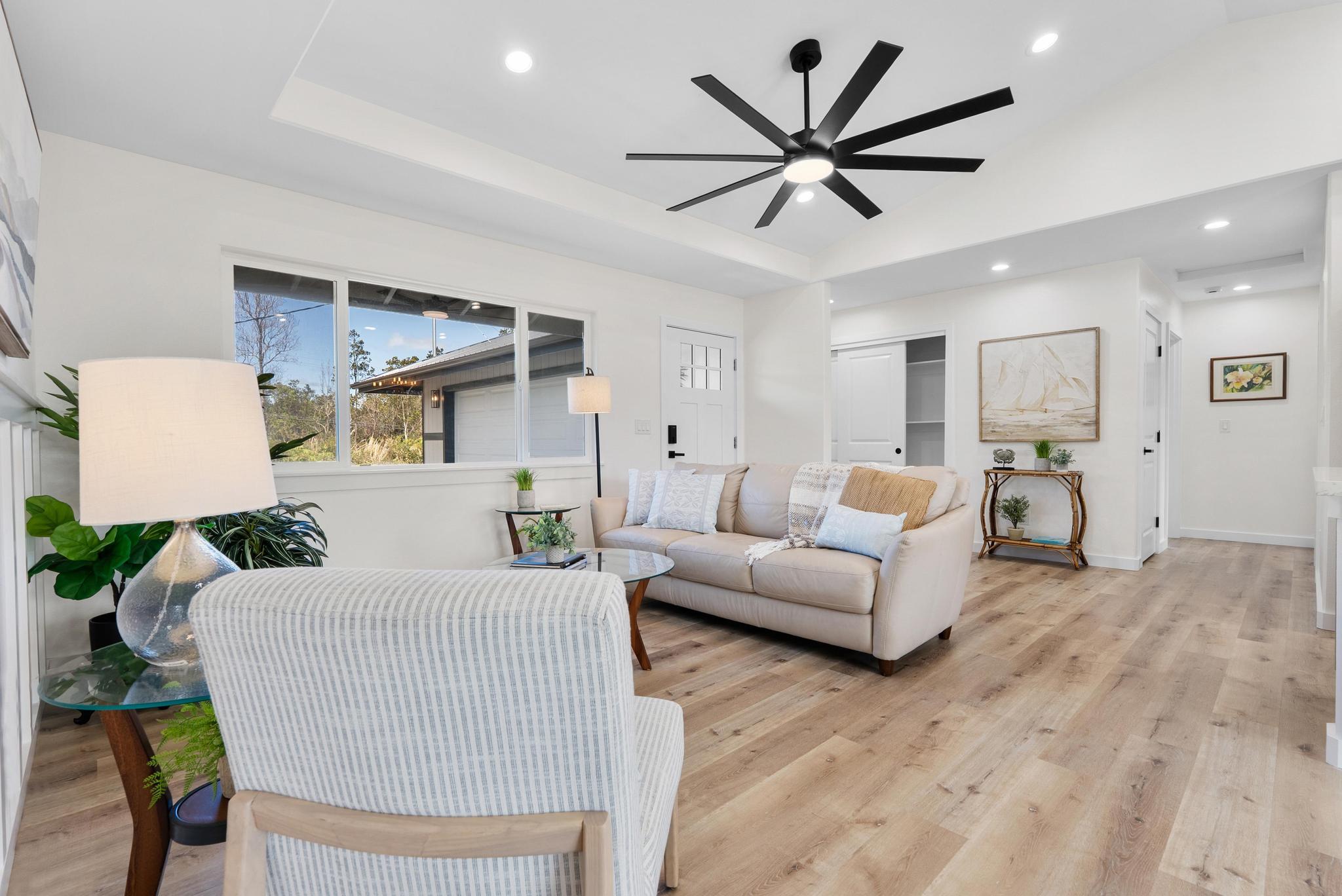 Tucked within the peaceful Royal Hawaiian Estates subdivision, this Volcano home combines comfort, privacy, and the kind of quality that stands out. Set on a generous 24,459 sq ft lot, the property sits privately at the back of a flag lot with a newly paved full-length asphalt driveway stretching from the road all the way to an enclosed 2 car garage a truly unique feature in this neighborhood. Step inside and you’ll find a warm, inviting layout designed for easy living. The split floor plan provides space and privacy, while the primary suite offers a large walk-in closet and spacious bathroom. Raised ceilings open the bedrooms, adding light and airiness to match Volcanos cool, peaceful setting. Located in desirable Lava Zone 3, this home offers peace of mind while keeping you close to the heart of Volcano Village. Just minutes away are local favorites like Kilauea Lodge, Thai Thai Bistro & Bar, and other local eateries, plus the convenience of True Value General Store for everyday essentials. Close to the main road yet tucked just far enough for privacy, this home perfectly blends upcountry charm with modern comfort topped off by a driveway that truly makes a statement.