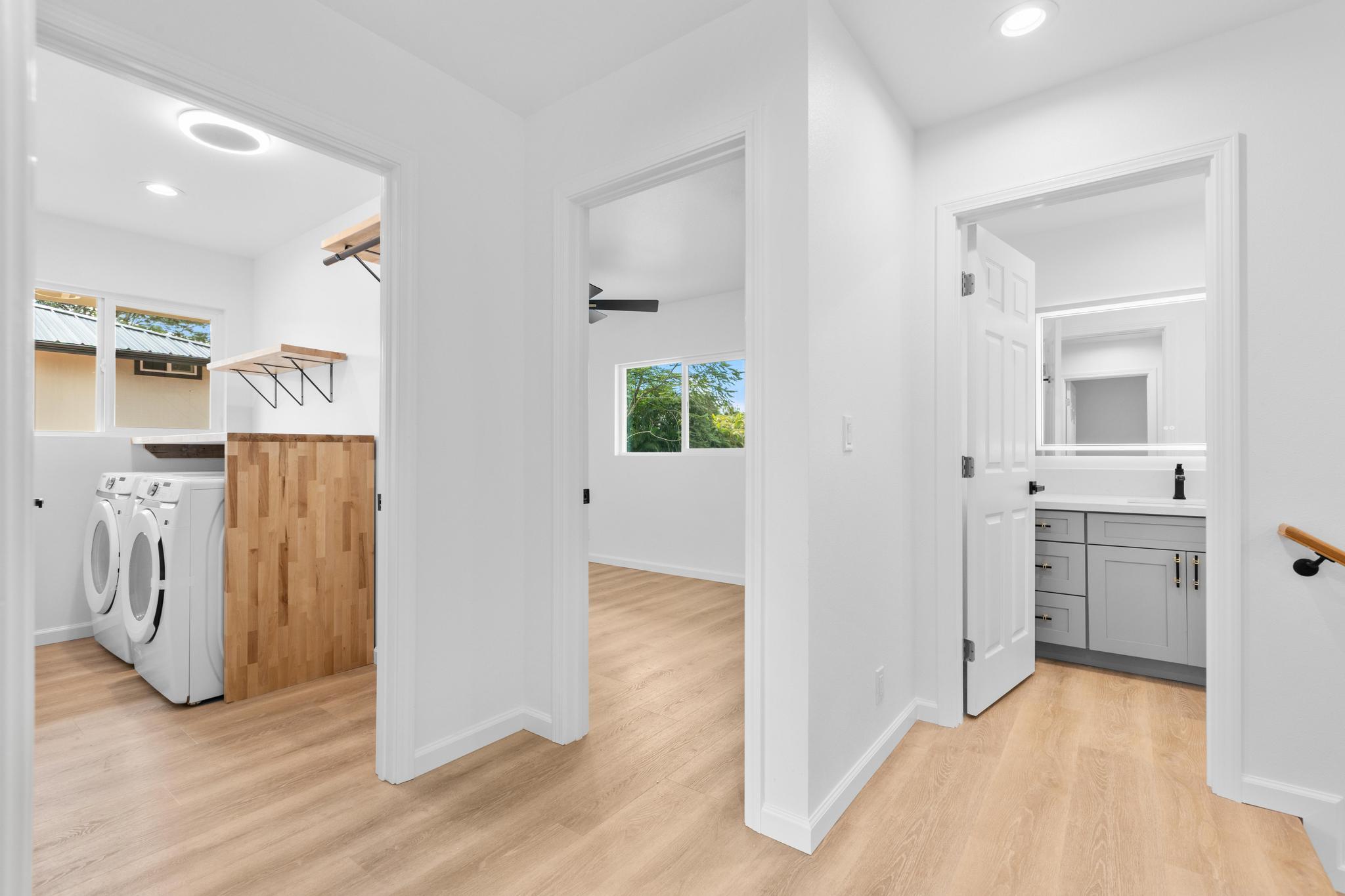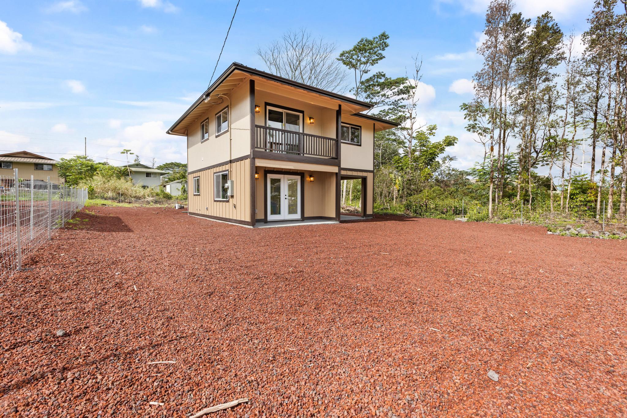 Welcome to Tiki Gardens Subdivision! Conveniently located just across from Ainaloa along the main boulevard, this area is quickly becoming one of Puna’s most desirable communities for new construction and potential for future appreciation. This brand new two story home combines smart design with big value, offering an excellent opportunity for those ready to transition from renting to owning, those seeking a first home or even a savvy investor. With thoughtful planning and efficient use of space, this 3 bedroom, 2 bath home provides modern living at an attainable price point the perfect entry into homeownership on the Big Island. Built up, not out, this home was designed with purpose to maximize comfort on a fully fenced and gated 8,100 sqft. lot. Upstairs hosts all three bedrooms, creating separation from the main living area and allowing for privacy, functionality, and a great lifestyle flow. The upper level bathroom features a large vanity and walk-in shower, while the spacious bedrooms make for comfortable for family and guests. Downstairs, the open-concept kitchen shines with beautiful cabinetry, durable quartz countertops, and a touch of island charm. The adjoining living and dining areas offer natural light and airflow, along with a second bathroom featuring a tub-and-shower combo and generous vanity. A convenient under-stair closet adds extra storage or creative potential. The carport is compact yet practical, offering functionality today with room to expand or enclose in the future. With over 1,200 sq. ft. of interior living area, this home offers low-maintenance living and flexibility for the future. Tiki Gardens offers easy access to shopping, dining, and schools, and is just a 20-minute drive to Hilo. Neighboring communities like Ainaloa and Hawaiian Paradise Park have already experienced growth making this home an excellent opportunity to start building equity through ownership in a growing subdivision. Reasonably priced, functional.