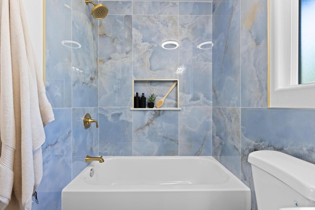 The bathroom is finished with beautiful porcelain tile, adding a touch of spa-like luxury. Each bedroom is designed with comfort in mind, offering peaceful spaces to unwind.