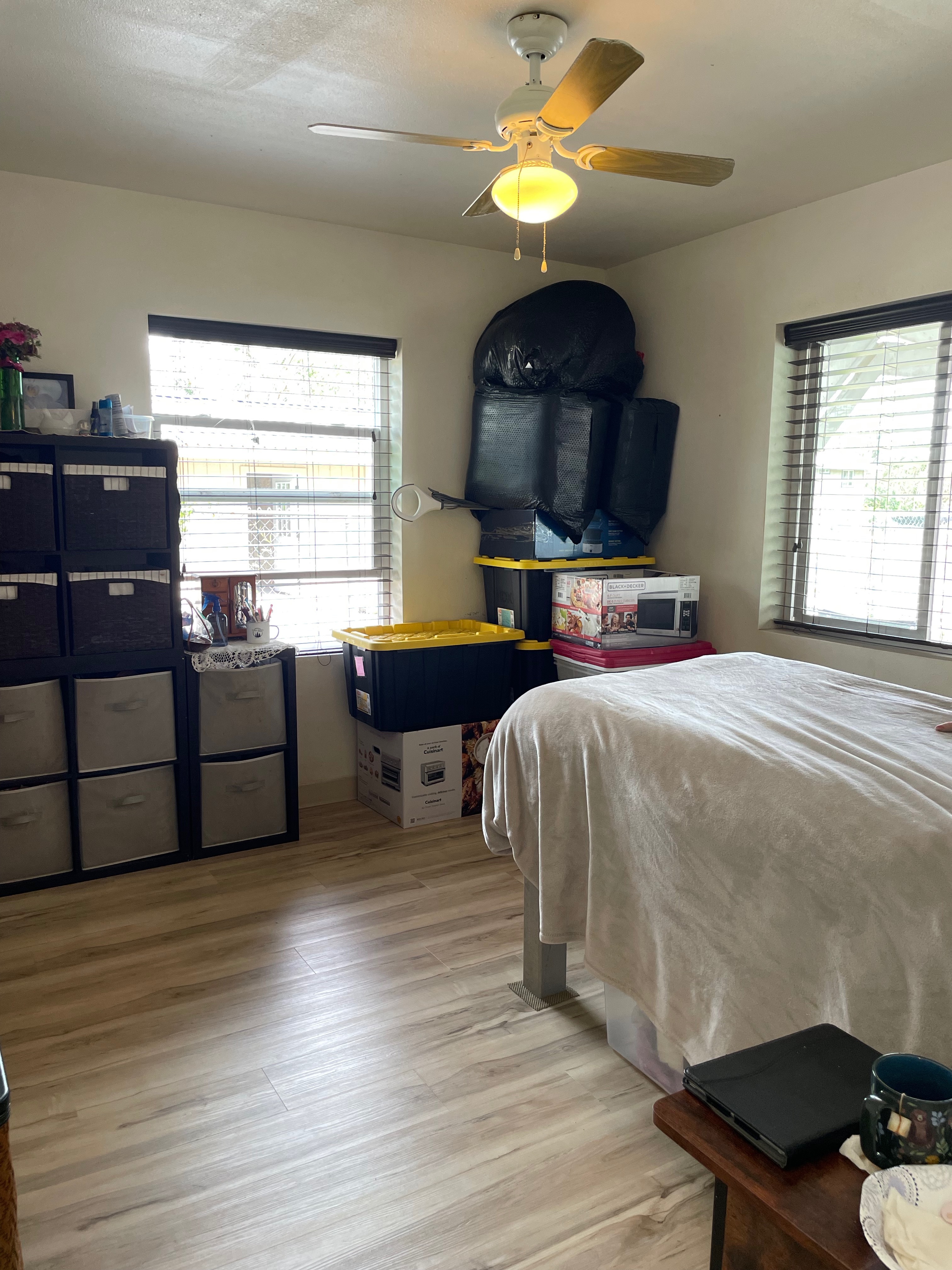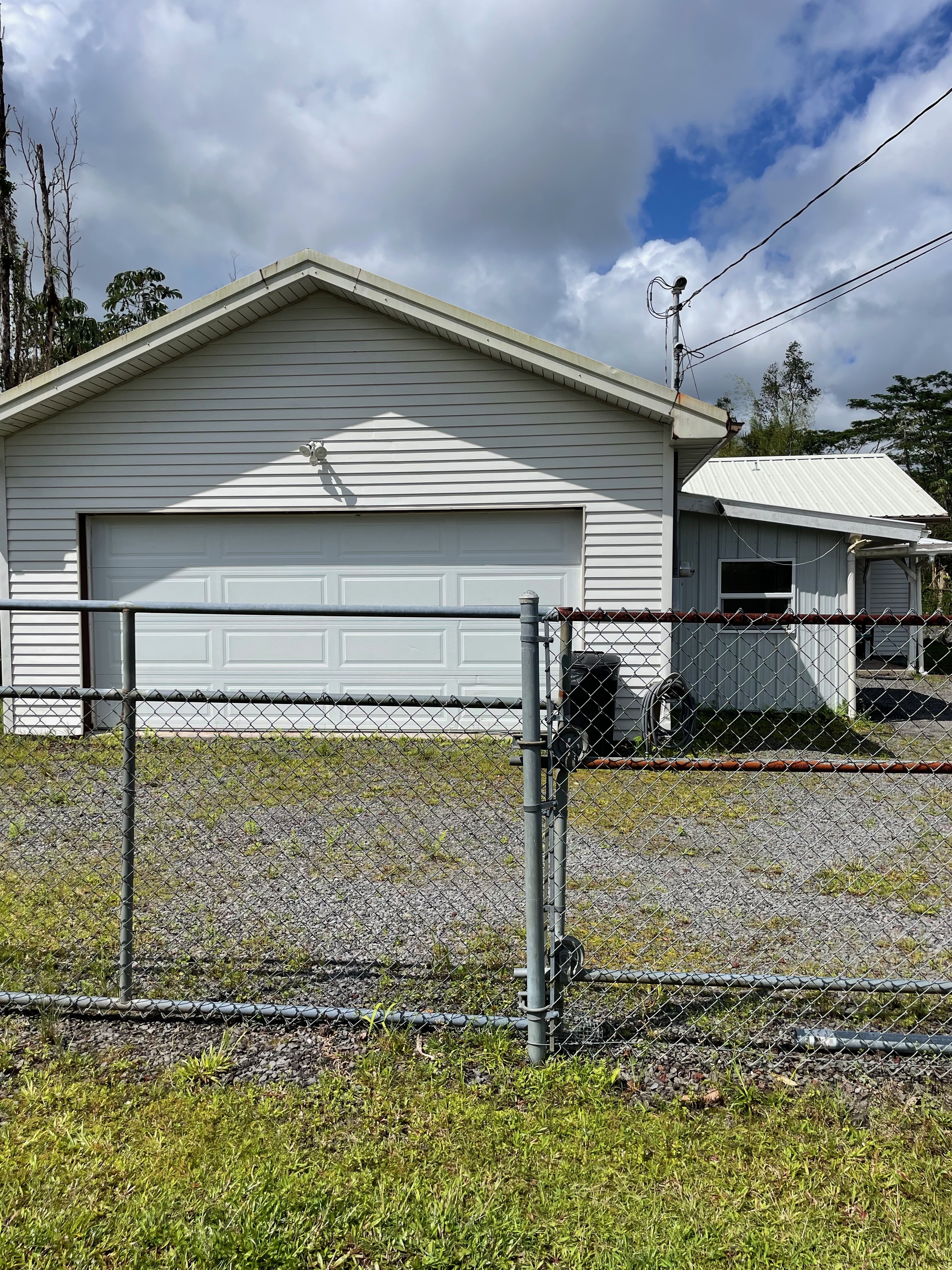 Charming, exceptionally well maintained home in the Tiki Gardens subdivision. Conveniently located close to Ainaloa Blvd. which provides quick access in and out of the community. This home was built to last with steel stud framing! Open floor plan features a split bedroom design with two large bedrooms and two spacious bathrooms. Adjacent to the kitchen is the laundry area which includes a an extra large pantry area. A smaller, bonus room, also adjacent to the kitchen, is perfect for a home office, extra storage or hobby room. Property is fully fenced and includes a small storage building in the backyard. Large, screened lanai off the back of the home faces the west, perfect for enjoying evening sunsets. The detached garage is over 600 sq. ft. with a large full bathroom and storage area. Home sits back from the road, behind the garage, providing maximum privacy. Ideal as an investment opportunity or first time home buyer!
