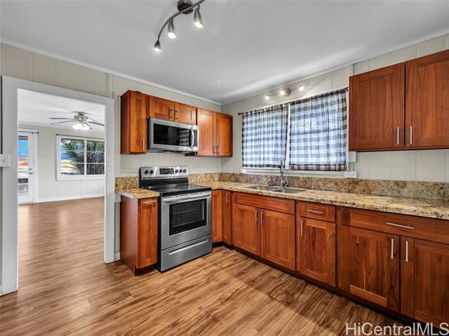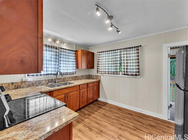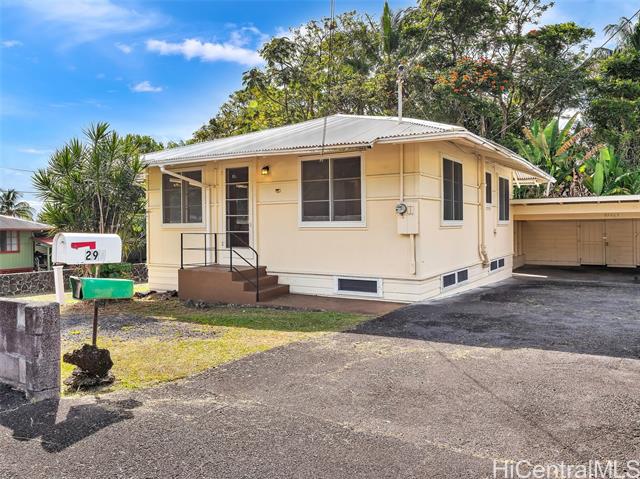 Discover your dream home in the heart of Hilo town. This charming residence features 2 bedrooms and 2 bathrooms, perfectly designed for comfort and convenience. Nestled on a large, level perimeter lot, the property offers ample outdoor space for relaxation or creative landscaping. A carport with a storage workshop adds functionality, making it easy to keep your tools and equipment organized. Step inside to experience the inviting open floor plan, where natural light fills the space, highlighting the beautiful vinyl plank flooring throughout. The kitchen boasts stainless steel appliances and elegant granite countertops, The large built-out basement, complete with a full bath and laundry area, provides additional versatility, perfect for a home office, gym, or entertainment space. Centrally located near Hilo town and the University of Hawaii, this home combines convenience with charm. First showing availability after October 11th.