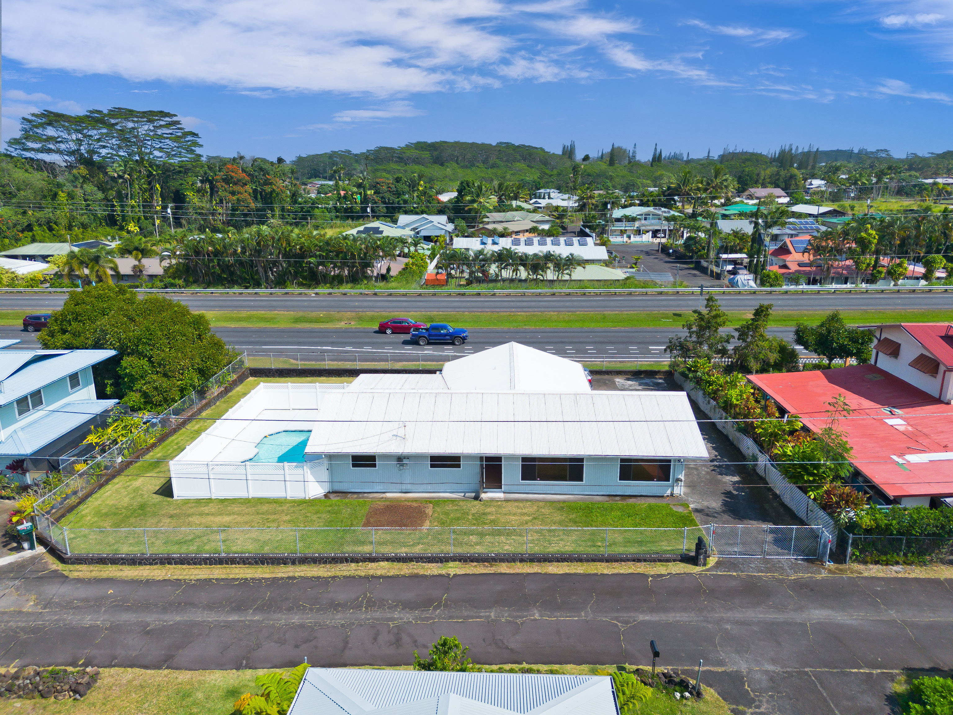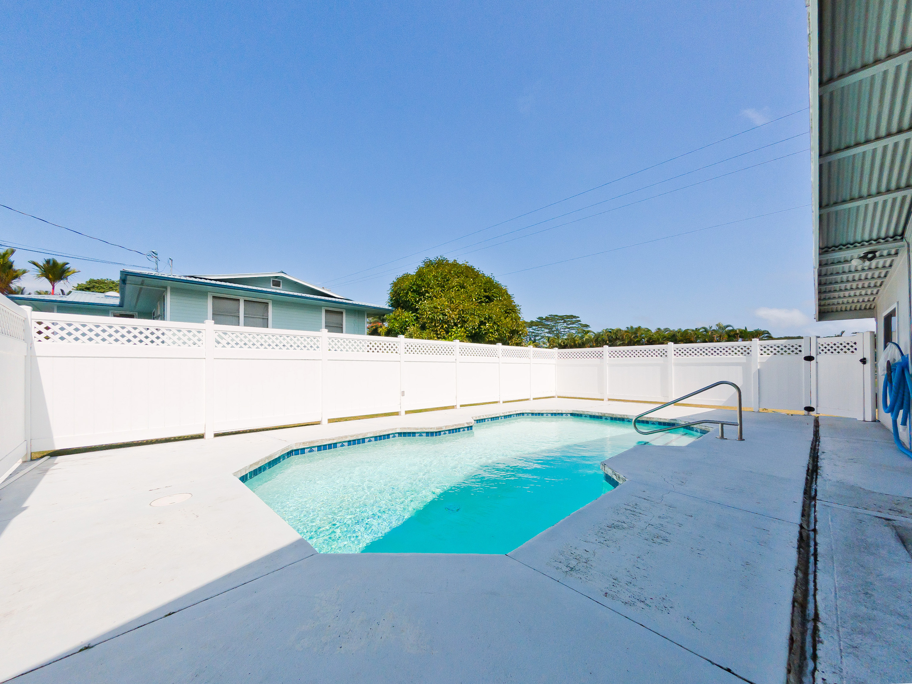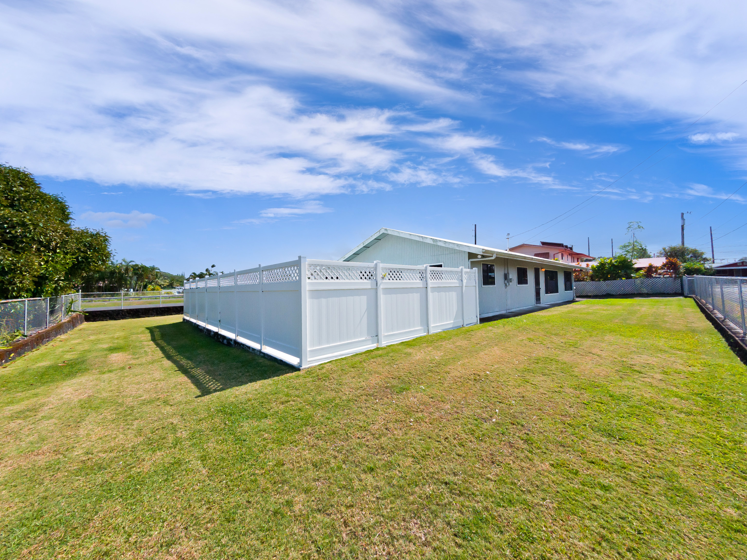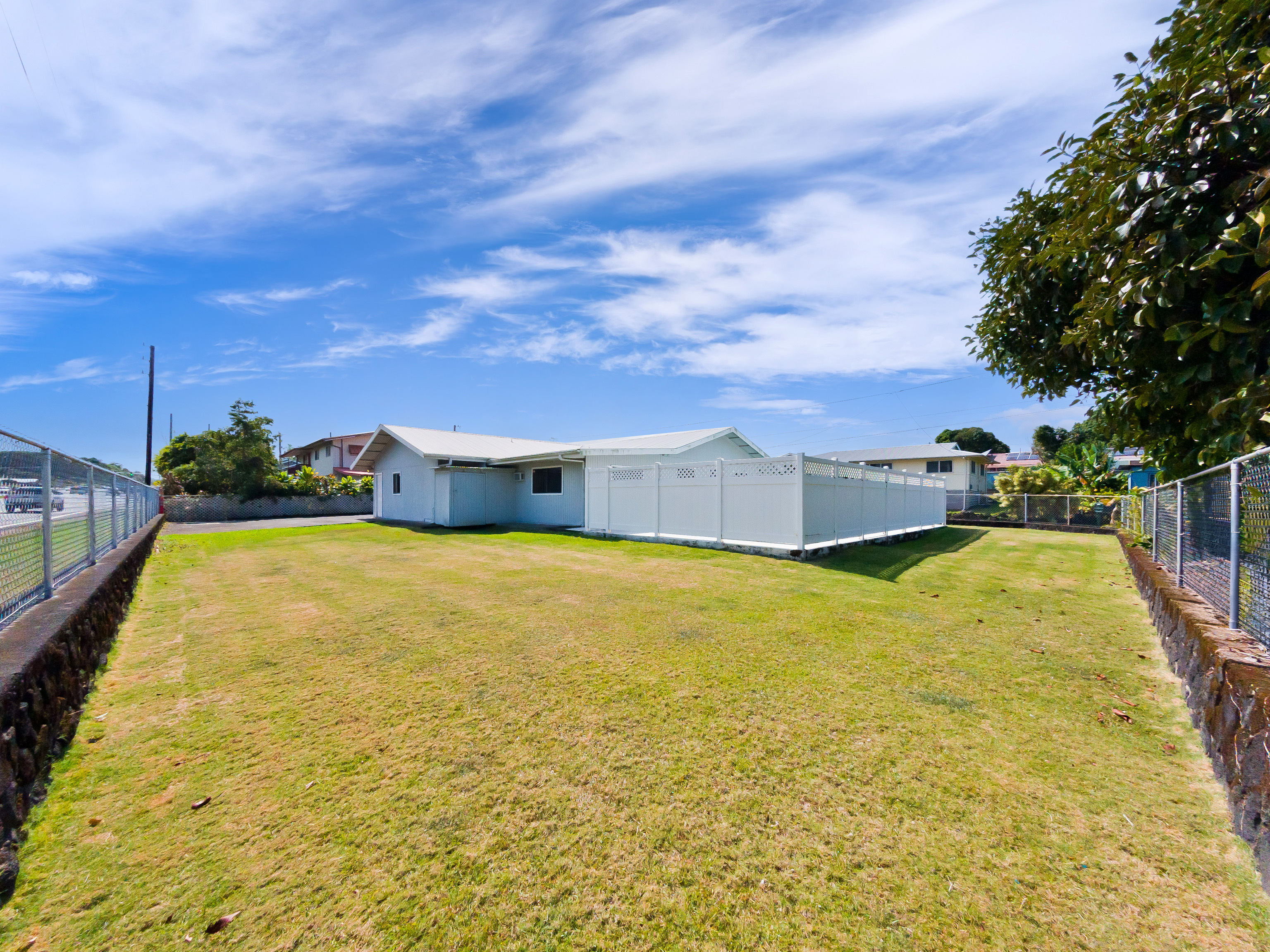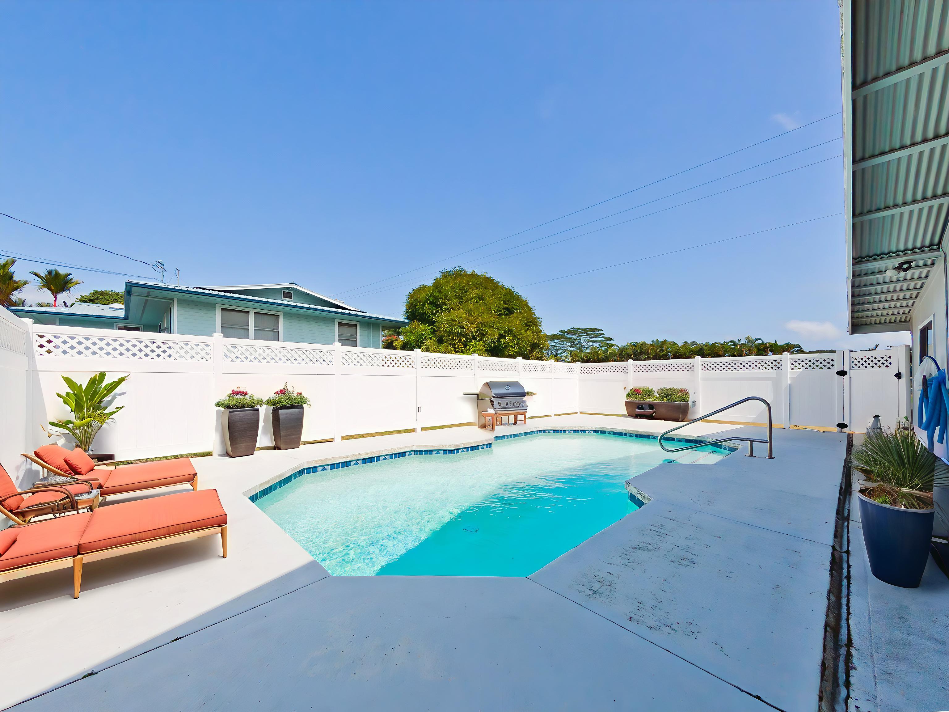 Centrally located in Hilo on Ahona Place, this single-level 3-bedroom, 2-bath home offers classic island living with standout outdoor amenities and flexible interior spaces, ready for you to make it your own. Step through the front gate into a fully fenced property with a combination of stone wall and chain-link fencing for privacy and security. The expansive grassy yard wraps around the home, providing room for gardening or future additions, plus easy pull-in access, ample parking, and an enclosed garage. The highlight of this property is the in-ground swimming pool in its own private fenced area just off the back of the home–perfect for sunny Hilo days, pool parties, and casual weekend barbecues. A generous concrete pool deck provides plenty of space for lounge chairs and outdoor dining, making this a great home to entertain guests in a resort-style setting. Inside, the main living area features vaulted open-beam wood ceilings, large picture windows, and an open-concept layout connecting the living, dining, and kitchen spaces for easy everyday living. The functional galley kitchen offers ample cabinet storage and long countertop runs, and opens to a sunroom-style area with sliding doors to the covered patio and pool–ideal as a second living room, playroom, home office, or hobby space. All three bedrooms are generously sized with easy-care laminate flooring, ceiling fans, and plenty of natural light. The primary bedroom includes an en-suite bath with large vanity, built-in cabinetry, and walk-in closet, while the second full bath serves additional bedrooms and guests. Located on a dead-end street in a prime Hilo area, you’re just minutes from schools, shopping, and medical facilities. Offered at $750,000, this is a rare opportunity to own an in-town pool home–bring your ideas and create the Hilo home you’ve been envisioning. *** Some photos have virtual staging