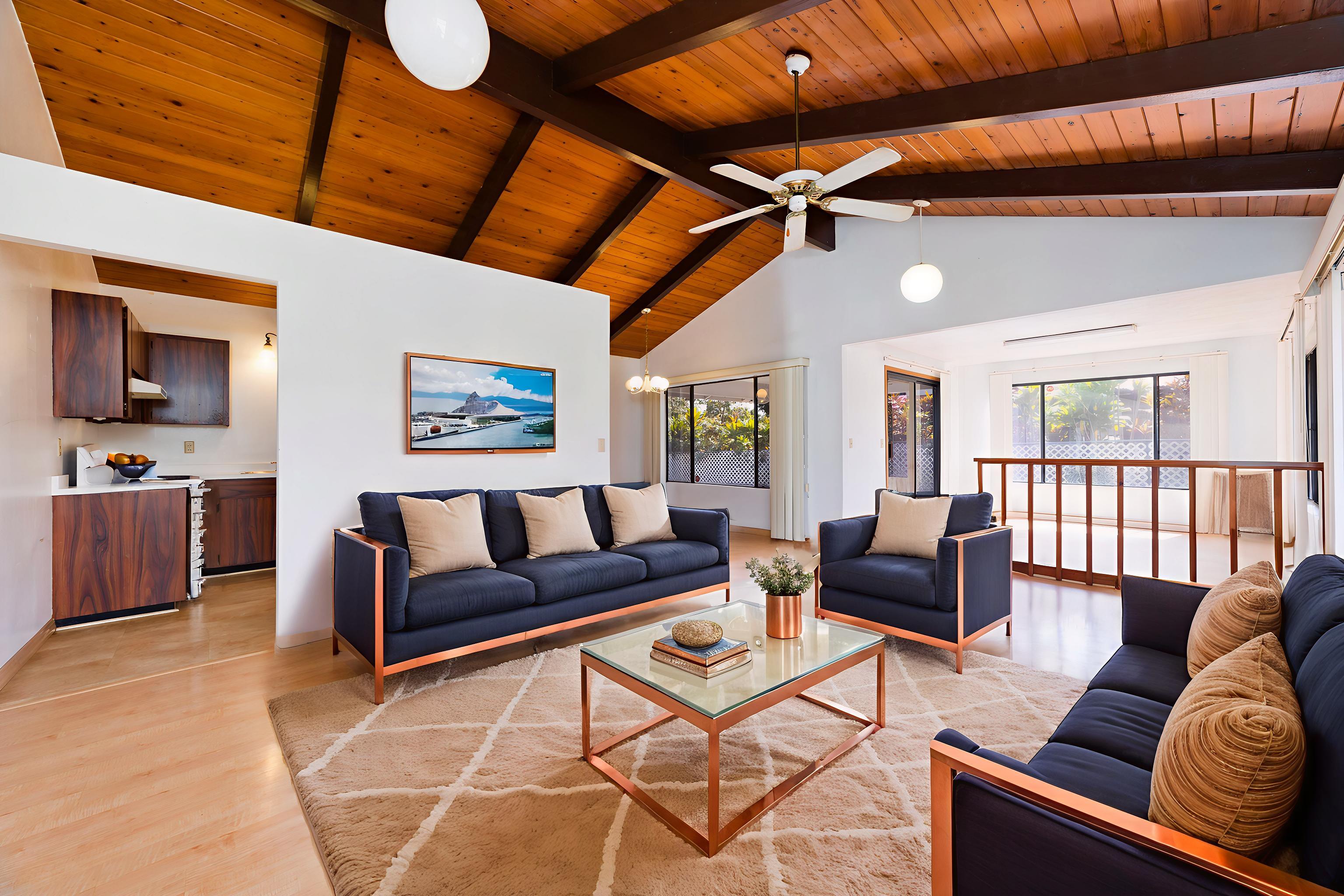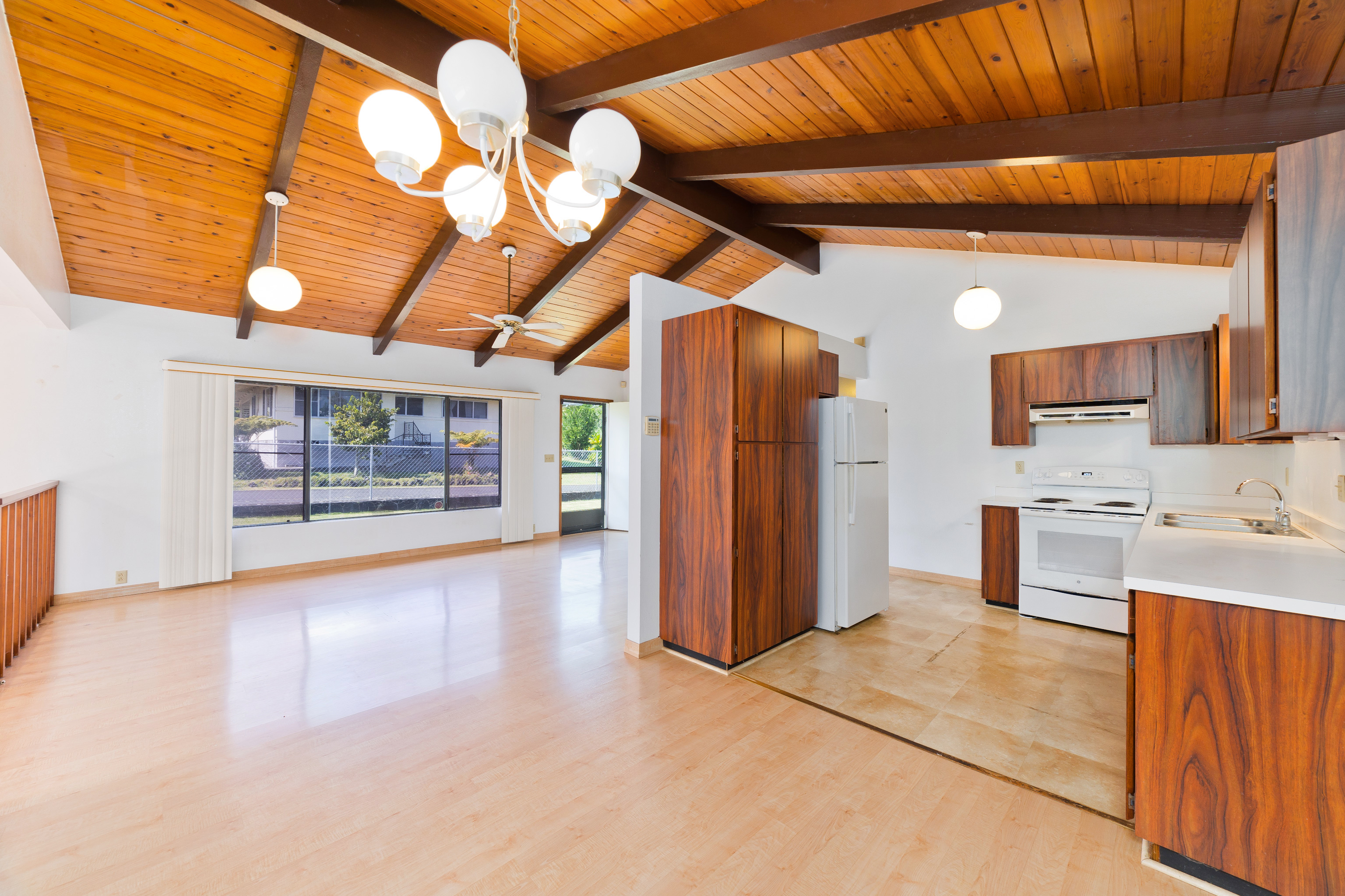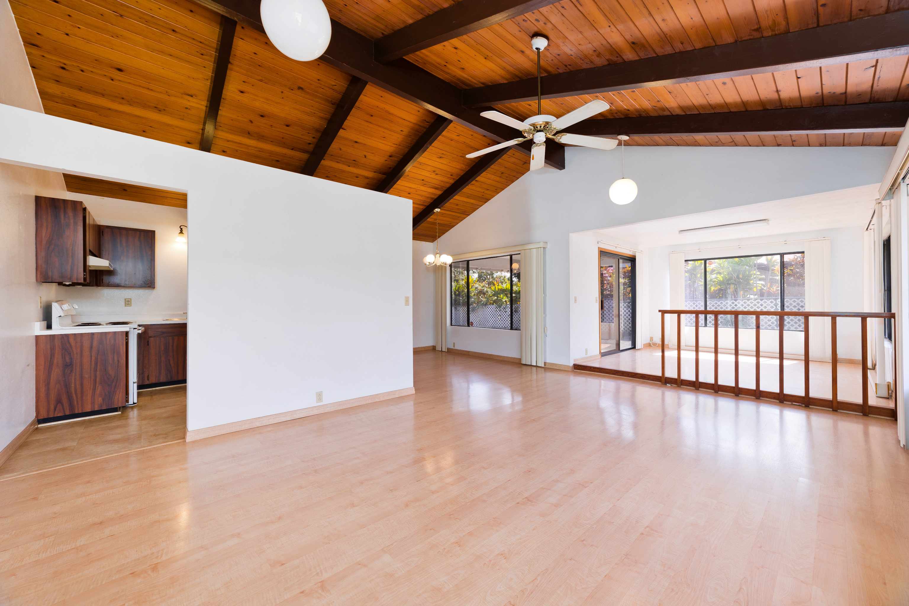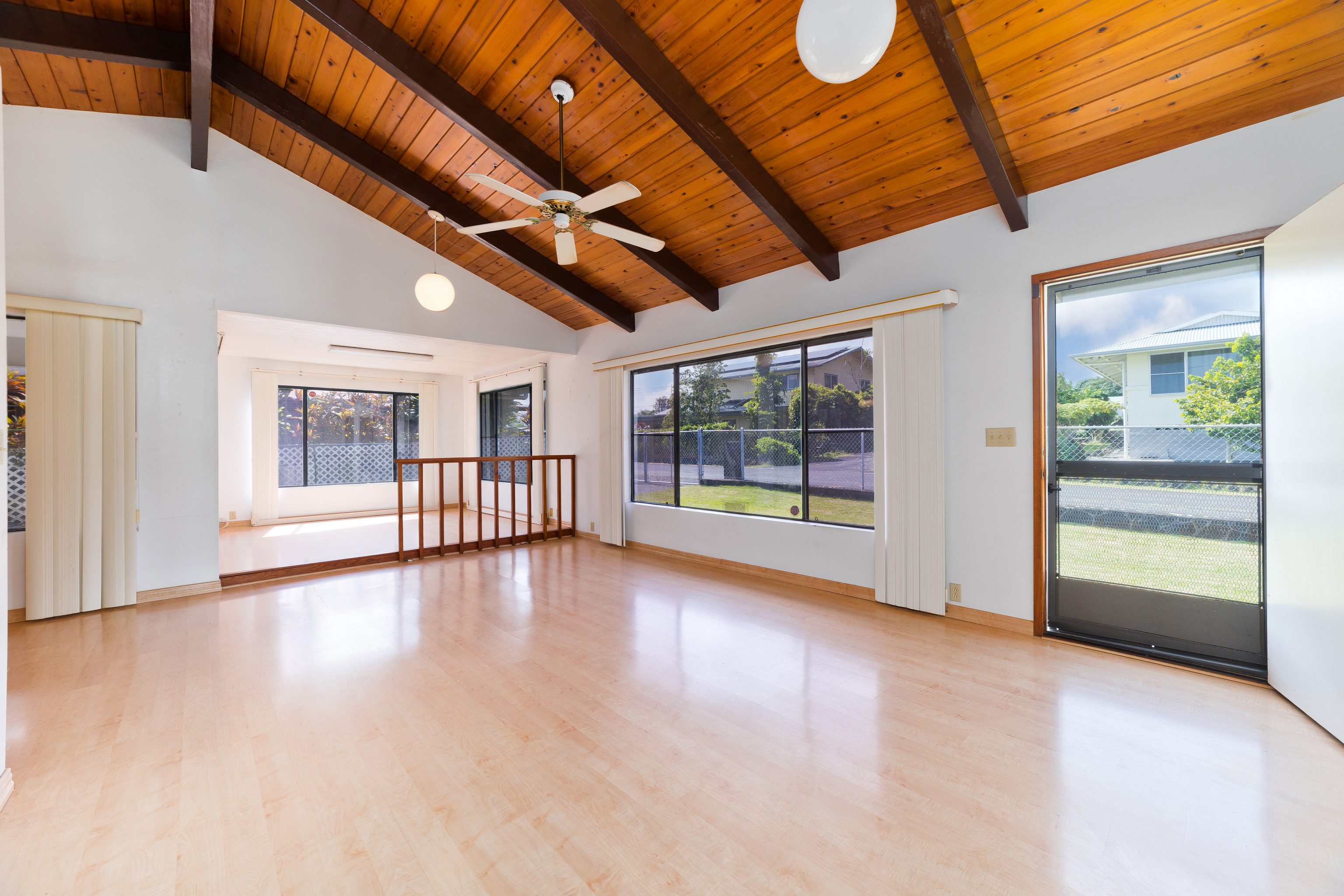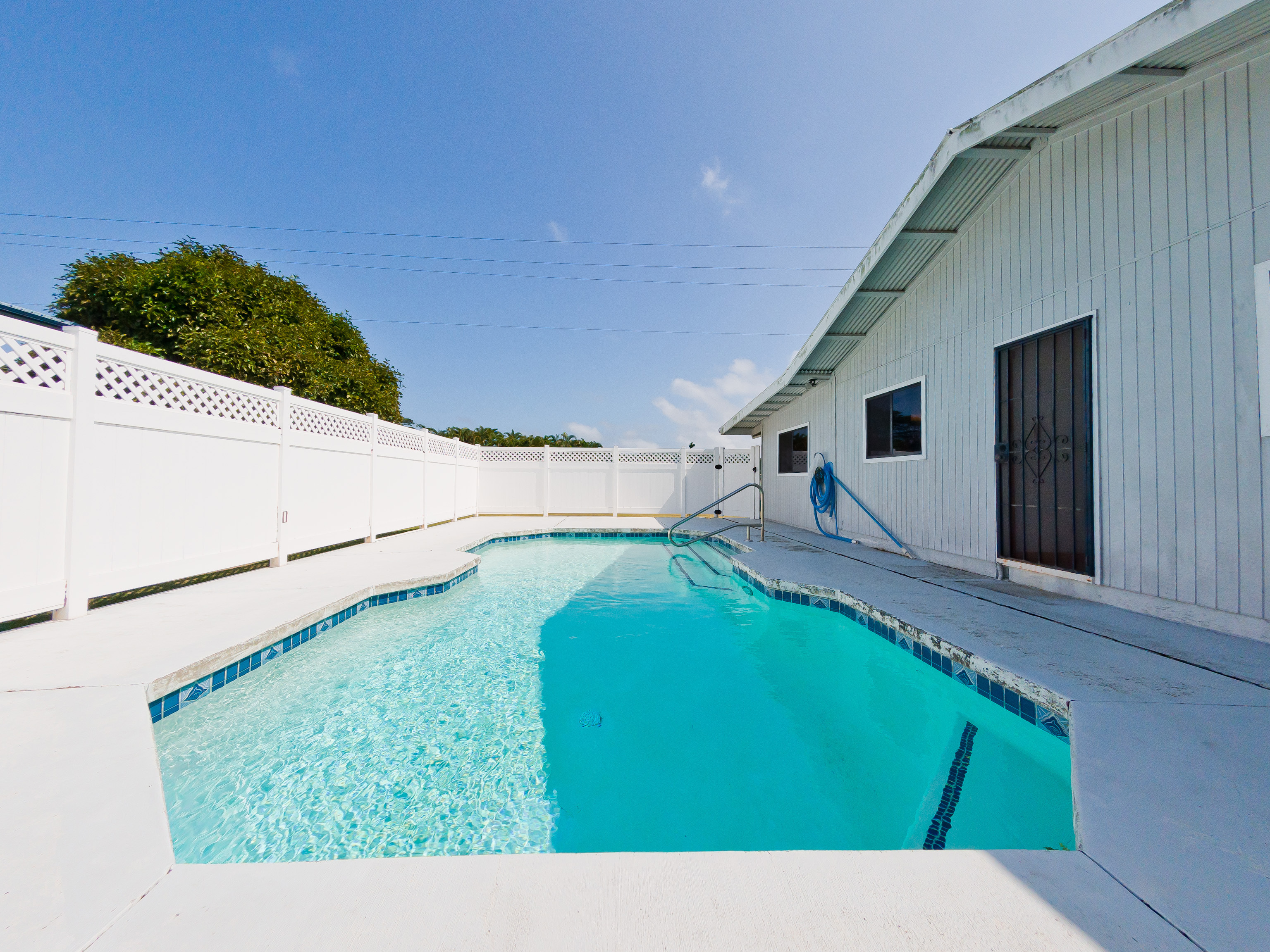 Centrally located in Hilo on Ahona Place, this single-level 3-bedroom, 2-bath home offers classic island living with standout outdoor amenities and flexible interior spaces, ready for you to make it your own. Step through the front gate into a fully fenced property with a combination of stone wall and chain-link fencing for privacy and security. The expansive grassy yard wraps around the home, providing room for gardening or future additions, plus easy pull-in access, ample parking, and an enclosed garage. The highlight of this property is the in-ground swimming pool in its own private fenced area just off the back of the home–perfect for sunny Hilo days, pool parties, and casual weekend barbecues. A generous concrete pool deck provides plenty of space for lounge chairs and outdoor dining, making this a great home to entertain guests in a resort-style setting. Inside, the main living area features vaulted open-beam wood ceilings, large picture windows, and an open-concept layout connecting the living, dining, and kitchen spaces for easy everyday living. The functional galley kitchen offers ample cabinet storage and long countertop runs, and opens to a sunroom-style area with sliding doors to the covered patio and pool–ideal as a second living room, playroom, home office, or hobby space. All three bedrooms are generously sized with easy-care laminate flooring, ceiling fans, and plenty of natural light. The primary bedroom includes an en-suite bath with large vanity, built-in cabinetry, and walk-in closet, while the second full bath serves additional bedrooms and guests. Located on a dead-end street in a prime Hilo area, you’re just minutes from schools, shopping, and medical facilities. Offered at $750,000, this is a rare opportunity to own an in-town pool home–bring your ideas and create the Hilo home you’ve been envisioning. *** Some photos have virtual staging