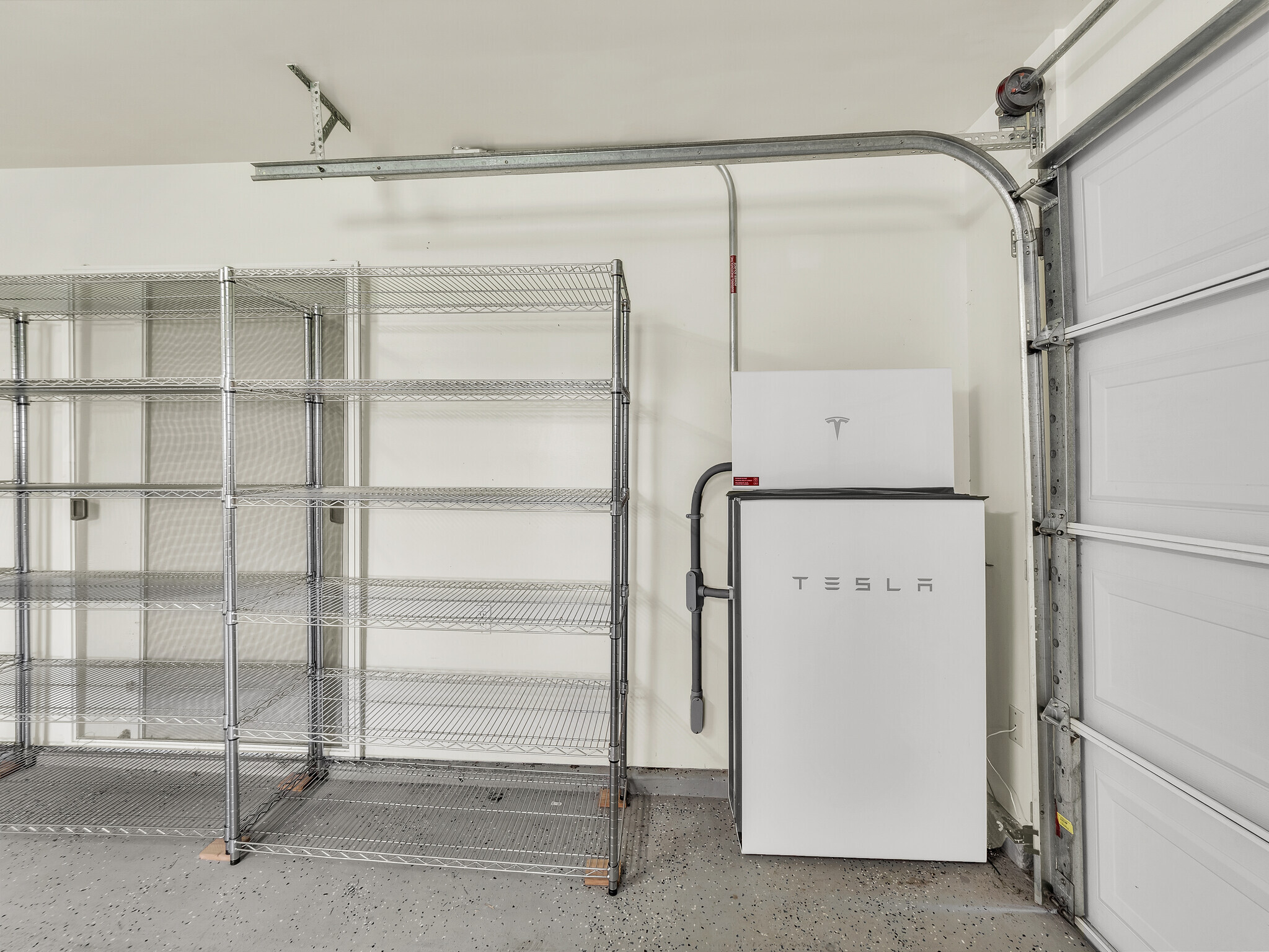 The home is equipped with 22 fully owned solar panels and 2 Tesla Powerwall batteries for dependable, efficient energy.