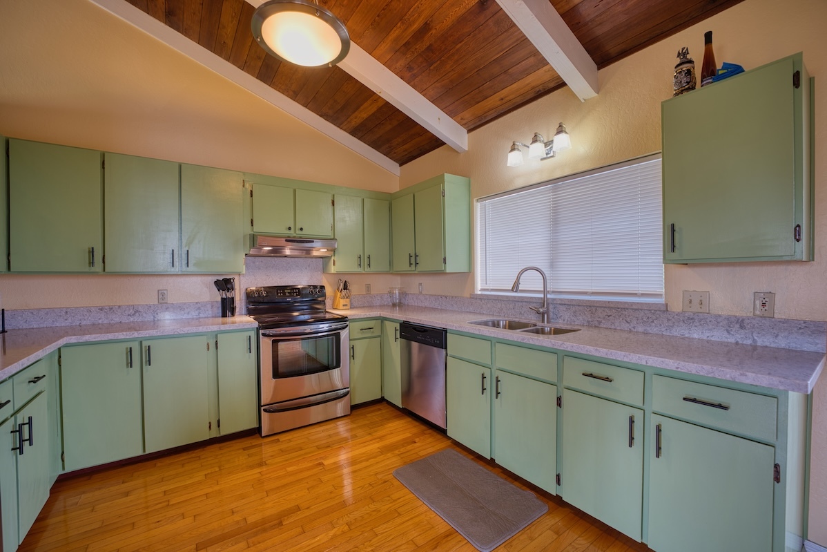 - Oak hardwood floors throughout the home, complemented by open-beam ceilings in the kitchen & living room.
