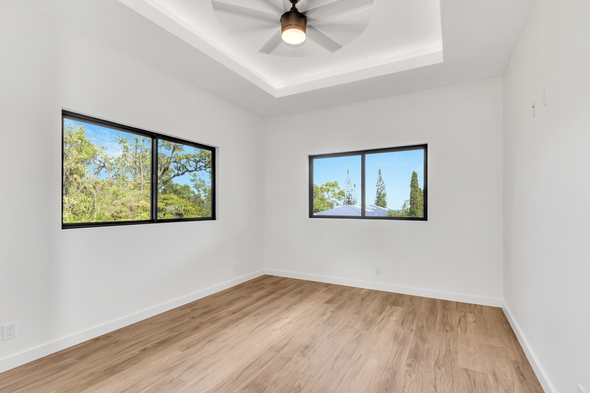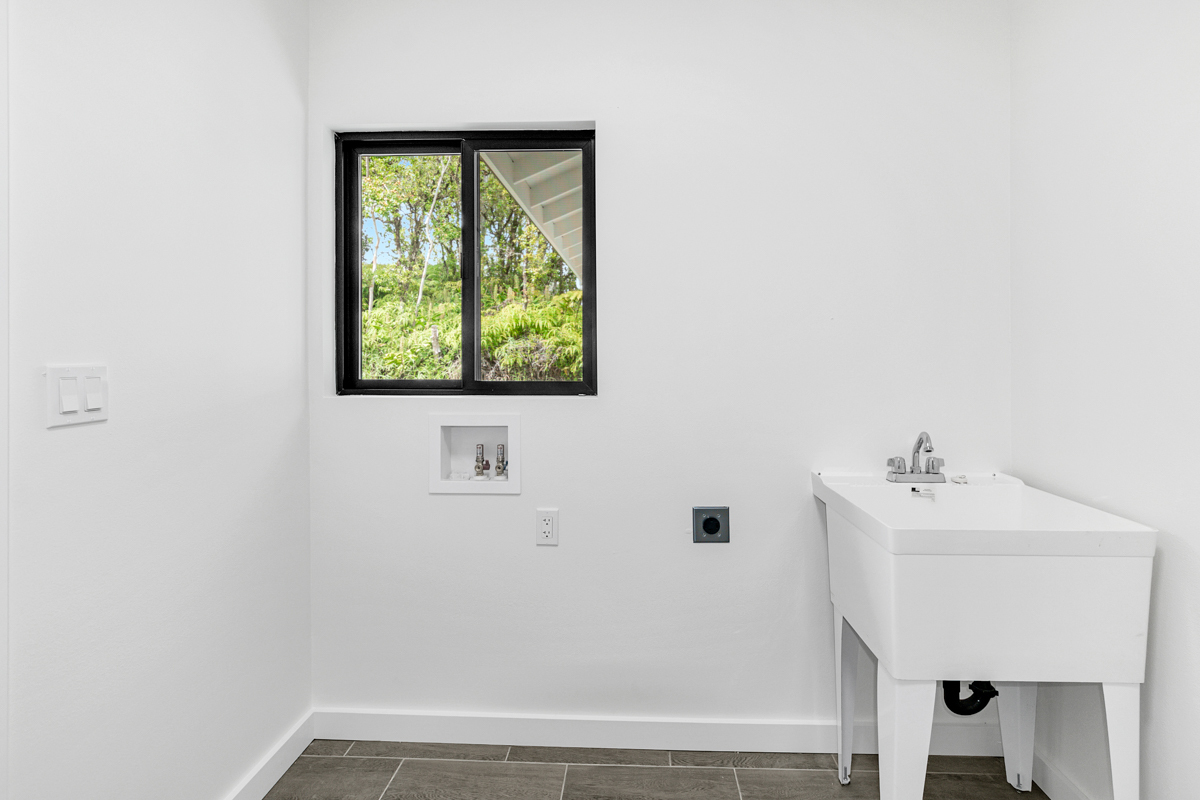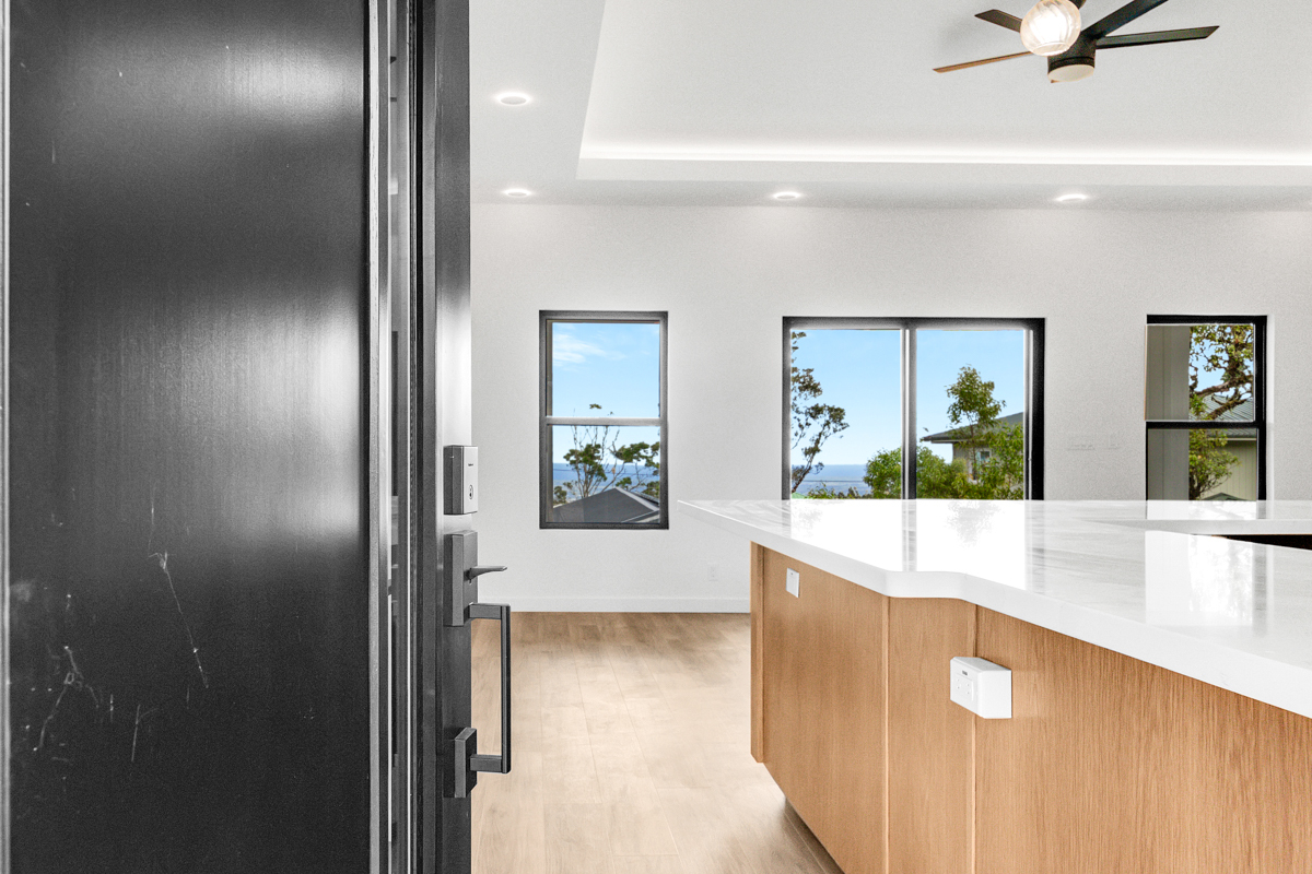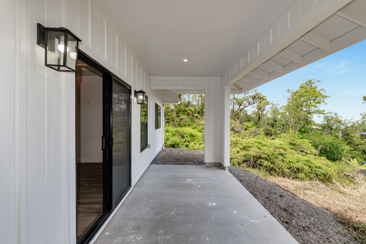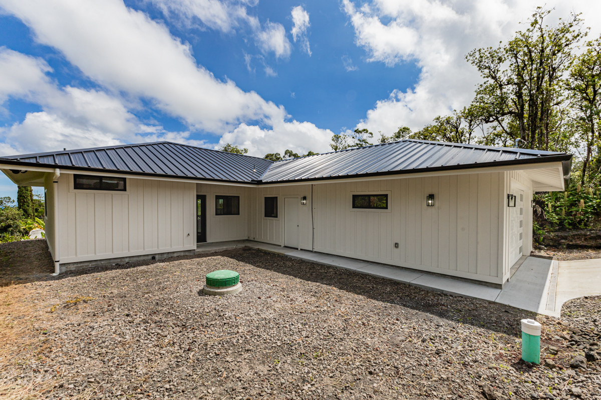 Welcome to this beautifully built 2024 home in desirable Kaumana City. With 1,156 square feet of well planned living space, this 3 bedroom, 2 bathroom residence is modern, fresh and clean. The main living area of the home has sloped ceilings that create an open, airy feel. Natural light flows easily through the home, enhancing the clean lines and contemporary finishes. The kitchen and living spaces connect seamlessly, making everyday living and entertaining a pleasure. The home features a covered lanai, perfect for relaxing outdoors and taking in cool breezes along with a distant ocean view. A garage and concrete driveway provide convenience and durability, while the aerobic septic system adds efficiency and modern infrastructure. This newly built home with quality construction and appealing features, this home is ready to welcome its first owners.