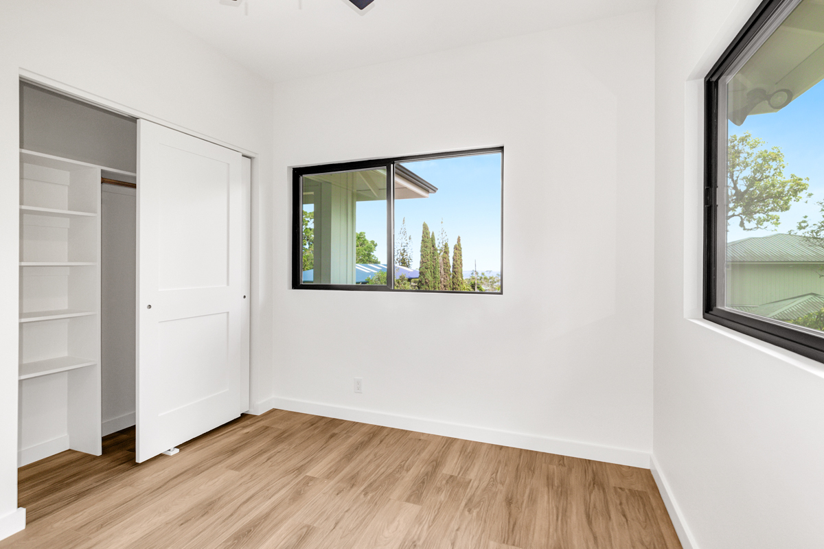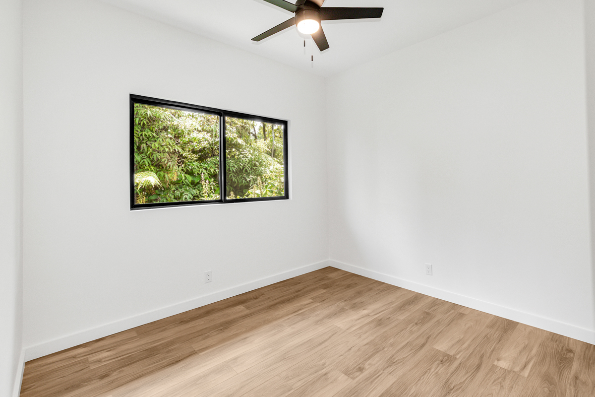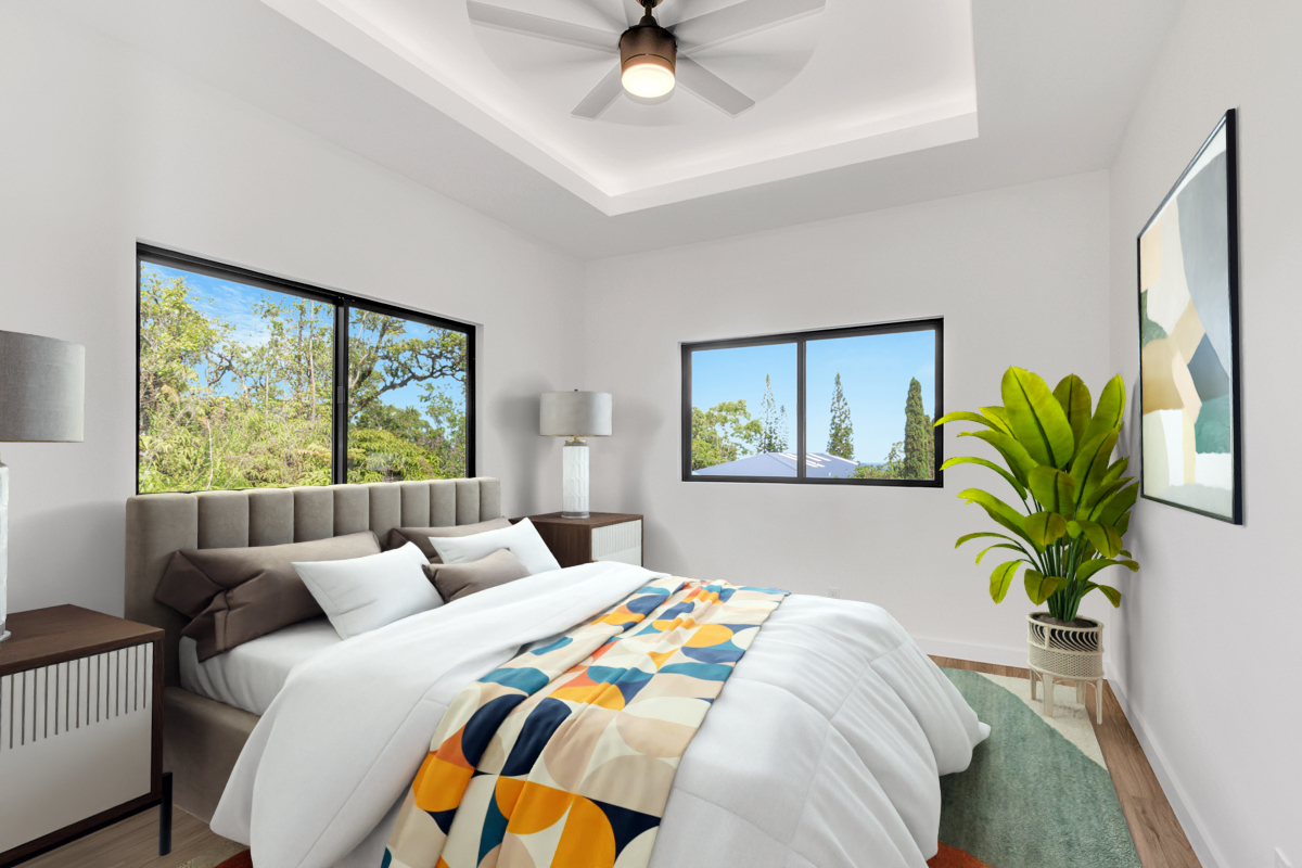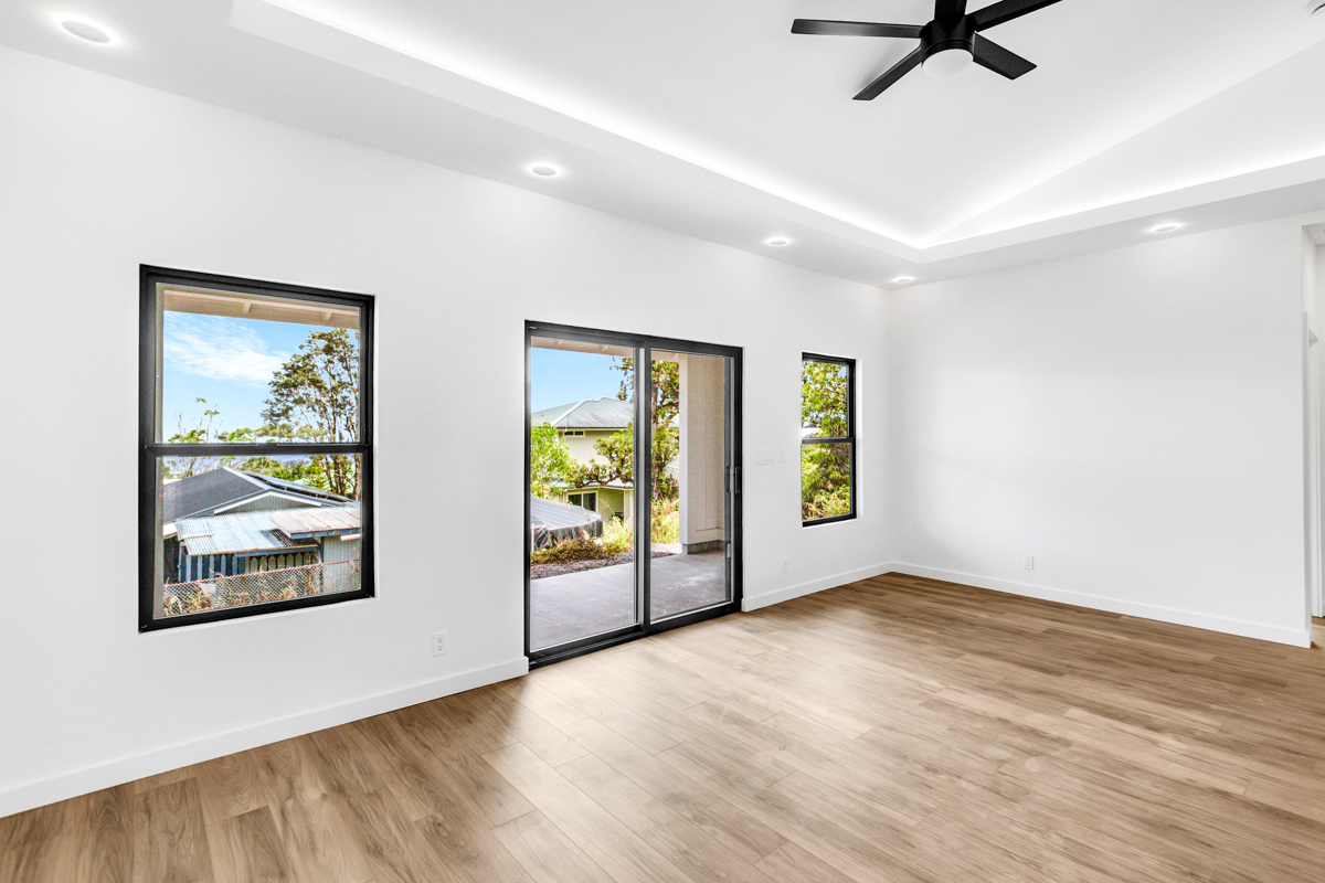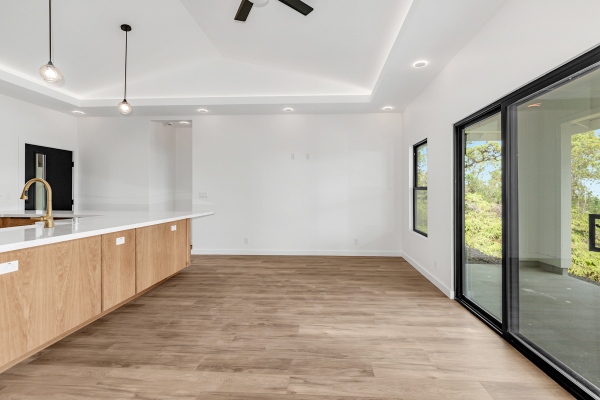 Welcome to this beautifully built 2024 home in desirable Kaumana City. With 1,156 square feet of well planned living space, this 3 bedroom, 2 bathroom residence is modern, fresh and clean. The main living area of the home has sloped ceilings that create an open, airy feel. Natural light flows easily through the home, enhancing the clean lines and contemporary finishes. The kitchen and living spaces connect seamlessly, making everyday living and entertaining a pleasure. The home features a covered lanai, perfect for relaxing outdoors and taking in cool breezes along with a distant ocean view. A garage and concrete driveway provide convenience and durability, while the aerobic septic system adds efficiency and modern infrastructure. This newly built home with quality construction and appealing features, this home is ready to welcome its first owners.