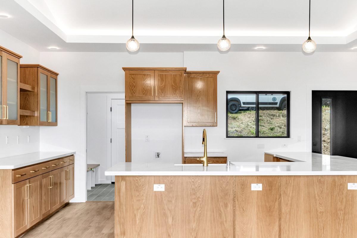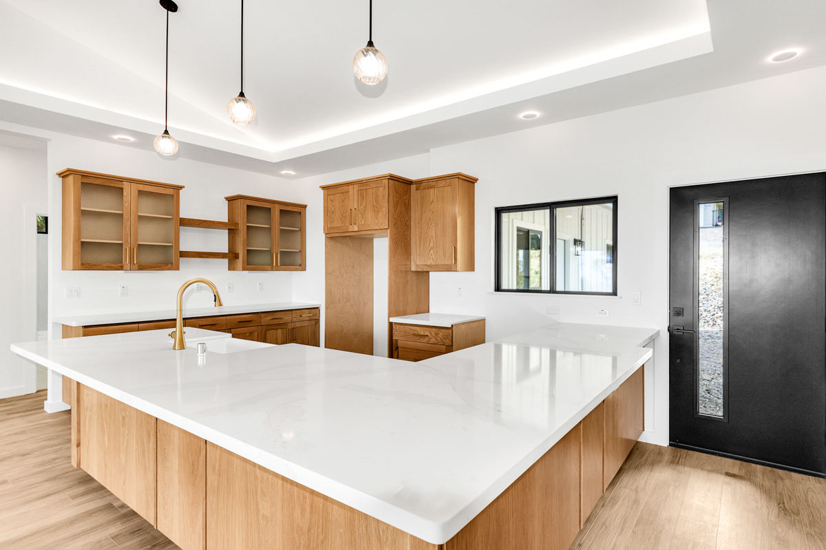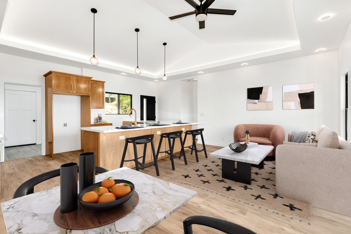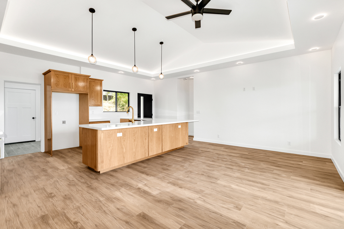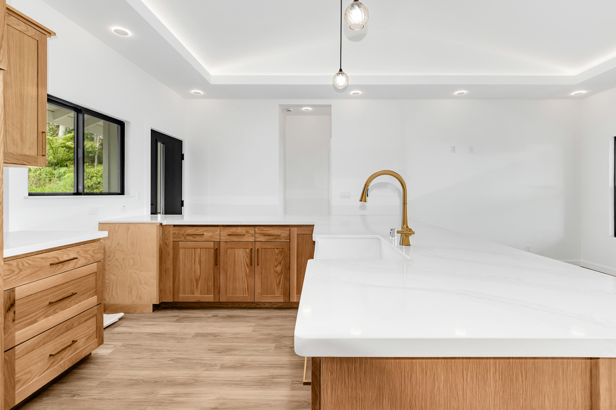 Welcome to this beautifully built 2024 home in desirable Kaumana City. With 1,156 square feet of well planned living space, this 3 bedroom, 2 bathroom residence is modern, fresh and clean. The main living area of the home has sloped ceilings that create an open, airy feel. Natural light flows easily through the home, enhancing the clean lines and contemporary finishes. The kitchen and living spaces connect seamlessly, making everyday living and entertaining a pleasure. The home features a covered lanai, perfect for relaxing outdoors and taking in cool breezes along with a distant ocean view. A garage and concrete driveway provide convenience and durability, while the aerobic septic system adds efficiency and modern infrastructure. This newly built home with quality construction and appealing features, this home is ready to welcome its first owners.