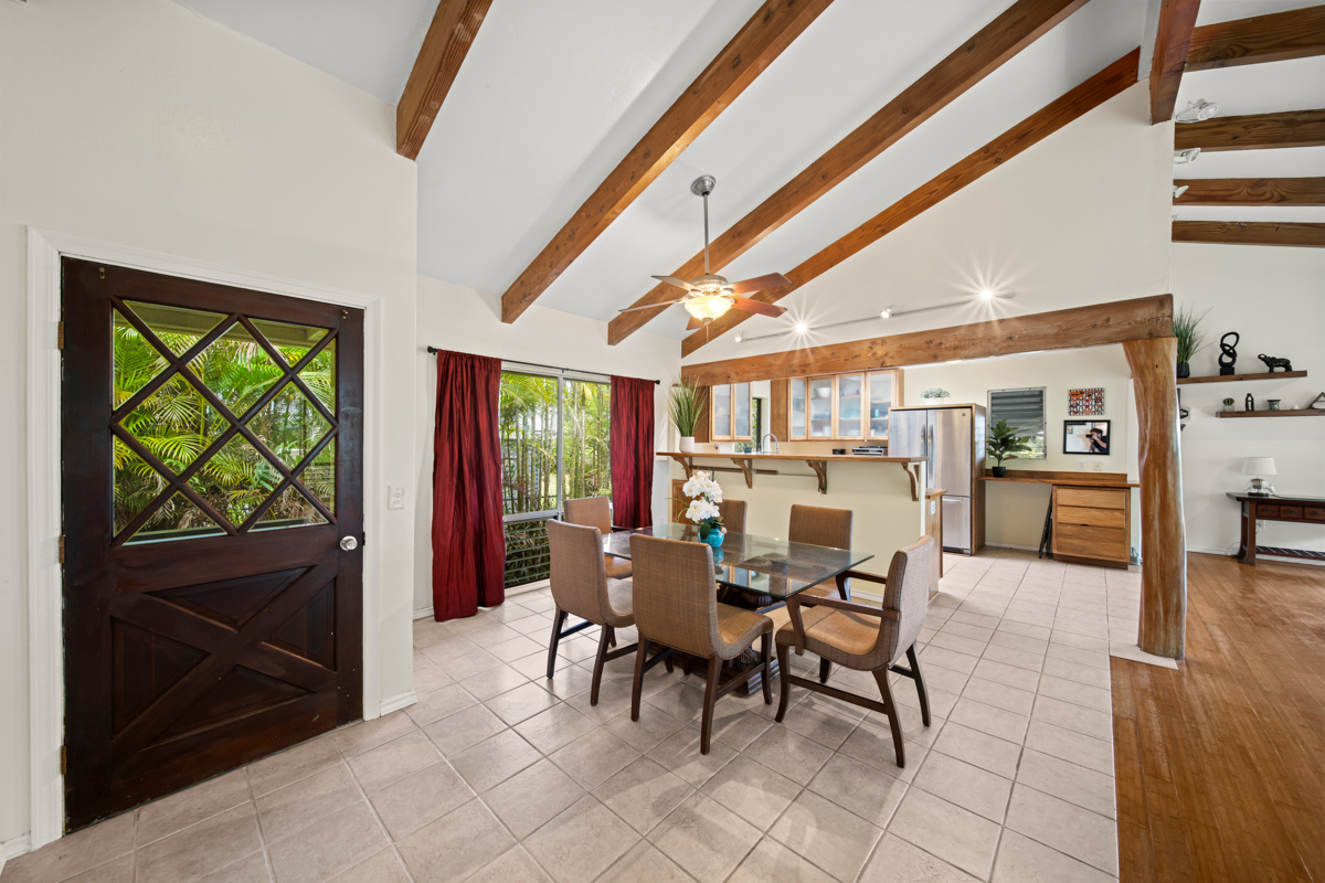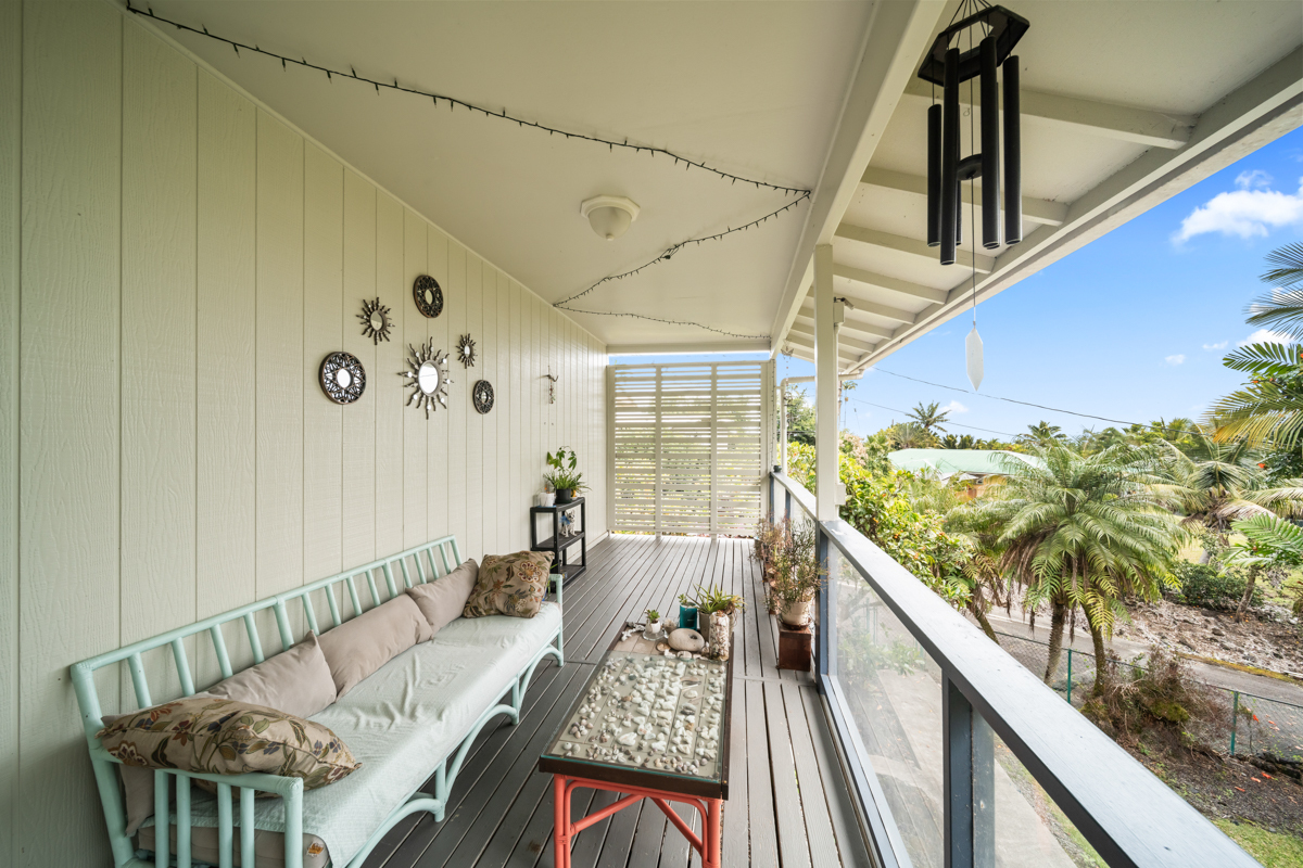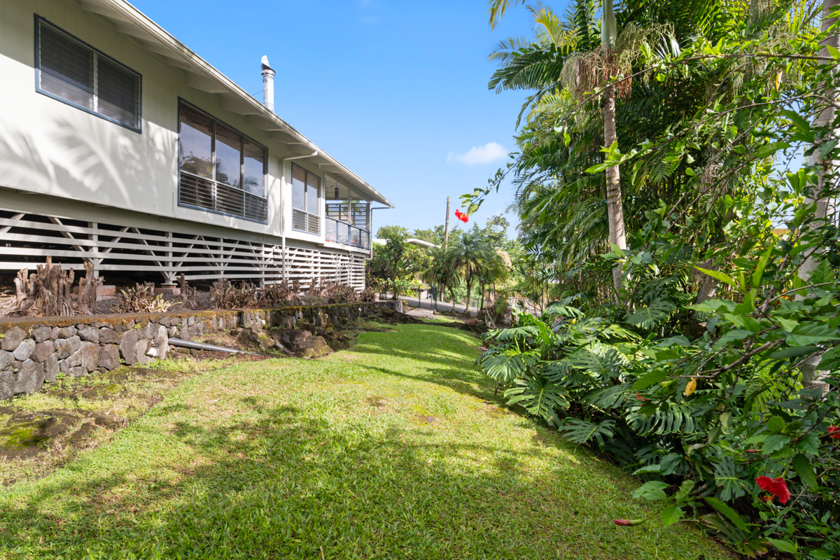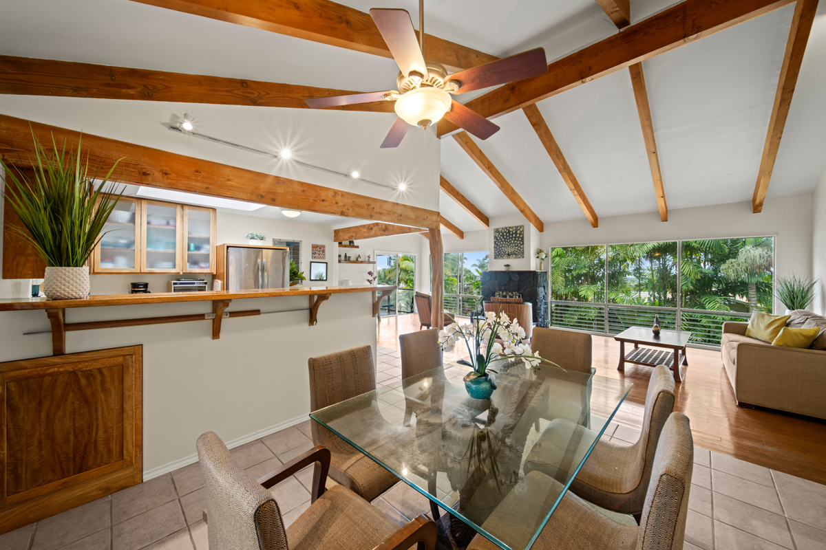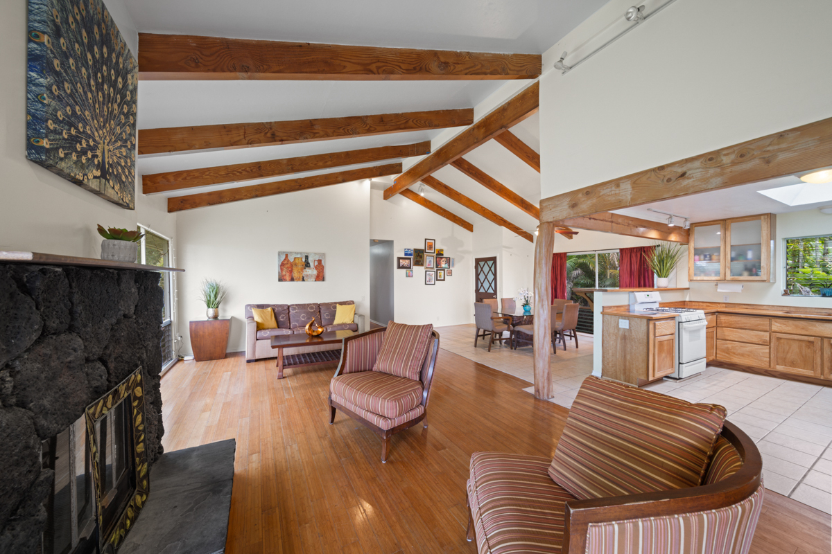 Welcome home to this inviting 3-bedroom, 2-bath residence. Soaring open-beam vaulted ceilings and a wall of picture windows flood the living room with natural light, framing the tropical landscaping views and a stunning lava rock wood-burning fireplace. The kitchen features a bar-top counter with mango wood countertops and a skylight for bright, casual dining and effortless entertaining. Retreat to the primary suite with a whirlpool tub and dual shower heads for spa-like relaxation. Enjoy indoor-outdoor living with two lanais: a front lanai showcasing ocean-horizon views and a private lanai off the back bedroom with views into the forest. The property backs up to expansive acreage, offering a buffer and a sense of seclusion. Outside, a landscaped, fenced yard boasts a mature puakenikeni tree, jaboticaba, and numerous orchids and palms–lush, fragrant, and easy to enjoy. Thoughtfully designed for everyday living, with dramatic ceilings, natural finishes, and seamless flow between spaces.
