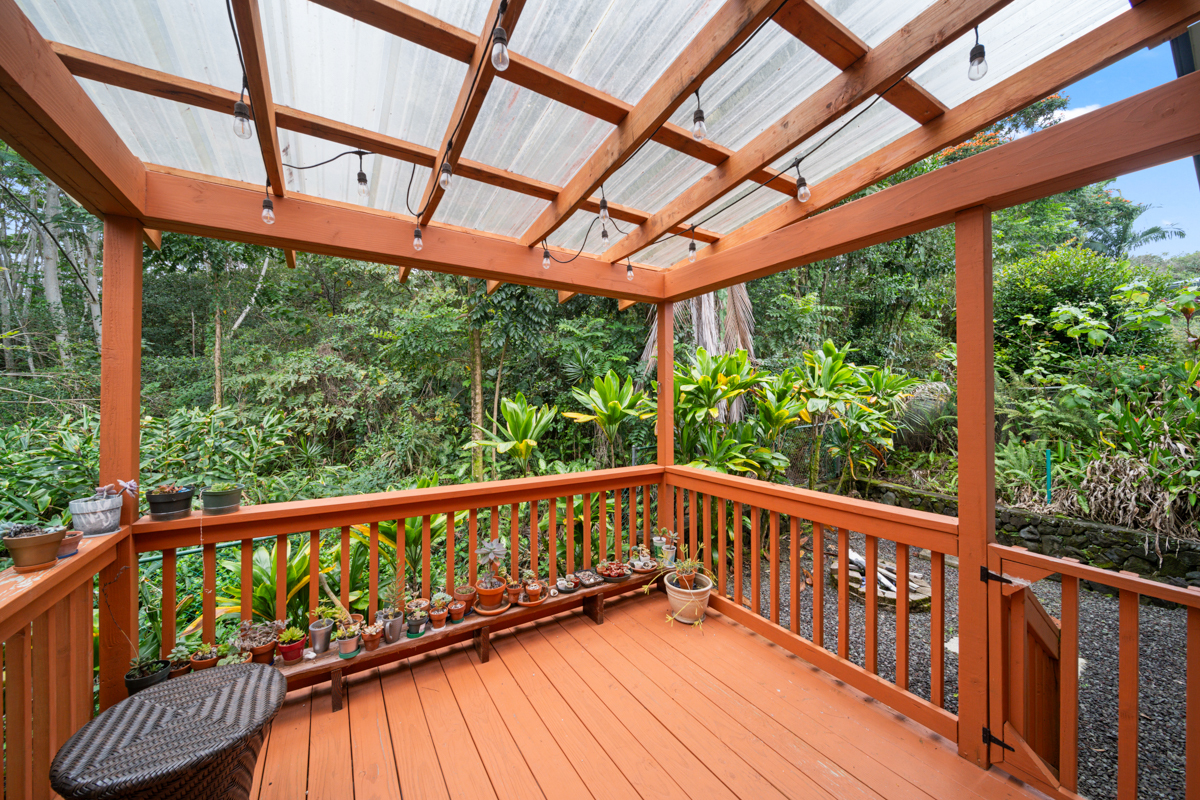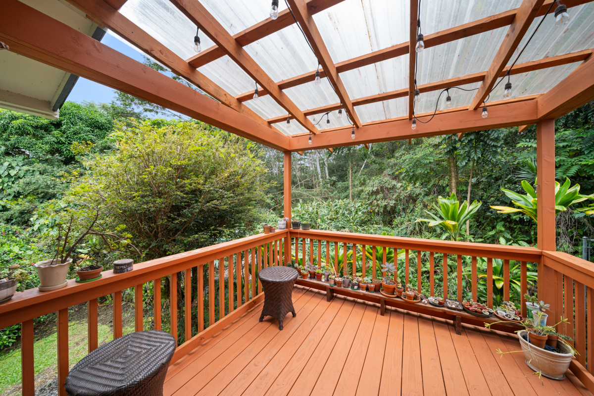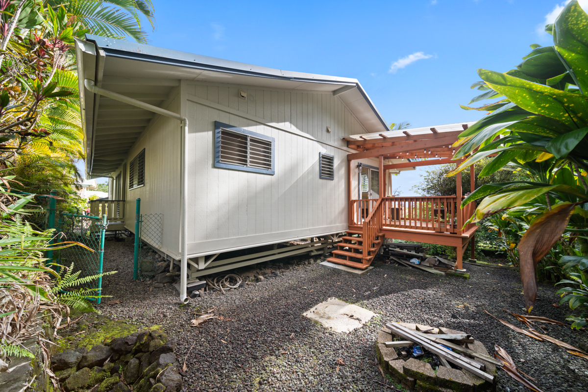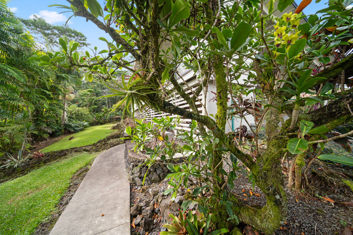 Welcome home to this inviting 3-bedroom, 2-bath residence. Soaring open-beam vaulted ceilings and a wall of picture windows flood the living room with natural light, framing the tropical landscaping views and a stunning lava rock wood-burning fireplace. The kitchen features a bar-top counter with mango wood countertops and a skylight for bright, casual dining and effortless entertaining. Retreat to the primary suite with a whirlpool tub and dual shower heads for spa-like relaxation. Enjoy indoor-outdoor living with two lanais: a front lanai showcasing ocean-horizon views and a private lanai off the back bedroom with views into the forest. The property backs up to expansive acreage, offering a buffer and a sense of seclusion. Outside, a landscaped, fenced yard boasts a mature puakenikeni tree, jaboticaba, and numerous orchids and palms–lush, fragrant, and easy to enjoy. Thoughtfully designed for everyday living, with dramatic ceilings, natural finishes, and seamless flow between spaces.