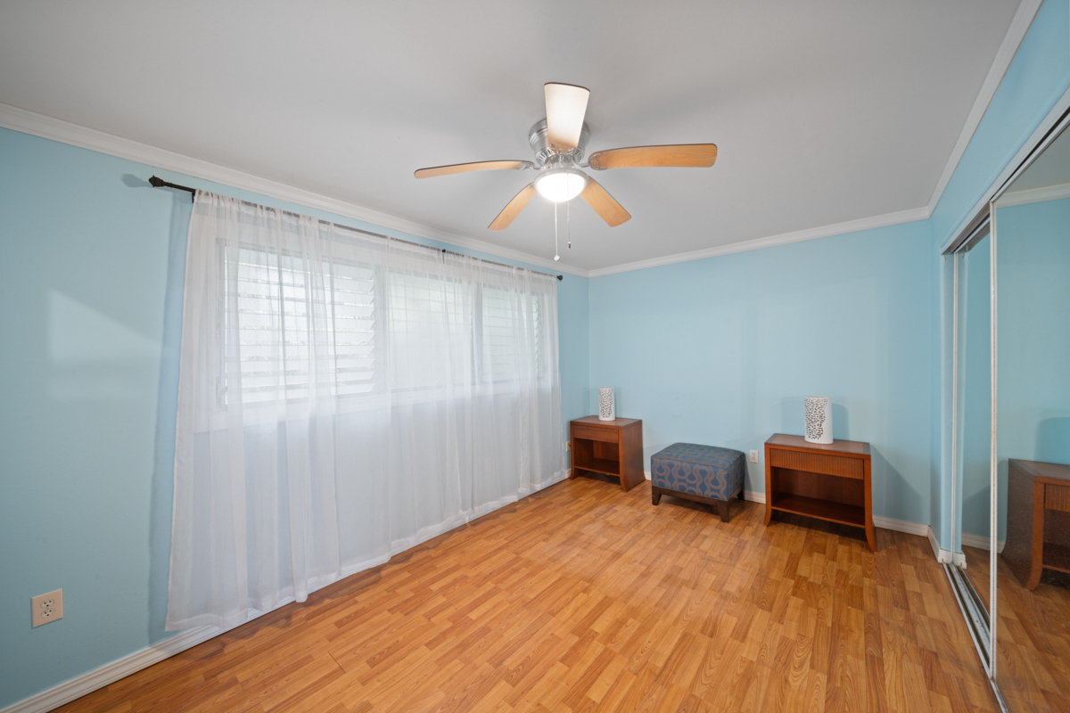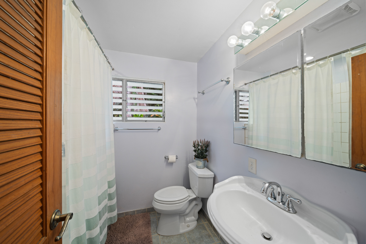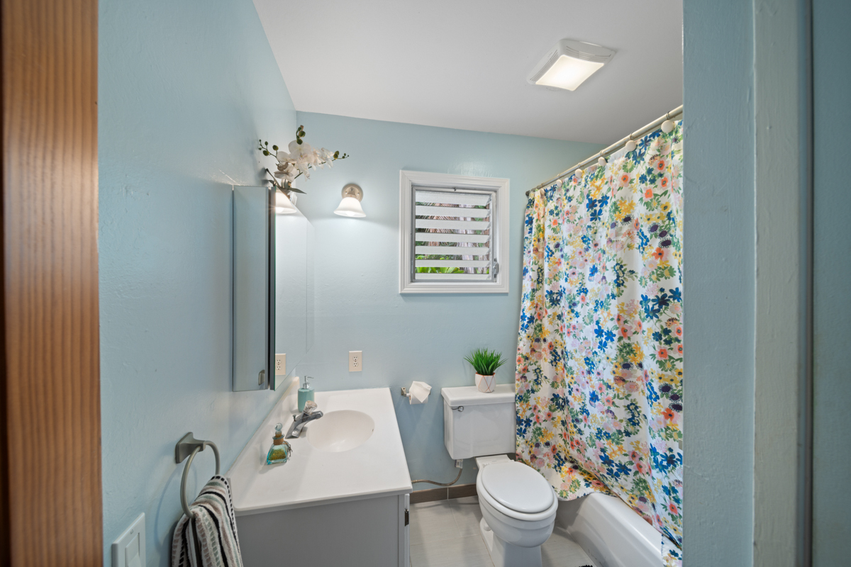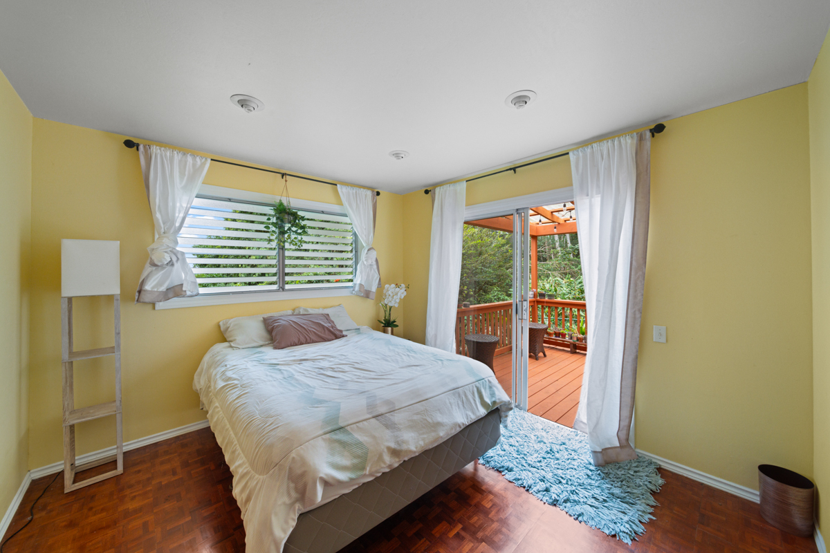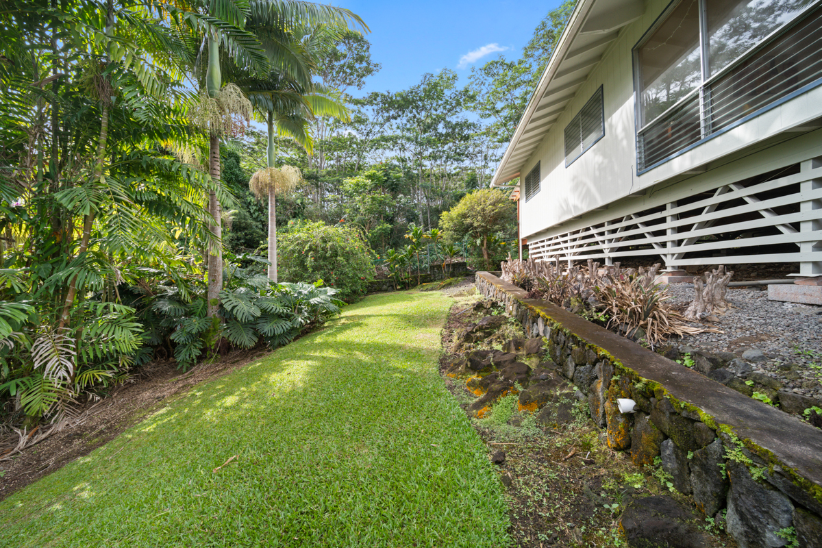 Welcome home to this inviting 3-bedroom, 2-bath residence. Soaring open-beam vaulted ceilings and a wall of picture windows flood the living room with natural light, framing the tropical landscaping views and a stunning lava rock wood-burning fireplace. The kitchen features a bar-top counter with mango wood countertops and a skylight for bright, casual dining and effortless entertaining. Retreat to the primary suite with a whirlpool tub and dual shower heads for spa-like relaxation. Enjoy indoor-outdoor living with two lanais: a front lanai showcasing ocean-horizon views and a private lanai off the back bedroom with views into the forest. The property backs up to expansive acreage, offering a buffer and a sense of seclusion. Outside, a landscaped, fenced yard boasts a mature puakenikeni tree, jaboticaba, and numerous orchids and palms–lush, fragrant, and easy to enjoy. Thoughtfully designed for everyday living, with dramatic ceilings, natural finishes, and seamless flow between spaces.