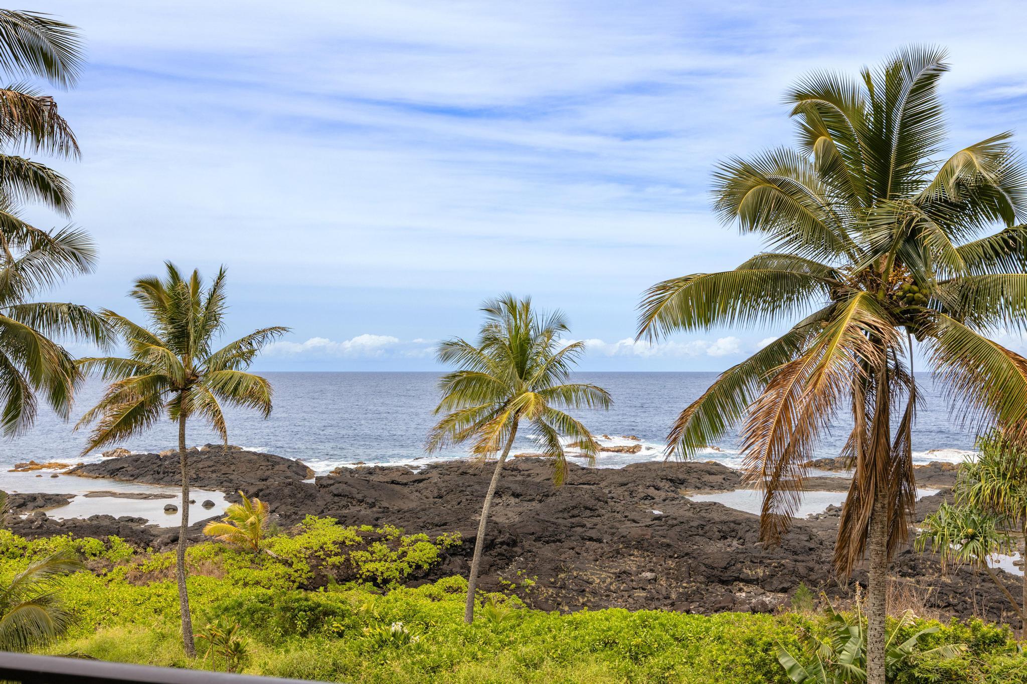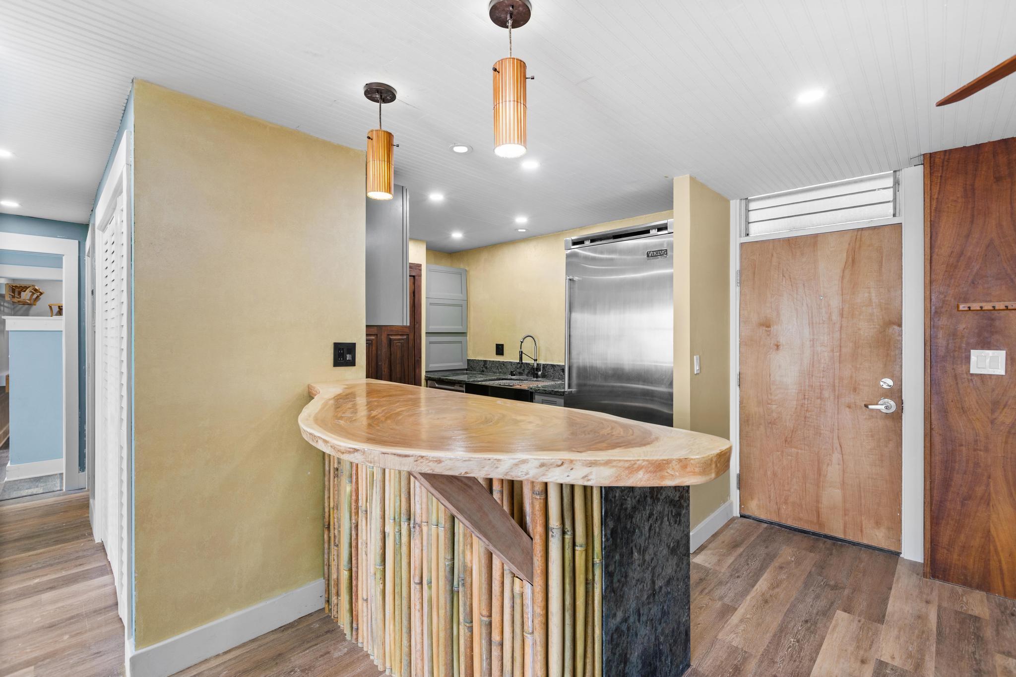 Tastefully renovated & selling as-is, this 4th-floor oceanfront condo has been transformed from top to bottom. With a blend of modern luxury & timeless island design, this bright & airy retreat will make you feel like you’re on vacation every day. Step inside to an open-concept living space where updated doors & windows frame sweeping views of the Pacific Ocean & rugged rocky coastline. The interior is thoughtfully designed with custom fixtures, unique lighting designs, & elegant architectural details, including bead-board ceilings & vintage shoji doors that add warmth & character to the main living space. The updated chef’s kitchen is a showpiece; featuring solid granite countertops, high-end appliances, including a Viking refrigerator & Jenn-Air range, an efficient microwave drawer, a double-drawer dishwasher, & a striking raw-edge monkey pod eat-in bar. A custom pantry further accentuates the elegant choice of cabinetry, pulls, & fixtures in the kitchen. The dining space features a koa wood accent wall, highlighting the beauty of a native Hawaiian treasure while elevating the space with refined island style. Both bathrooms have been beautifully upgraded with custom tiled showers, while the primary bedroom features a private en-suite for a true retreat experience. The unit also includes a full size washer & dryer for modern comfort & convenience. Enjoy sunrise coffee & evening sips on the spacious lanai with panoramic ocean views. Watch seasonal whales or stargaze over the Pacific horizon from your very own private haven. Hale Kahakai has excellent amenities: an on-site resident manager, assigned parking, elevator, pool, BBQ area, meeting/recreation space, storage lockers, & more. Located in the beloved Keaukaha coastal community, you’re just a short stroll to the black sand beach & snorkeling at Richardson Ocean Park. Unit to be sold in as-is condition. Bring your creative vision to complete your island oasis!