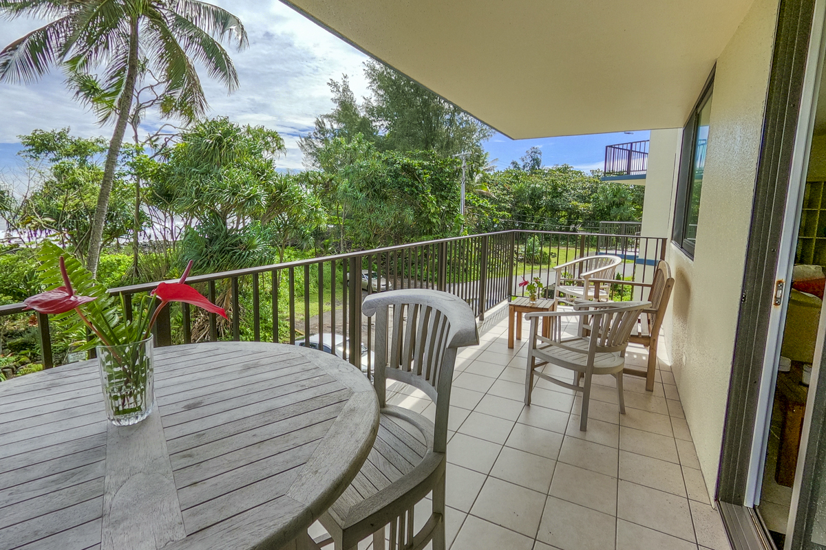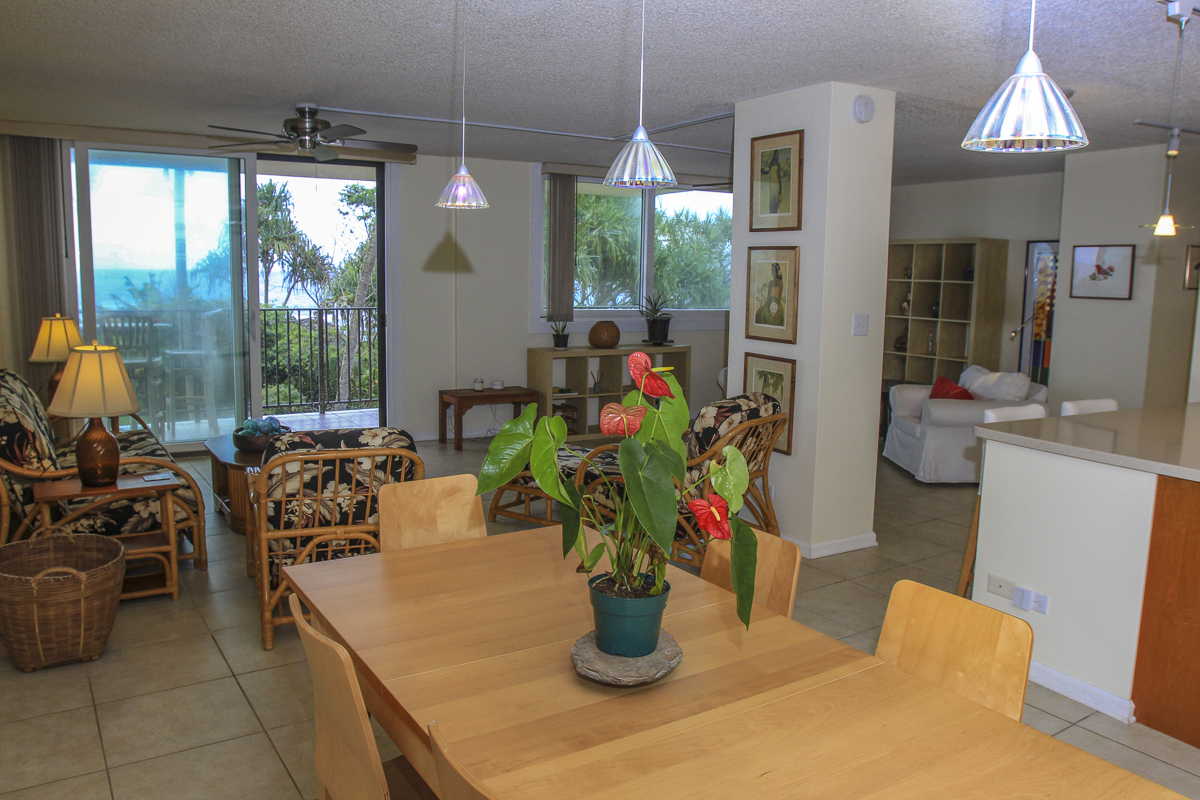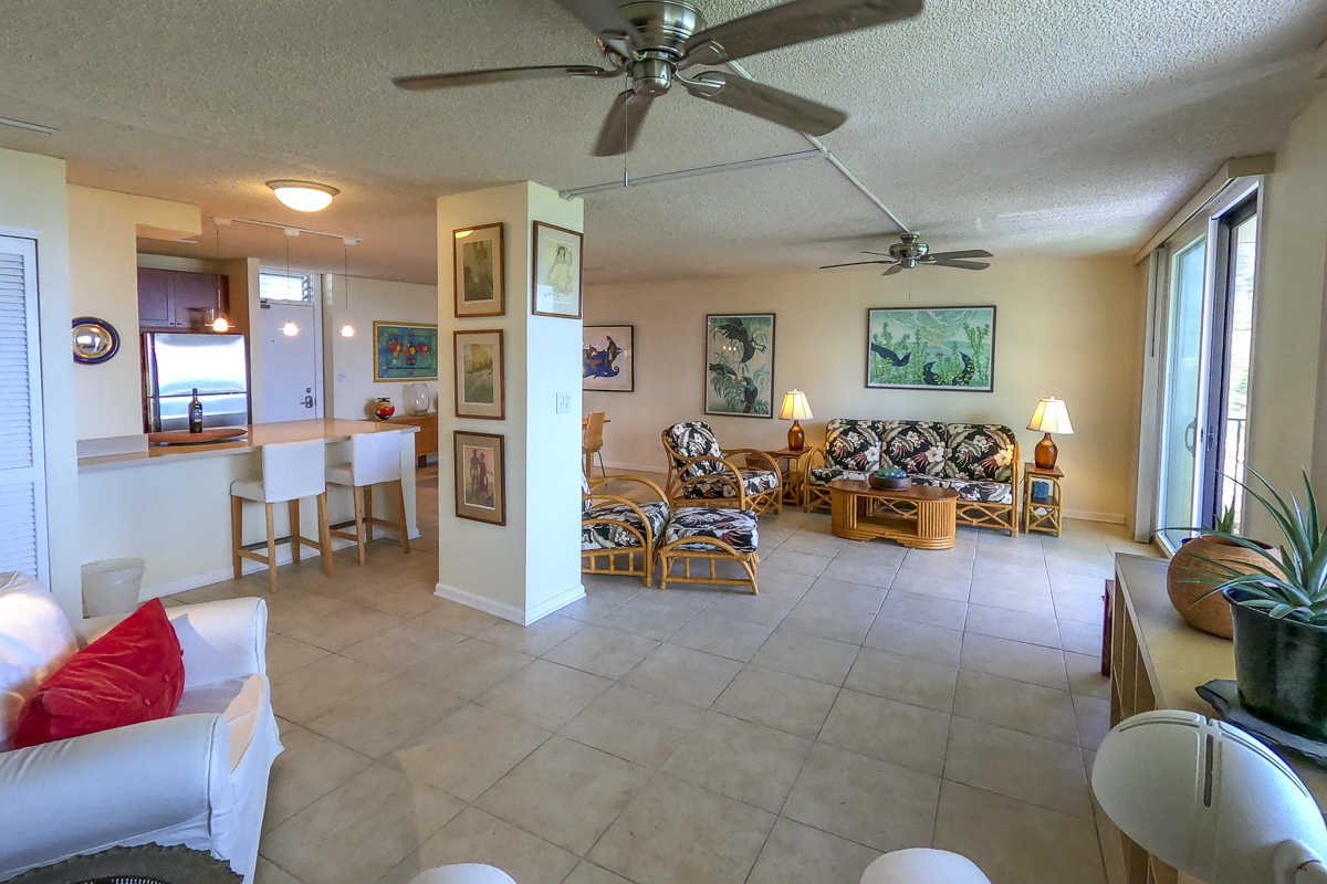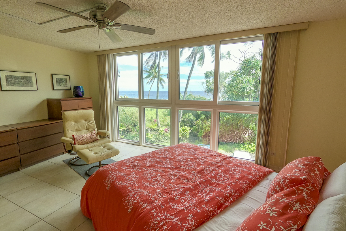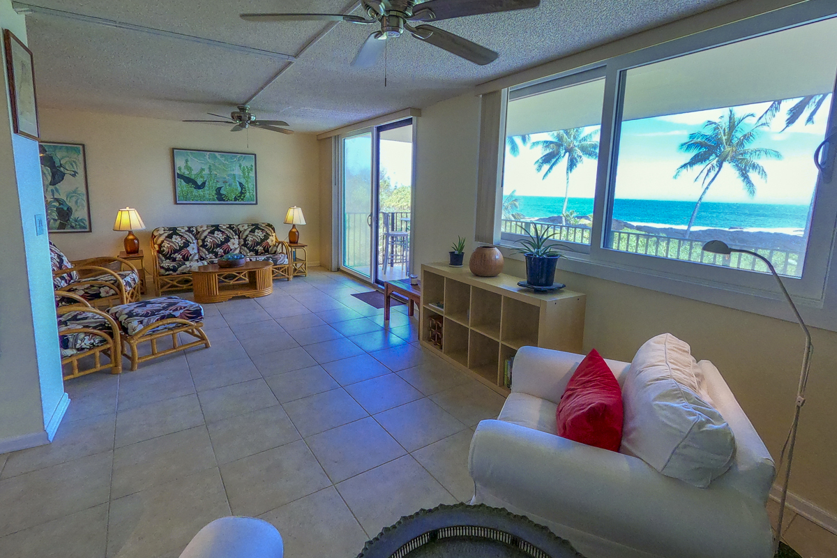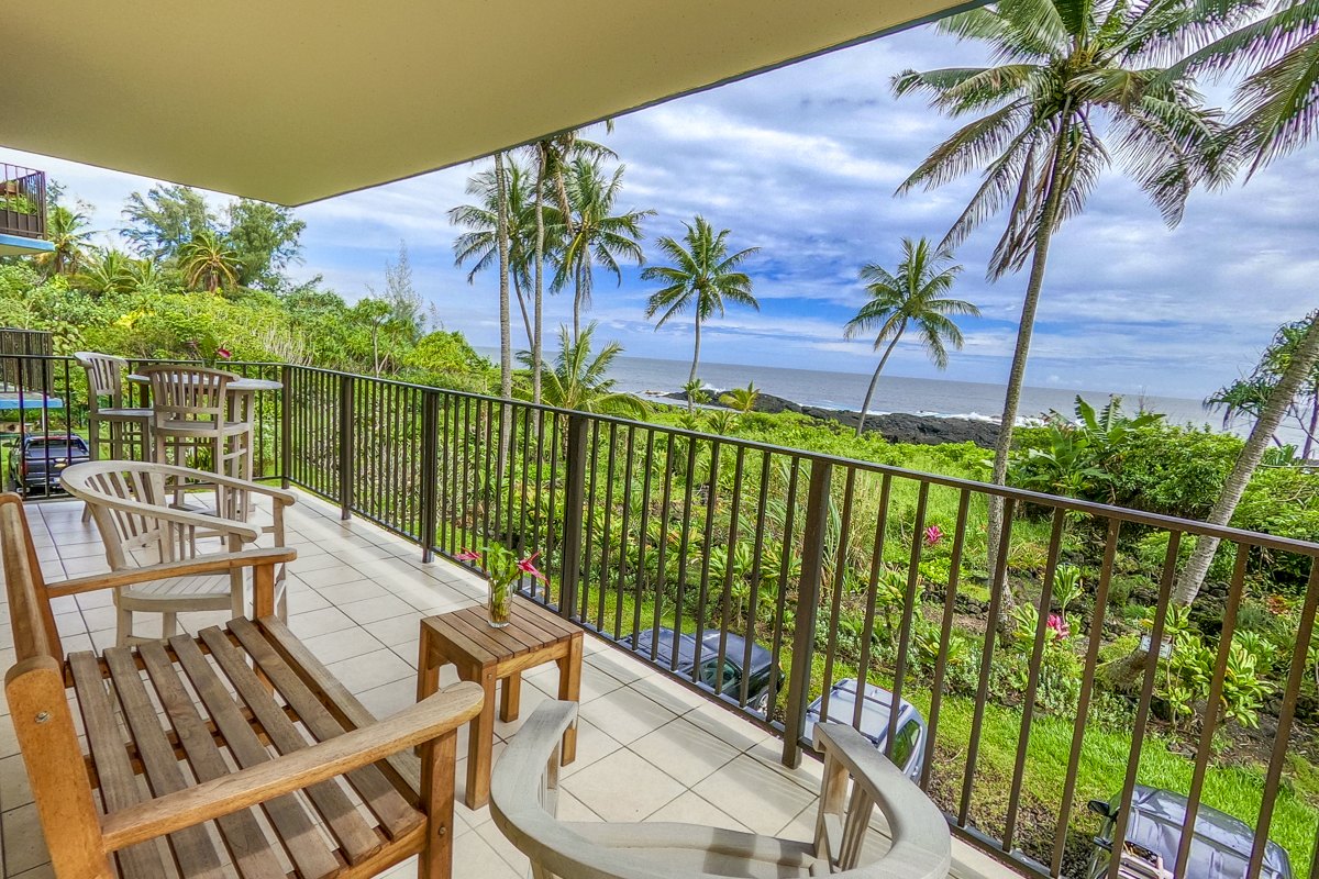 Ocean Dreaming? Make your dreams come true and set sail on a new adventure with this spectacular, ocean view unit. Whether relaxing on the spacious lanai, or lounging in bed, views of the ocean greet you, framed by palms and the community garden. Enjoy the breeze and soundtrack of the ocean waves, lookout for seasonal whales and dolphins, and lighted cruise ships gliding by. Prime location is adjacent to Richardson Beach Park on one side and Hawaii County land on the other. Ocean access for all types of watersports at Richardson Beach. Fully renovated, this unit is sure to please. Seller put thought and care into every aspect. Formerly a two-bedroom, the unit has been converted into a one-bedroom creating open living, dining & kitchen. Bright and airy, you can enjoy the flow and view throughout. The kitchen boasts a peninsula style, galley kitchen setup with extra wide counter space, bar seating, Thomasville cabinets, and full array of appliances. The bedroom features enormous slider windows, an en suite bath w/dual vanities, and custom tile shower. Amenities and Info: - Fully renovated including inside flooring, fixtures, cabinetry, windows, lanai deck and rails, doors & bathrooms. - Fully furnished. - Corian counters in kitchen & bathrooms. - Custom blinds, approx. five years old. - GE Washer/Dryer combo - new in 2024. - Frigidaire dishwasher - new in 2025. - Gas stove & dryer. - Track lighting, Hunter brand ceiling fans. - Multiple closets throughout unit. - All assessments paid in full, and all Association required & recommended updates are complete to date. - HOA controlled security monitoring. - Maintenance fee covers the electric, gas, water, pest, internet & association insurance. HOA provides hot water. - 2nd floor w/easy access to stairs and assigned parking stall, #18 in immediate proximity. - Inground pool. - Close to beach parks, snorkeling, shopping, dining and airport.