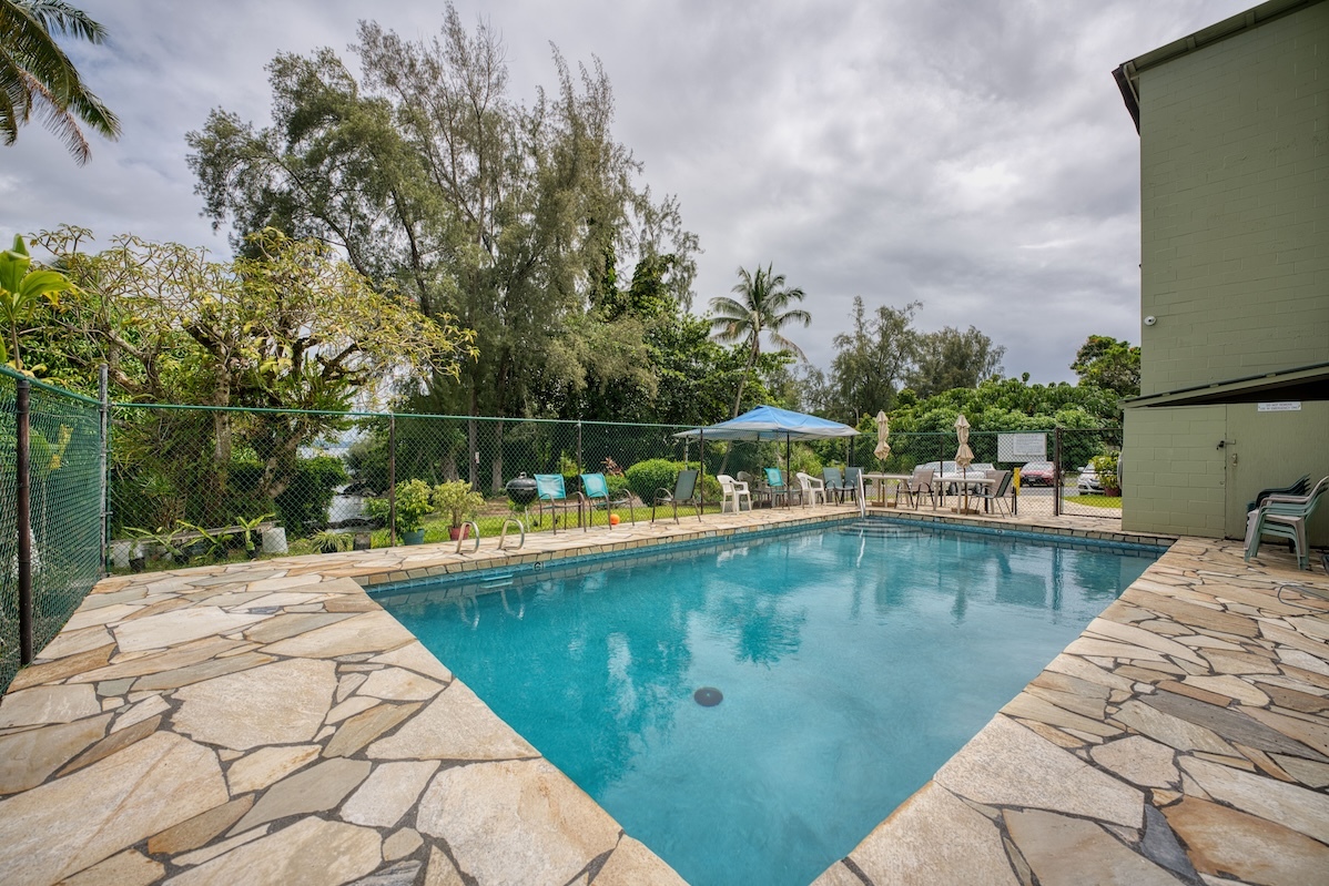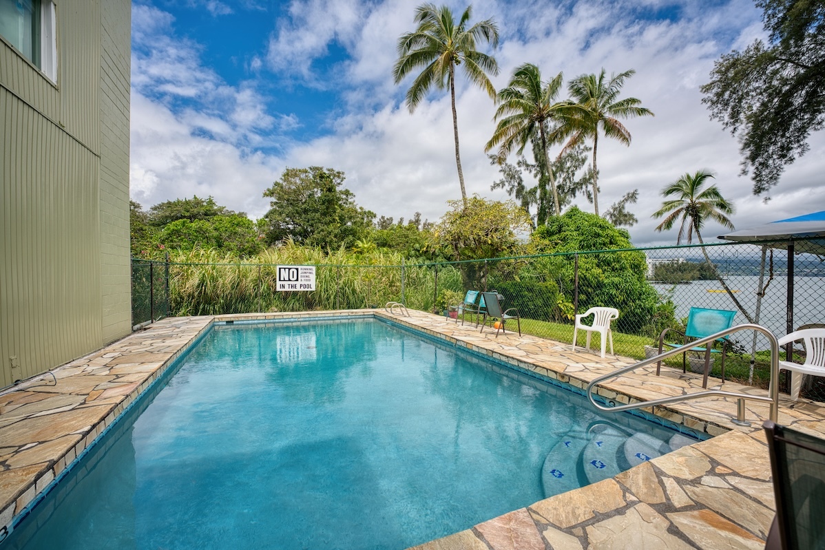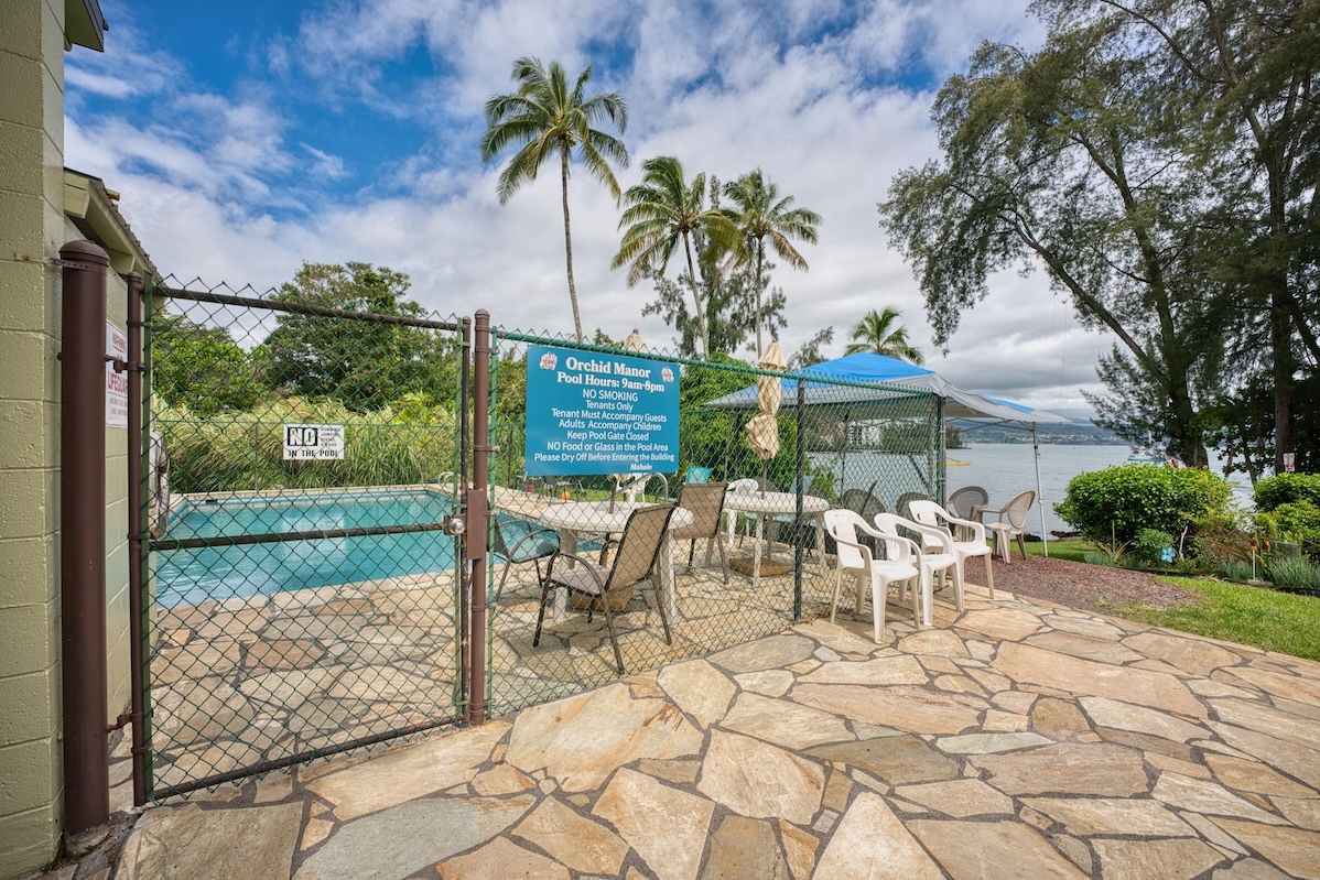 Third-floor studio at Orchid Manor on the desirable Hilo/Hamakua side of the building. This spacious 496 sq ft unit features an additional 80 sq ft lanai, providing comfortable indoor-outdoor living in a prime Hilo location. Conveniently located in the Keaukaha area near Lili?uokalani Gardens, Coconut Island, Banyan Drive, and Hilo Bayfront, with easy access to Downtown Hilo, the Hilo Farmers Market, restaurants, shops, and ocean parks. The unit includes a full-size refrigerator and a four-burner gas range for everyday convenience. Building amenities include secure entry with video surveillance, resident manager, elevator, community laundry, and an in-ground pool, all within a peaceful setting with Hilo Bay views. Monthly maintenance fee of $753.43 includes electricity, cable, Wi-Fi, water, sewer, gas, trash service, resident manager, building maintenance, and insurance–making this an easy, low-maintenance way to enjoy island living.