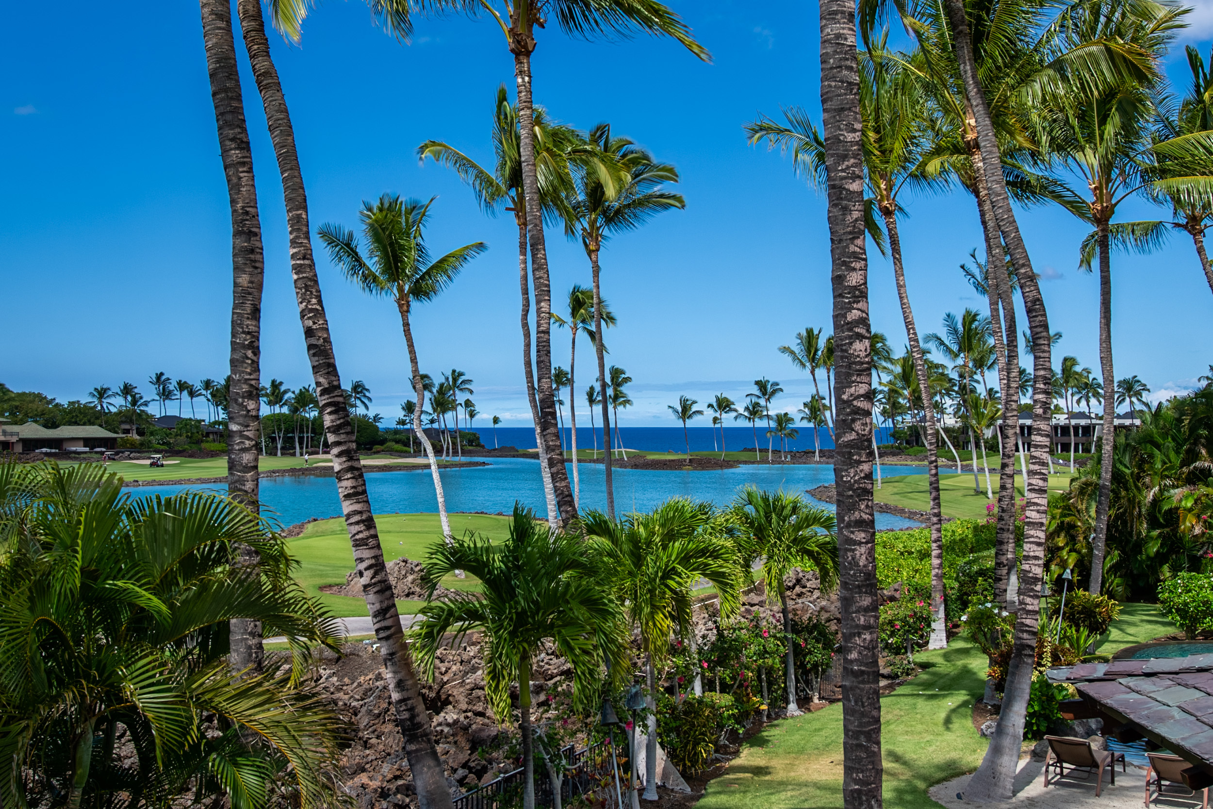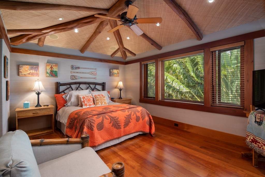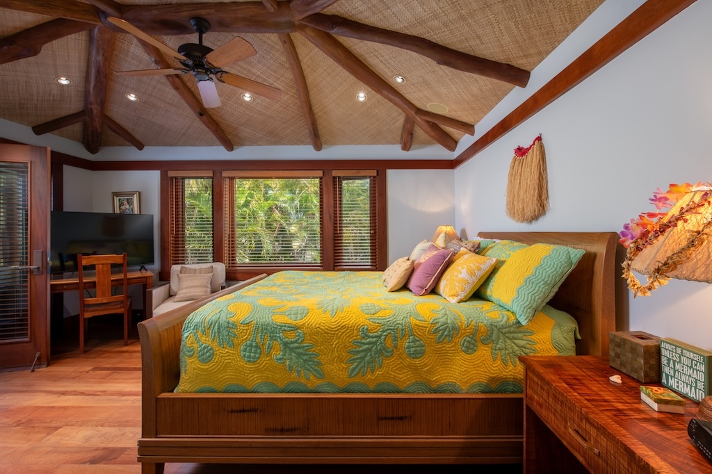 The private master retreat crowns the home with dual lanais, a wet bar, and sweeping views of the ocean, golf course, Mauna Kea, and Mauna Loa.