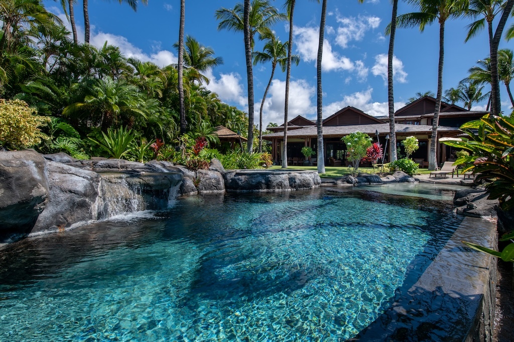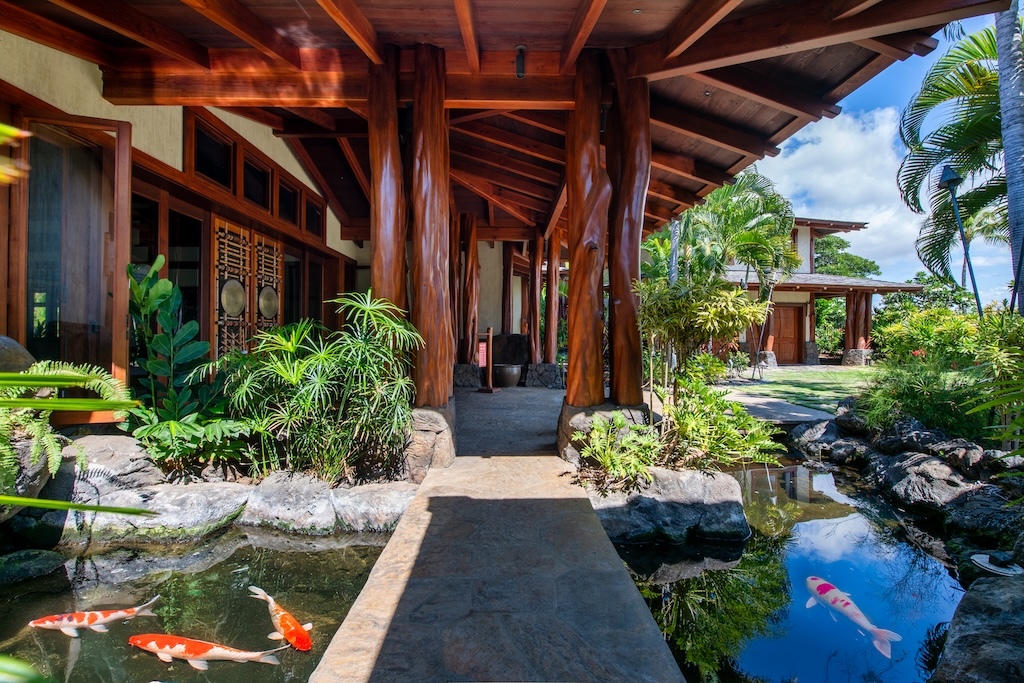 A curved bamboo bar, chef’s kitchen, game lounge, and entertainment area open seamlessly to the lanai – where waterfalls, koi ponds, and a resort-style pool and spa create the ultimate gathering place for family and friends.