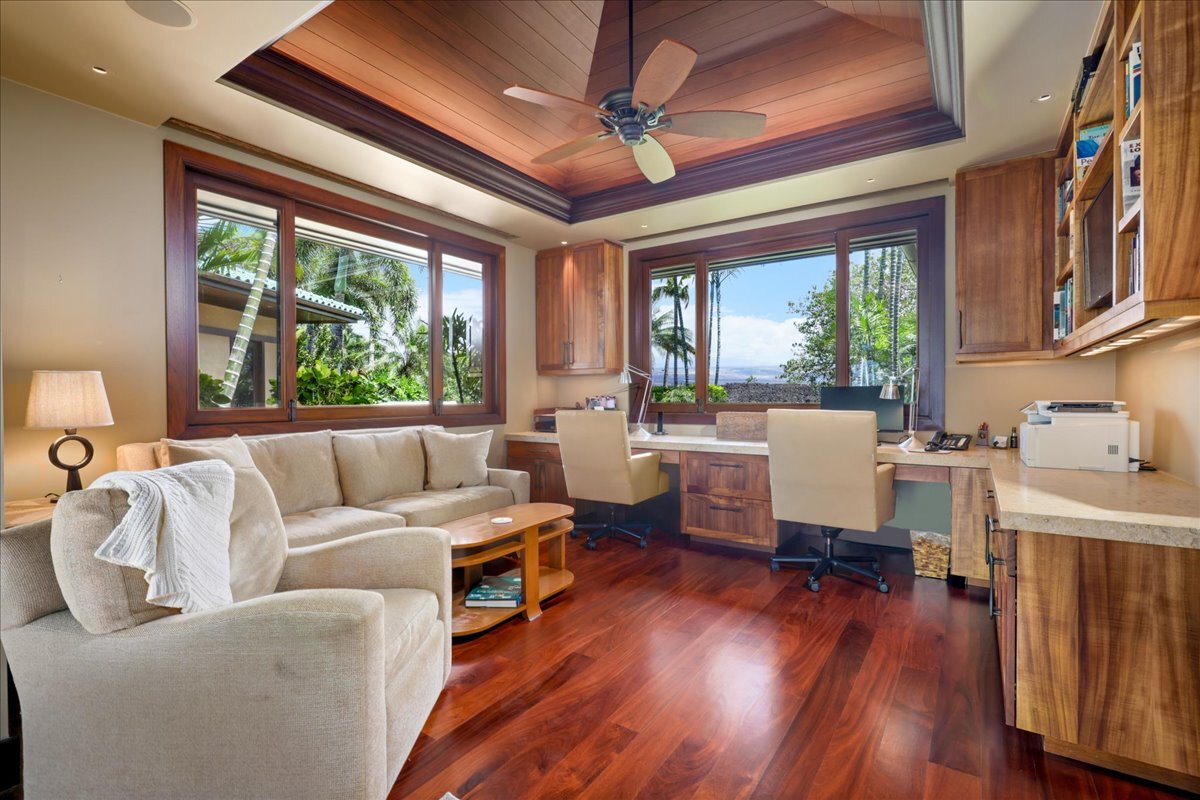 Kilohana sits on a 1.4-acre front-row site at the end of a private drive within the 49 Black Sand Beach neighborhood at Mauna Lani. Honoka’ope Bay, with its black sand beach and private community beach club, is less than a 90 second walk from the home. Overlooking the 7th hole of Mauna Lani’s south course, the property has over 275 feet of frontage on views of the ocean, waves crashing on the shoreline, Maui, and sunsets from four of the bedrooms and all living areas. The improvements are laid out as a small village retreat, with mature landscaping and stone pathways leading to the many private locations on the property, and include a solar field and putting green with a 45-yard pitch to the green. On the south side of the property, adjacent to the golf course buffer, sits the 1,750 square foot ocean view primary suite with a spacious two-station office, two full bathrooms, a large shower garden, and full laundry facilities. On the north side of the property are two detached 3 bedroom, 3 bath, 1,300 square foot guest hale, each with its own laundry facility and between the two hale, are an additional four outdoor shower gardens. The numerous pocket doors throughout beckon you to a 1,656 square foot lanai including a 600 square foot grand covered lanai with wet bar, dining area, sunken barbecue, with smoker and cooktop; almost 8,000 sf of indoor/outdoor living at its best! Large 3 car garage with private entrance, as well. The home was designed by Lucky Bennett and built by Clever Construction to exacting standards, which include mahogany pocket doors, windows, floors and trim, vaulted ceilings, a variety of custom stone and tile used throughout and a lengthy list of designer furnishings and art included in the sale. Meticulously designed and cared for by an owner who is in the real estate development business!