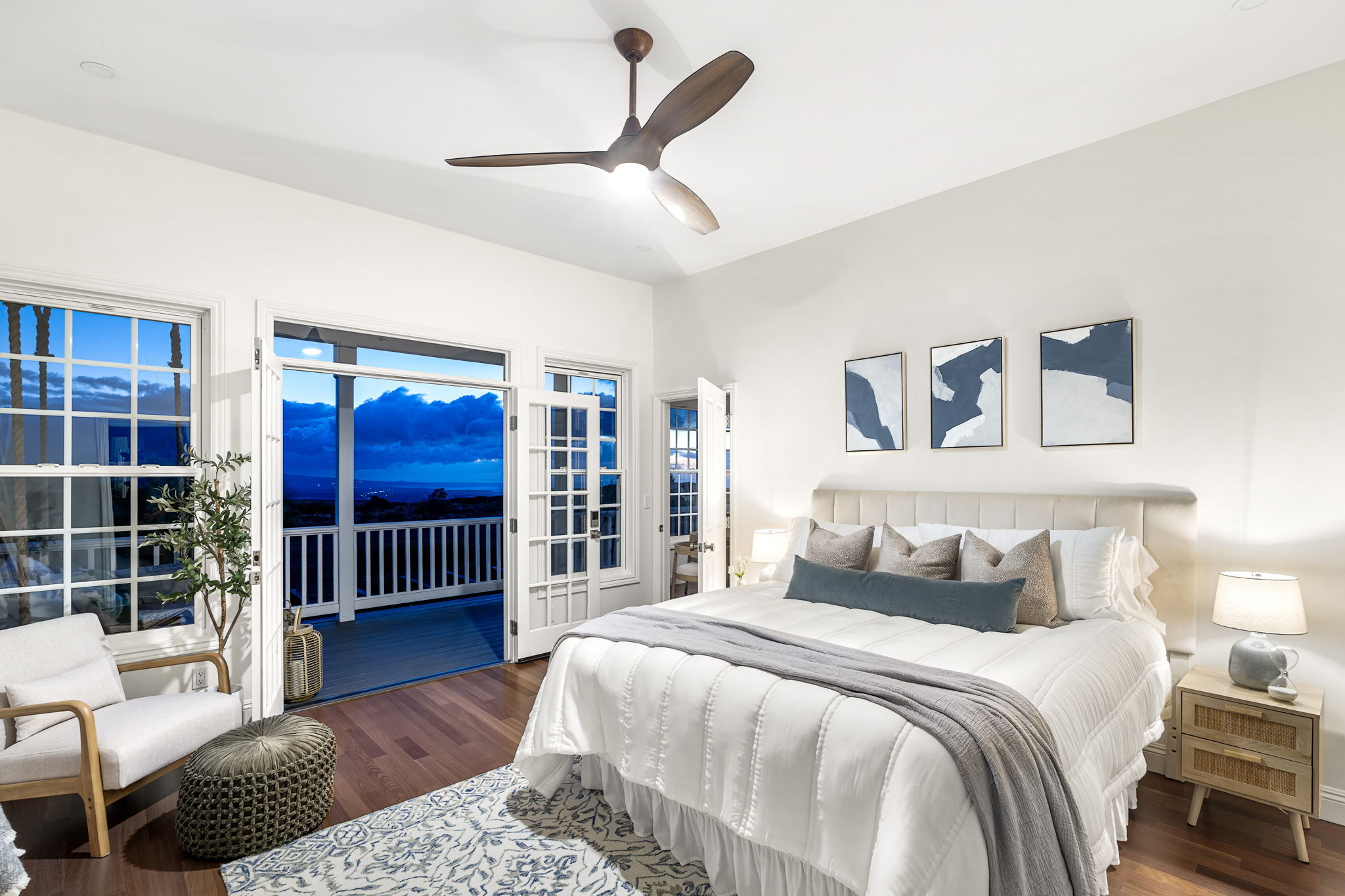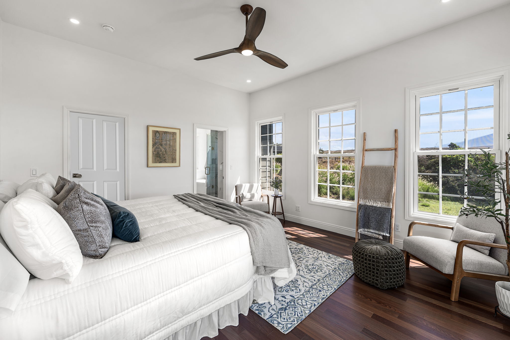 Set on three private acres in Anekona Estates, this fully renewed Waimea estate showcases panoramic ocean, coastline, sunset, sunrise and mountain views from Kohala to Mauna Kea and Hualalai. Extensively transformed and never lived in since completion, the home blends modern design with the warmth of Waimea living. The reimagined great room features vaulted ceilings, expanded living spaces, and a brand-new kitchen with custom cabinetry, quartz counters, and bar seating.