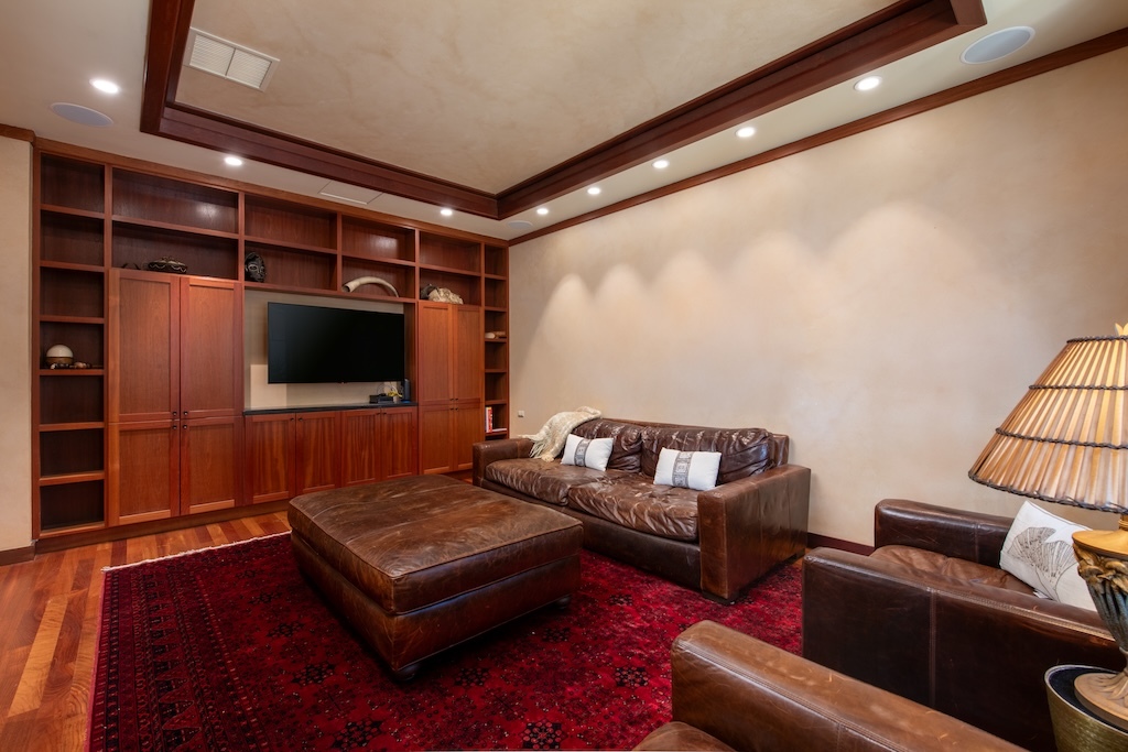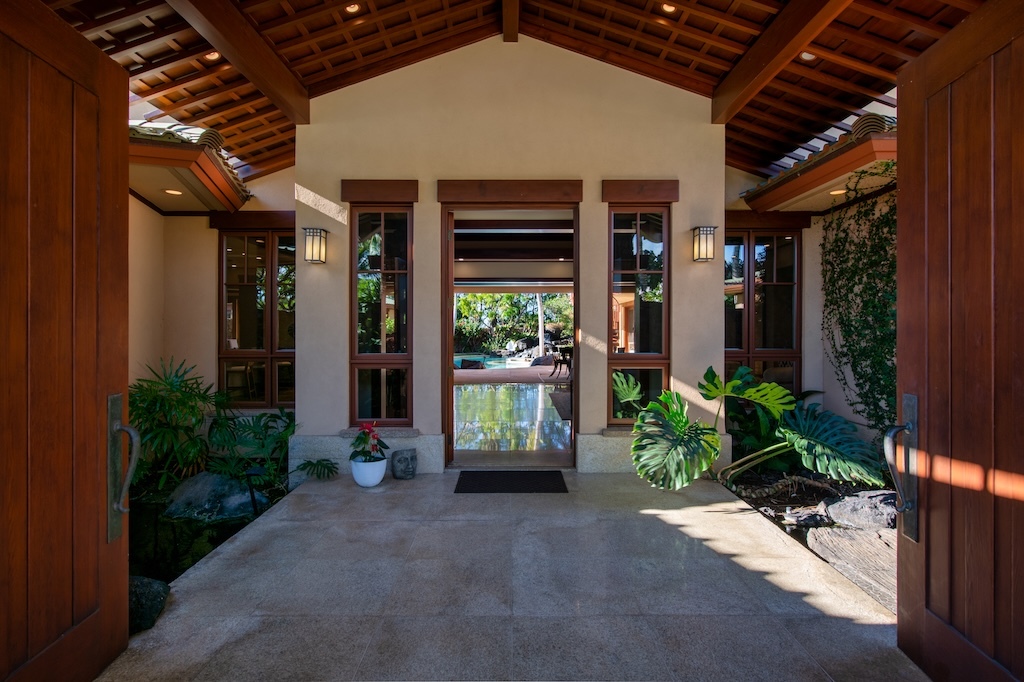 Handmade cedar gates open into a lush entry courtyard with a waterfall and pond. Designed for comfort and privacy, the property features an expansive primary suite on the upper level with a similar suite on the lower level, with 3 additional bedrooms along with a separate Ohana guest suite. A media room anchors the entertainment spaces, while the gourmet chef’s kitchen showcases high-end appliances, custom Brazilian cherry cabinetry and beautiful granite and hardwood floors throughout.