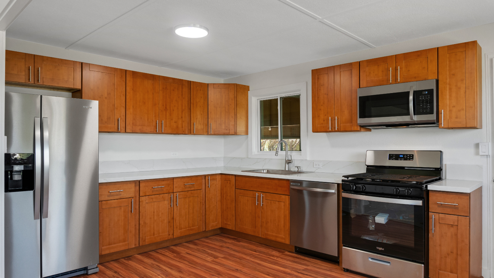 Step into a completely transformed living experience at 64-155 Puu Pulehu Loop. Originally a classic Waimea single-wall "Hicks Home," this property has been modernized for maximum comfort with energy-efficient dual-pane windows and the added insulation of drywall-finished interior walls. From the ground up, the original white oak hardwood floors have been refinished, complemented by new LVP flooring in the baths and kitchen. The kitchen features solid bamboo cabinetry, elegant quartz countertops, and brand-new appliances, including a gas range. Both bathrooms have been fully renovated, and new ceiling fans throughout ensure the perfect cross-breeze. Peace of mind comes standard with a brand-new roof and a fresh exterior paint job. Outside, the large carport and fenced backyard offer the ultimate setup for privacy, pets, storage, and entertaining. Situated on a corner lot across the street from a picturesque pasture, you are just a ten-minute drive from the center of Waimea town with its schools, shopping, medical facilities, and dining. A short drive from there to the finest beaches along the Kohala Coast.