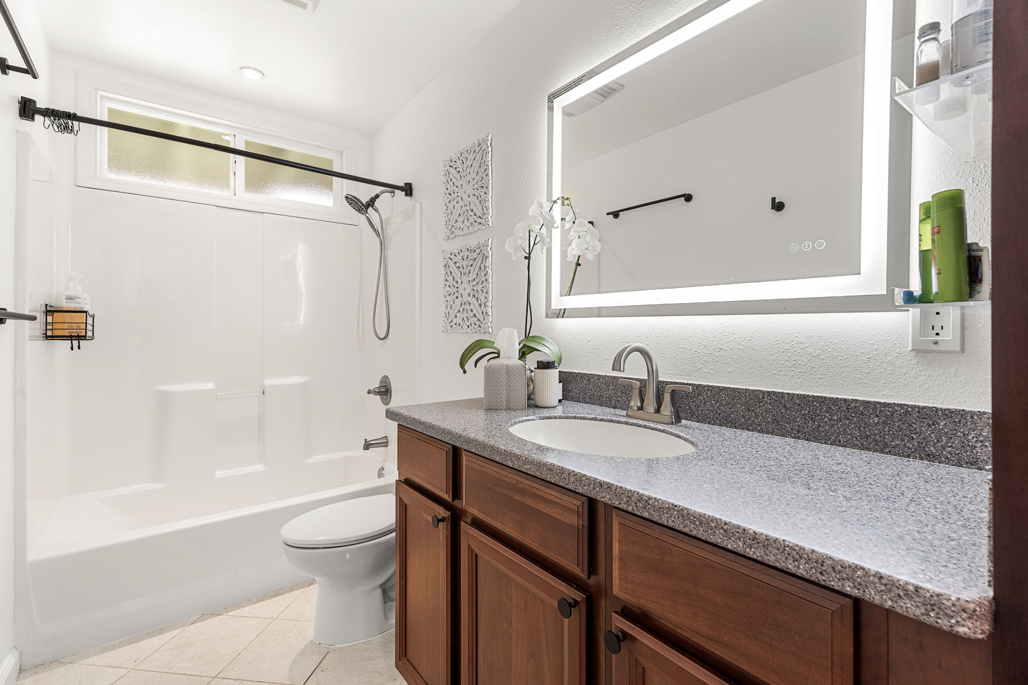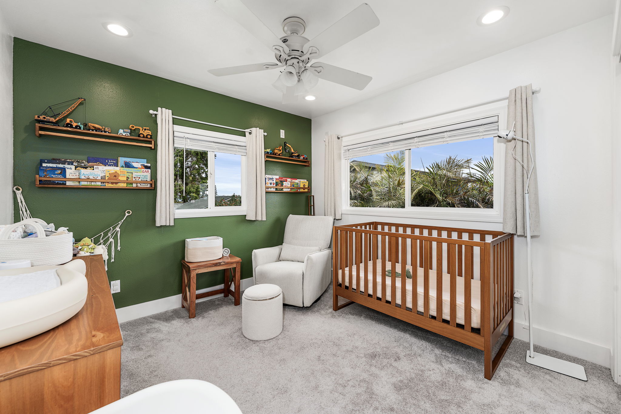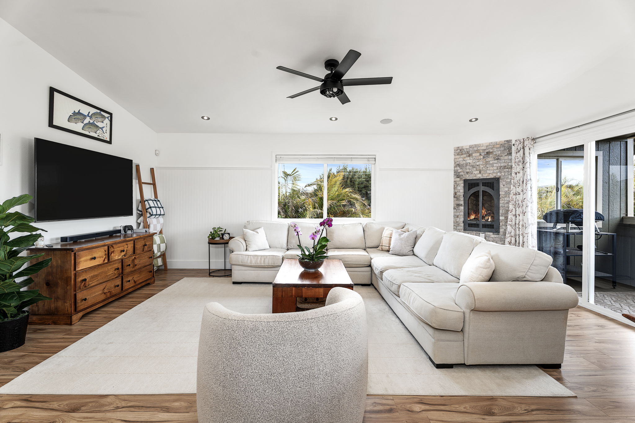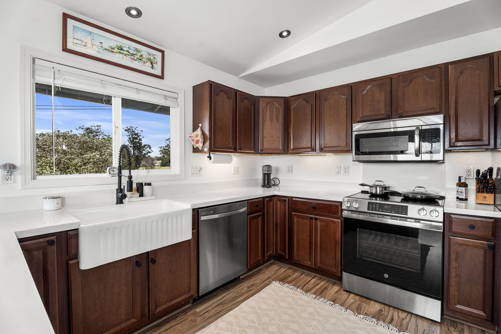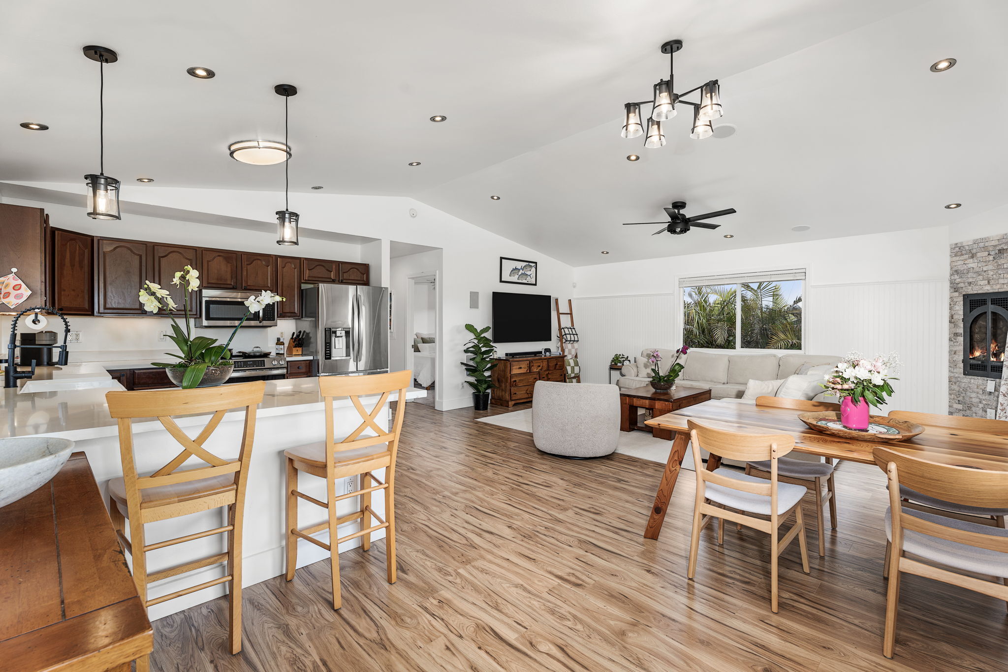 Perched in upcountry Waimea with sweeping views of Mauna Kea, this residence blends refined comfort with modern efficiency. The upper level offers 3 spacious bedrooms and 2 thoughtfully appointed bathrooms, while the lower level provides a private 1 bedroom, 1 bath suite with its own living area and separate entrance–ideal for guests or extended family. Every detail of the home reflects thoughtful care and recent high-end upgrades. In 2024—2025, the interior was enhanced with premium vinyl flooring, quartz countertops, fresh paint throughout, upgraded lighting and ceiling fans, custom window blinds, and plush new carpeting in all three upstairs bedrooms. Closets have been fully refreshed, and the kitchen is complete with a new oven and dishwasher (2025). The finished 2 car garage features new drywall and a sleek epoxy floor, while a newly installed gate and fencing secure the backyard, offering privacy and peace of mind. Energy efficiency is elevated with a net-metered photovoltaic system, complemented by a gas fireplace and gas hot water system for year-round comfort and reduced utility costs. Immaculate, low-maintenance, and move-in ready, this exceptional Waimea home delivers effortless comfort and refined living against the backdrop of one of Hawai?i’s most iconic mountain views.
