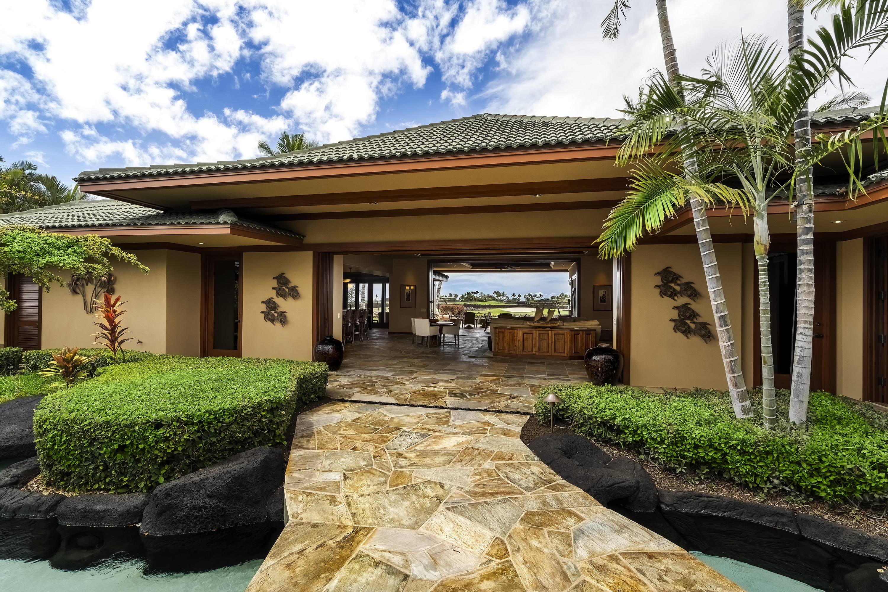 Exquisite One Ocean/Ke Kailani home only steps from the stunning Francis H. I’i Brown Mauna Lani golf course fairway! A fabulous one of a kind Lucky Bennett designed home features African Mahogany cabinets, Mahogany pocket doors & beams in living areas. The entrance gates lead you to a walkway that displays a tranquil setting with koi ponds & tropical landscaping surrounded by three separate guest bedrooms with en suite bathrooms & outdoor garden showers. This walkway connects the main hale to the gourmet kitchen, the dining area, the living room plus an office & the master suite with majestic views. A spectacular open floor plan offers a seamless flow from the main living areas and the guest quarters. The property showcases an elegant definition of indoor/outdoor living by providing complete privacy for 4,063 square feet of air-conditioned living area and over 1500 square feet of lanai. Ready to move into, this unique, beautiful island-themed home opens to an expansive covered lanai and spectacular golf and mountain views. Enjoy relaxing in the spa, swimming in the free form heated pool, cooling off by the pool bar or entertaining by the dining pavilion!