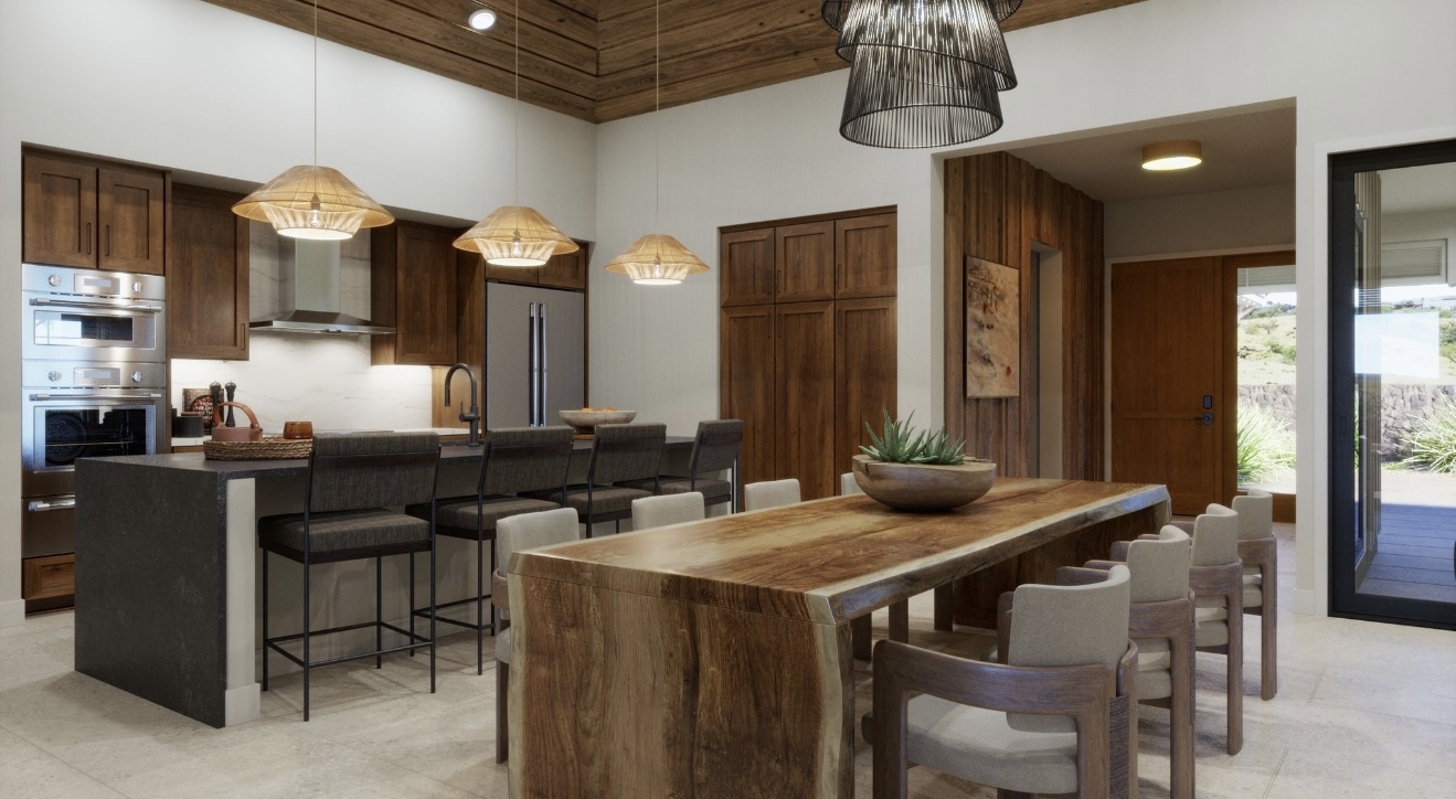 This showcase new home of more than 2090 sq. ft., is a classic reference to Hawaiian-inspired architecture with modern comforts. Expansive wrap around tiled lanais provide sheltered spaces to take in the spectacular ocean and sunset vistas and invite year-round outdoor living.