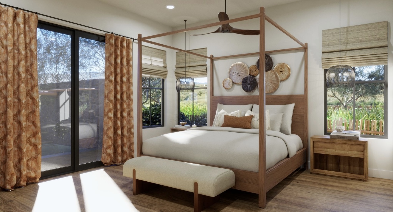 Inside, the airy single story layout flows seamlessly with 4 bedrooms 2 and one half baths and an optional multi-generational suite offering fabulous flexibility. The ground-floor primary suite offers privacy and convenience, with wood flooring, large windows opening to the lanai, and a spa-like ensuite featuring dual sinks and a deep soaking tub,.