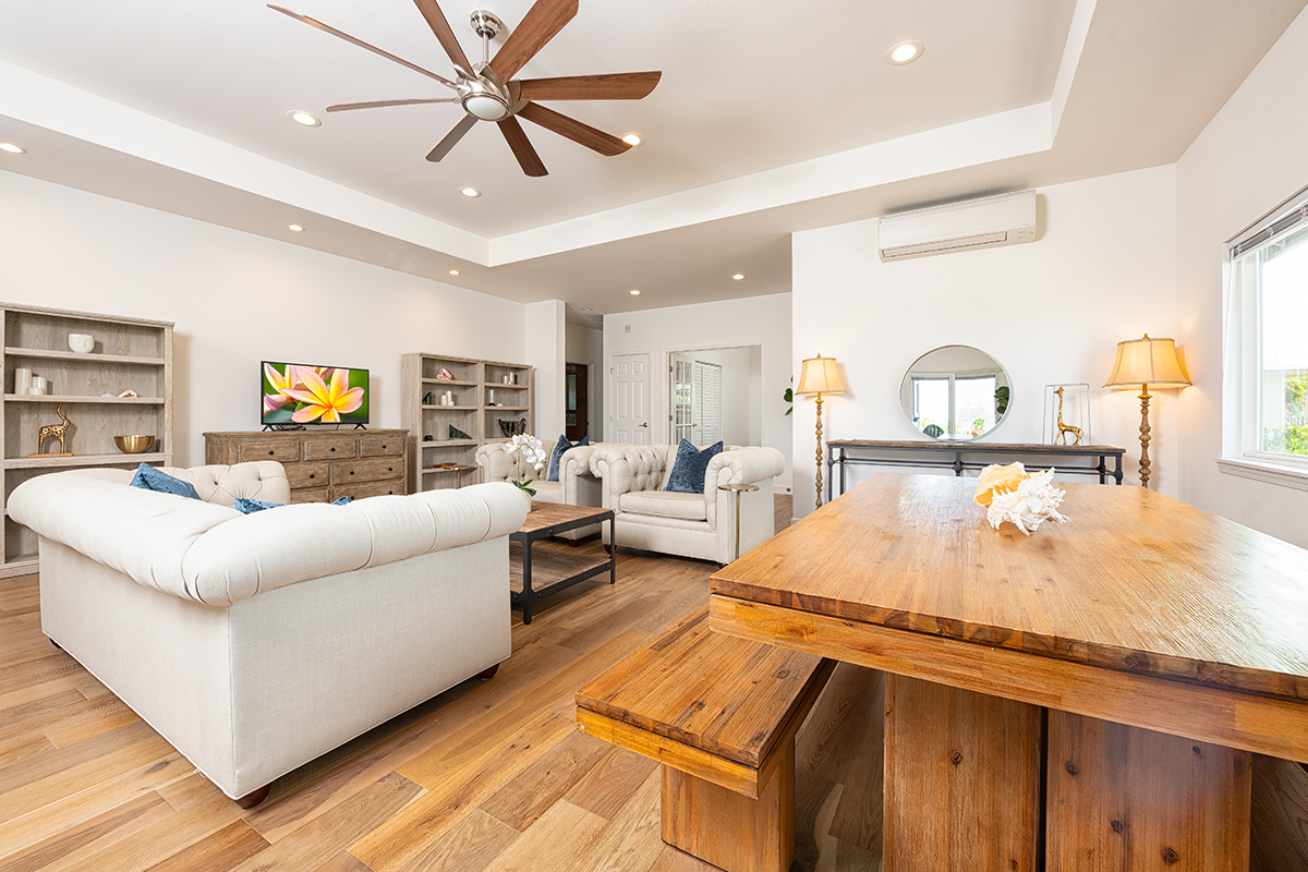 Nestled at the end of a quiet cul-de-sac, the property offers exceptional privacy – no front neighbors, a garage buffering the back neighbor, a scenic trail to the left, and a service road on the right. Step outside to a tranquil 30-minute nature walk leading to a wind turbine lookout, or enjoy unbeatable convenience to Waikoloa Plaza (2 min), Waikoloa Beach Resort (10 min), Waimea (20 min), and Costco (30 min).
