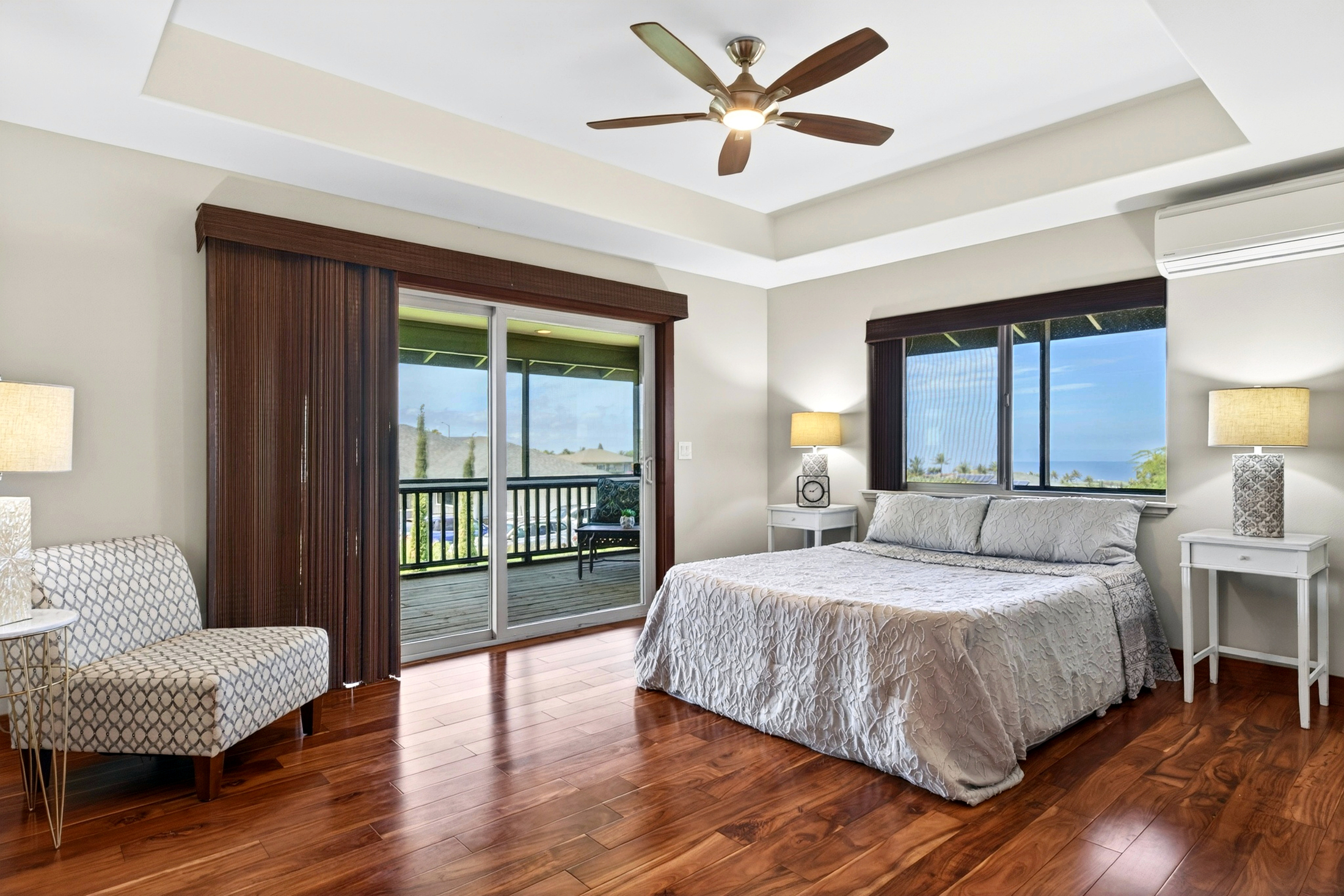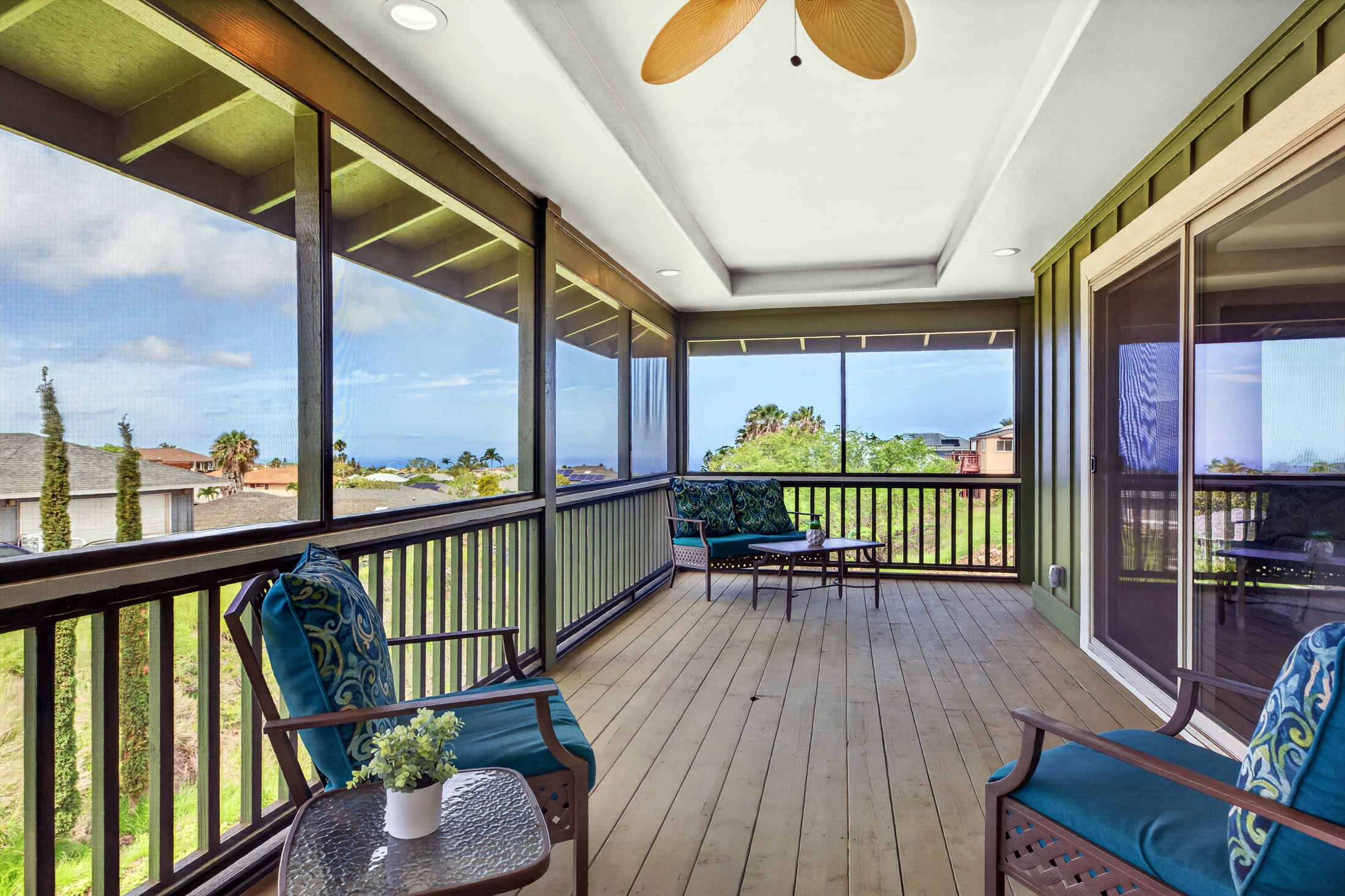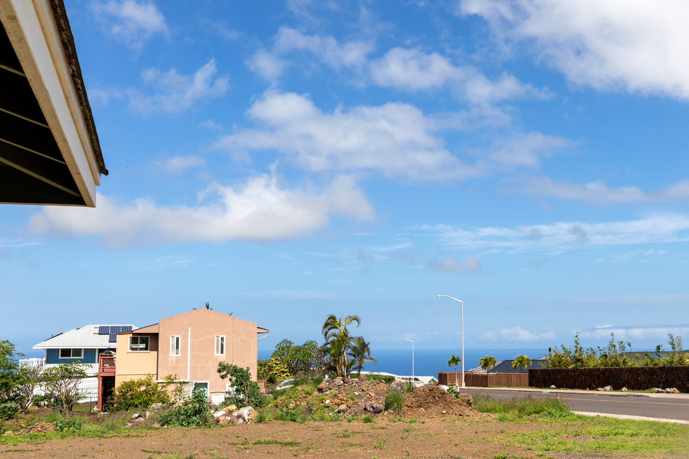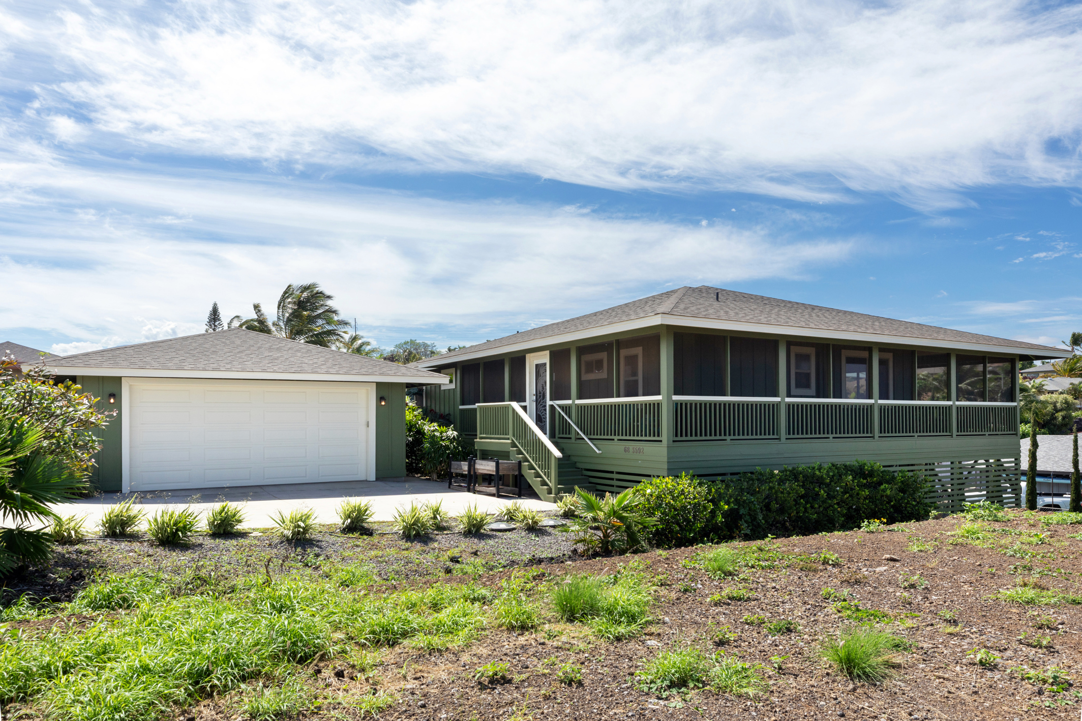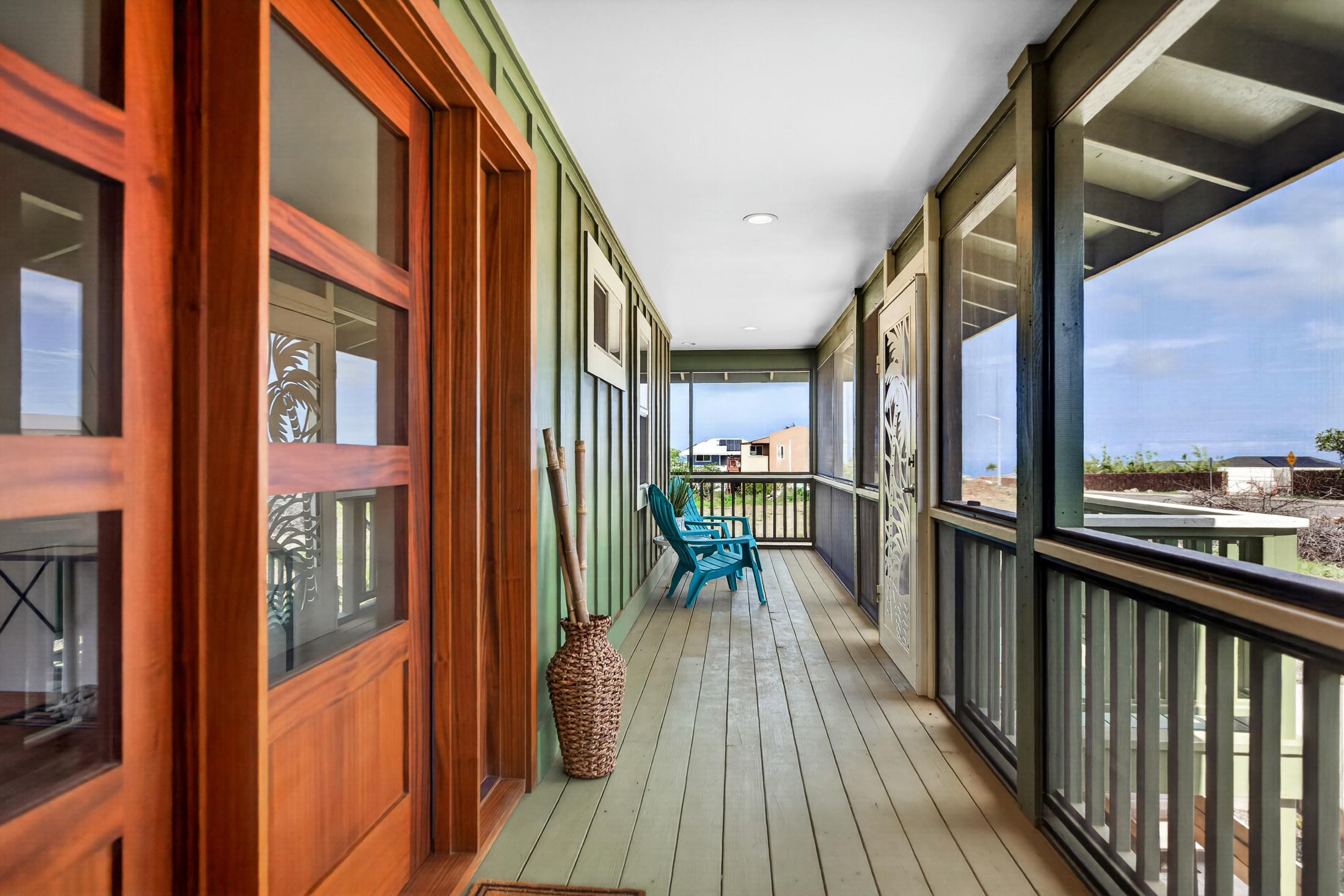 Exceptional quality, pristine condition, and island living at its finest. This beautifully crafted 3-bedroom, 2-bath home, built in 2016, offers 1,580 sq ft of thoughtfully designed living space on a 10,169 sq ft lot, capturing stunning views in every direction–including Kohala Mountain views from the front and ocean views from the back. The open-concept floor plan is enhanced by a wraparound lanai, creating seamless indoor-outdoor living ideal for relaxing or entertaining. The kitchen features granite countertops, custom mahogany cabinetry, stainless steel appliances, and generous workspace. A spacious combination pantry and laundry room adds exceptional functionality with ample storage and convenience. Rich Tigerwood flooring runs throughout the home, complemented by custom mahogany doors and detailed trim work that highlight the craftsmanship and elevate the overall aesthetic. Large windows and sliding doors invite in natural light while framing the surrounding views. Enjoy year-round comfort with split air conditioning in every room, allowing for personalized climate control throughout the home. The expansive 738 sq ft fully screened-in lanai is perfect for dining, lounging, and taking in the ocean views and island breezes. The primary suite offers a private retreat with ocean views from the bedroom and a spa-like en suite bathroom featuring a soaking tub. Exceptionally maintained and in pristine condition, this home delivers the perfect blend of quality construction, comfort, and the Hawaii lifestyle.