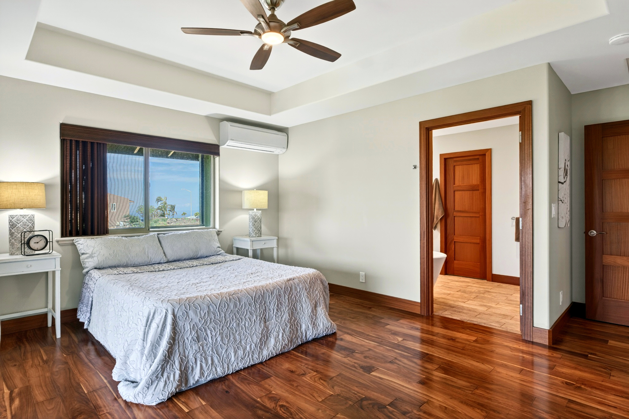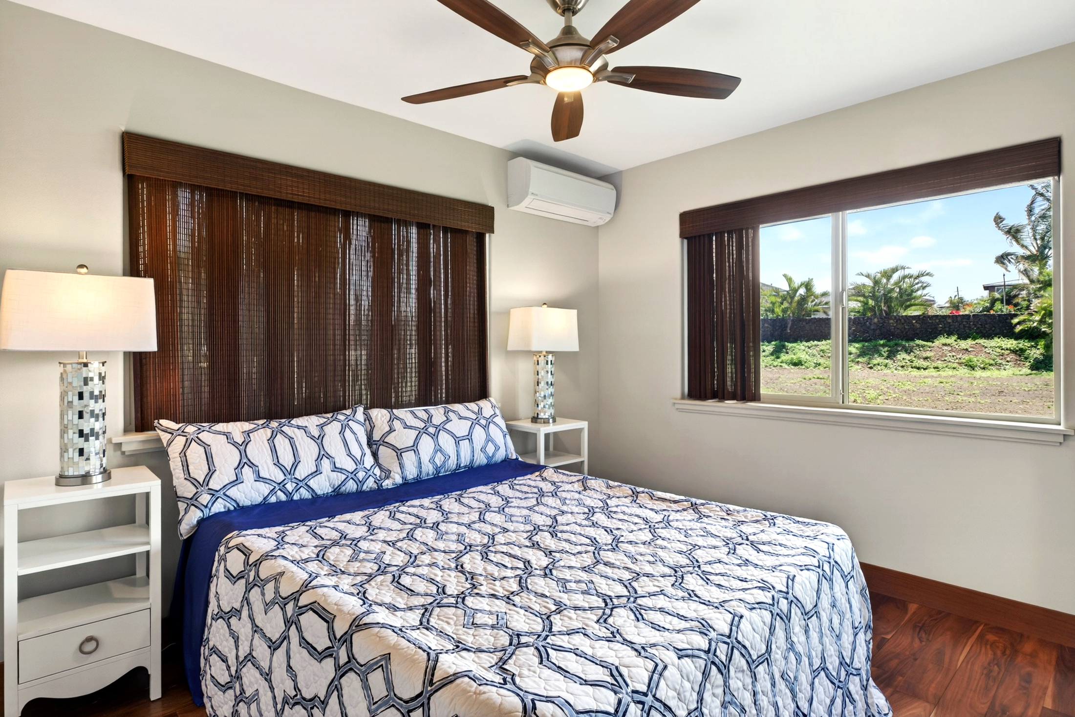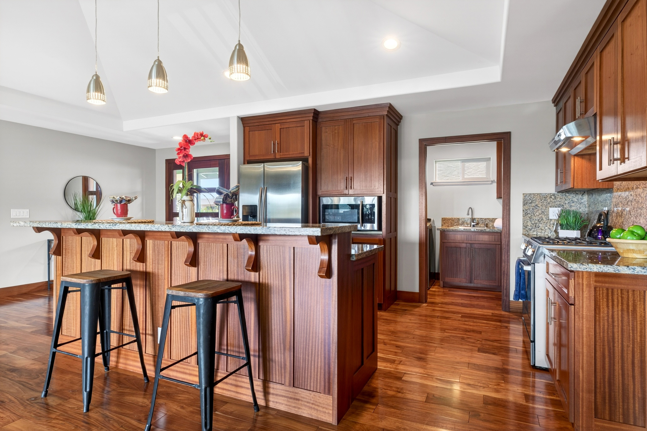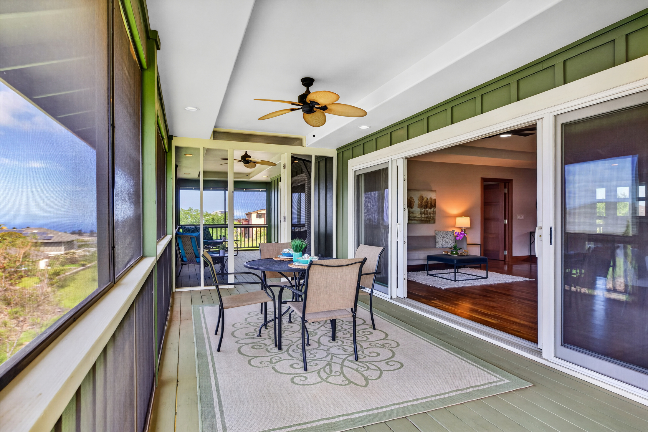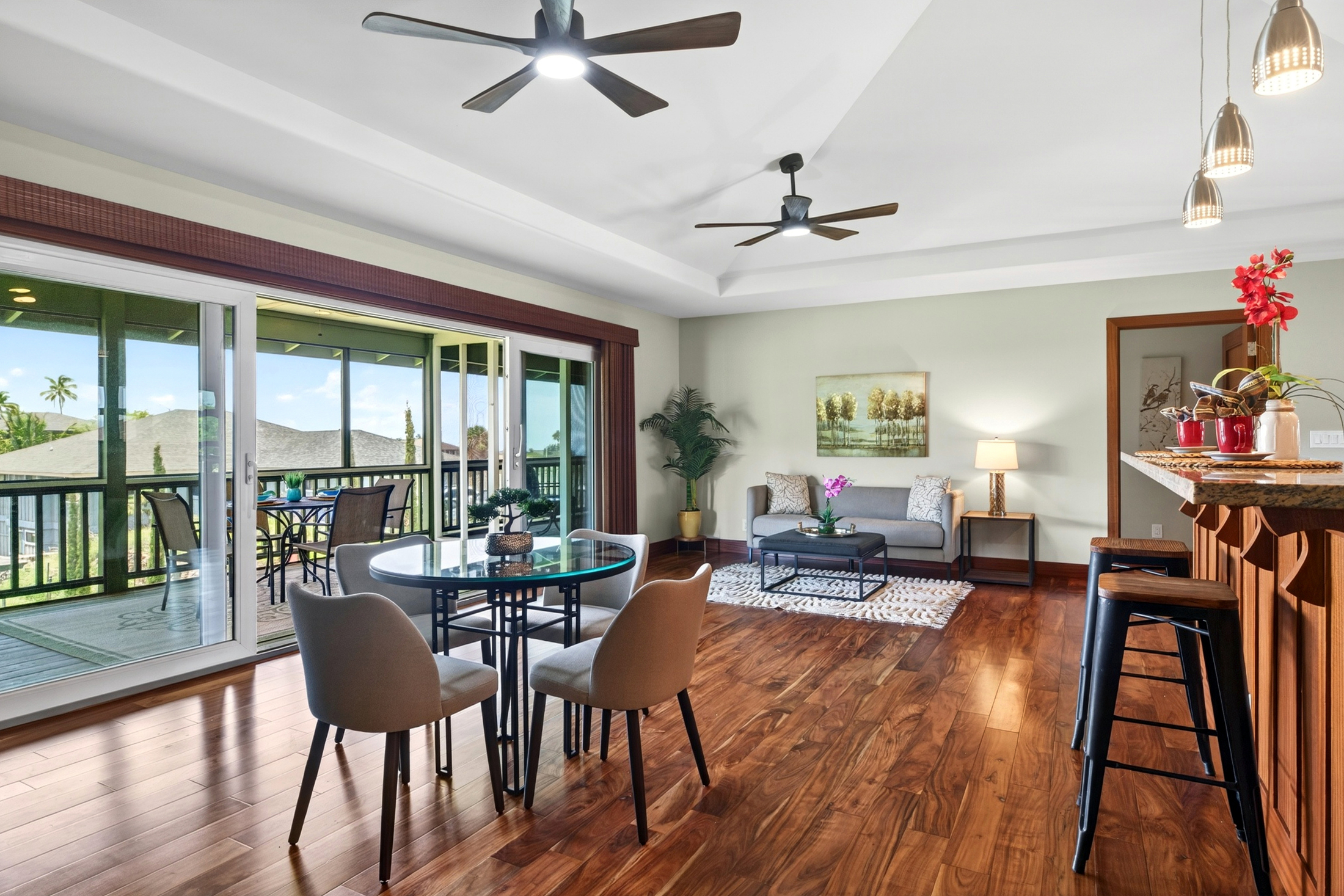 Exceptional quality, pristine condition, and island living at its finest. This beautifully crafted 3-bedroom, 2-bath home, built in 2016, offers 1,580 sq ft of thoughtfully designed living space on a 10,169 sq ft lot, capturing stunning views in every direction–including Kohala Mountain views from the front and ocean views from the back. The open-concept floor plan is enhanced by a wraparound lanai, creating seamless indoor-outdoor living ideal for relaxing or entertaining. The kitchen features granite countertops, custom mahogany cabinetry, stainless steel appliances, and generous workspace. A spacious combination pantry and laundry room adds exceptional functionality with ample storage and convenience. Rich Tigerwood flooring runs throughout the home, complemented by custom mahogany doors and detailed trim work that highlight the craftsmanship and elevate the overall aesthetic. Large windows and sliding doors invite in natural light while framing the surrounding views. Enjoy year-round comfort with split air conditioning in every room, allowing for personalized climate control throughout the home. The expansive 738 sq ft fully screened-in lanai is perfect for dining, lounging, and taking in the ocean views and island breezes. The primary suite offers a private retreat with ocean views from the bedroom and a spa-like en suite bathroom featuring a soaking tub. Exceptionally maintained and in pristine condition, this home delivers the perfect blend of quality construction, comfort, and the Hawaii lifestyle.