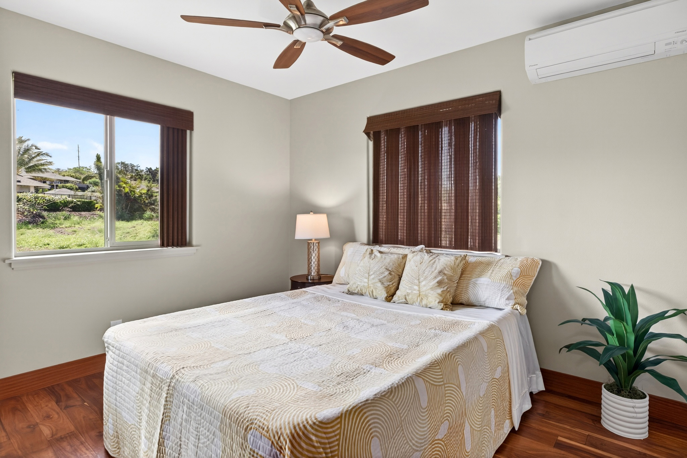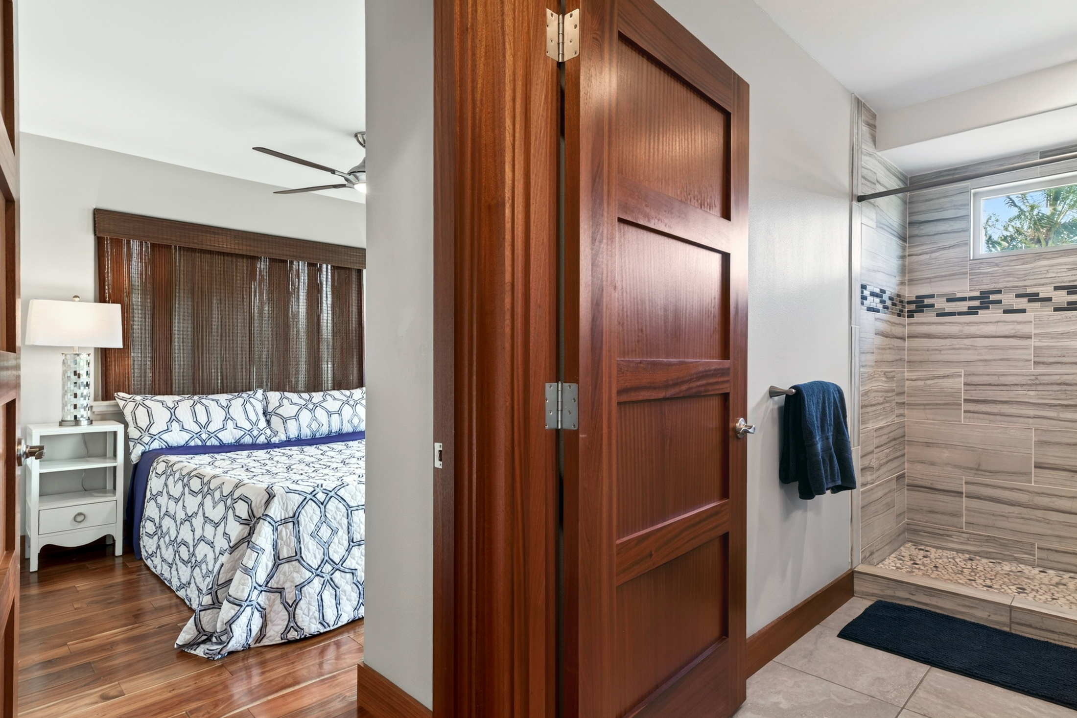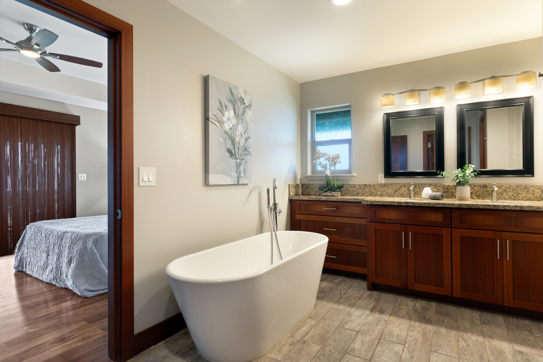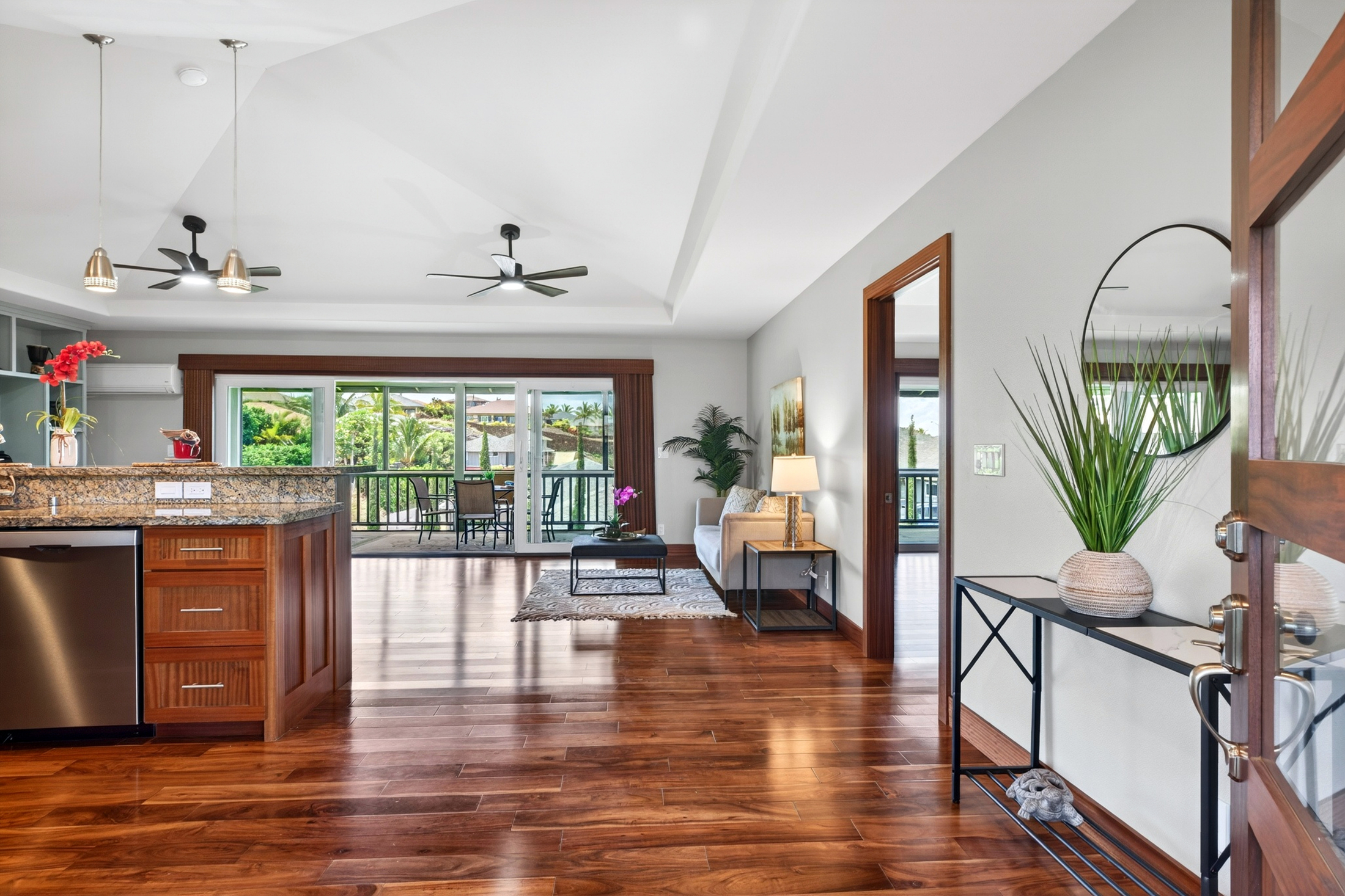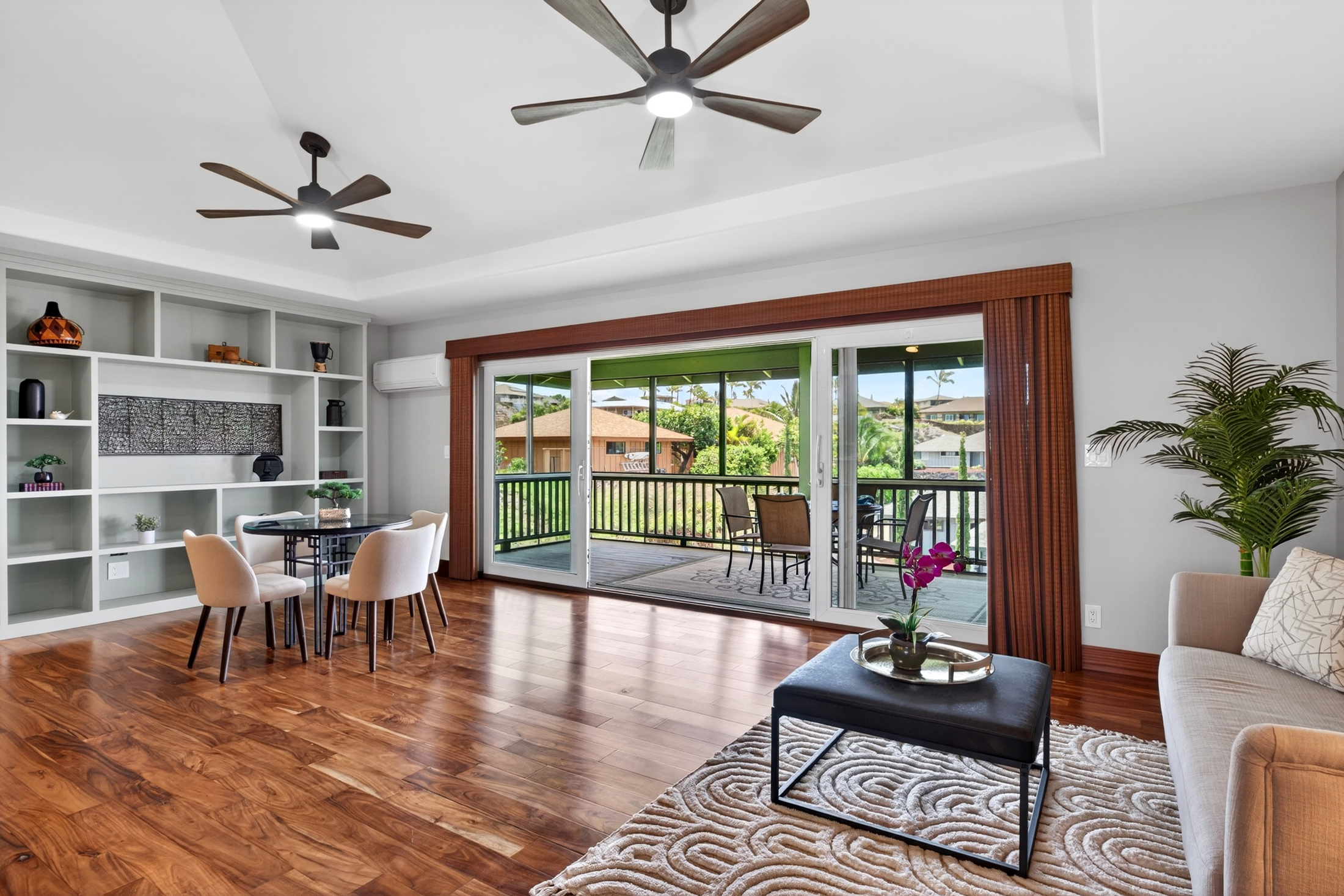 Exceptional quality, pristine condition, and island living at its finest. This beautifully crafted 3-bedroom, 2-bath home, built in 2016, offers 1,580 sq ft of thoughtfully designed living space on a 10,169 sq ft lot, capturing stunning views in every direction–including Kohala Mountain views from the front and ocean views from the back. The open-concept floor plan is enhanced by a wraparound lanai, creating seamless indoor-outdoor living ideal for relaxing or entertaining. The kitchen features granite countertops, custom mahogany cabinetry, stainless steel appliances, and generous workspace. A spacious combination pantry and laundry room adds exceptional functionality with ample storage and convenience. Rich Tigerwood flooring runs throughout the home, complemented by custom mahogany doors and detailed trim work that highlight the craftsmanship and elevate the overall aesthetic. Large windows and sliding doors invite in natural light while framing the surrounding views. Enjoy year-round comfort with split air conditioning in every room, allowing for personalized climate control throughout the home. The expansive 738 sq ft fully screened-in lanai is perfect for dining, lounging, and taking in the ocean views and island breezes. The primary suite offers a private retreat with ocean views from the bedroom and a spa-like en suite bathroom featuring a soaking tub. Exceptionally maintained and in pristine condition, this home delivers the perfect blend of quality construction, comfort, and the Hawaii lifestyle.