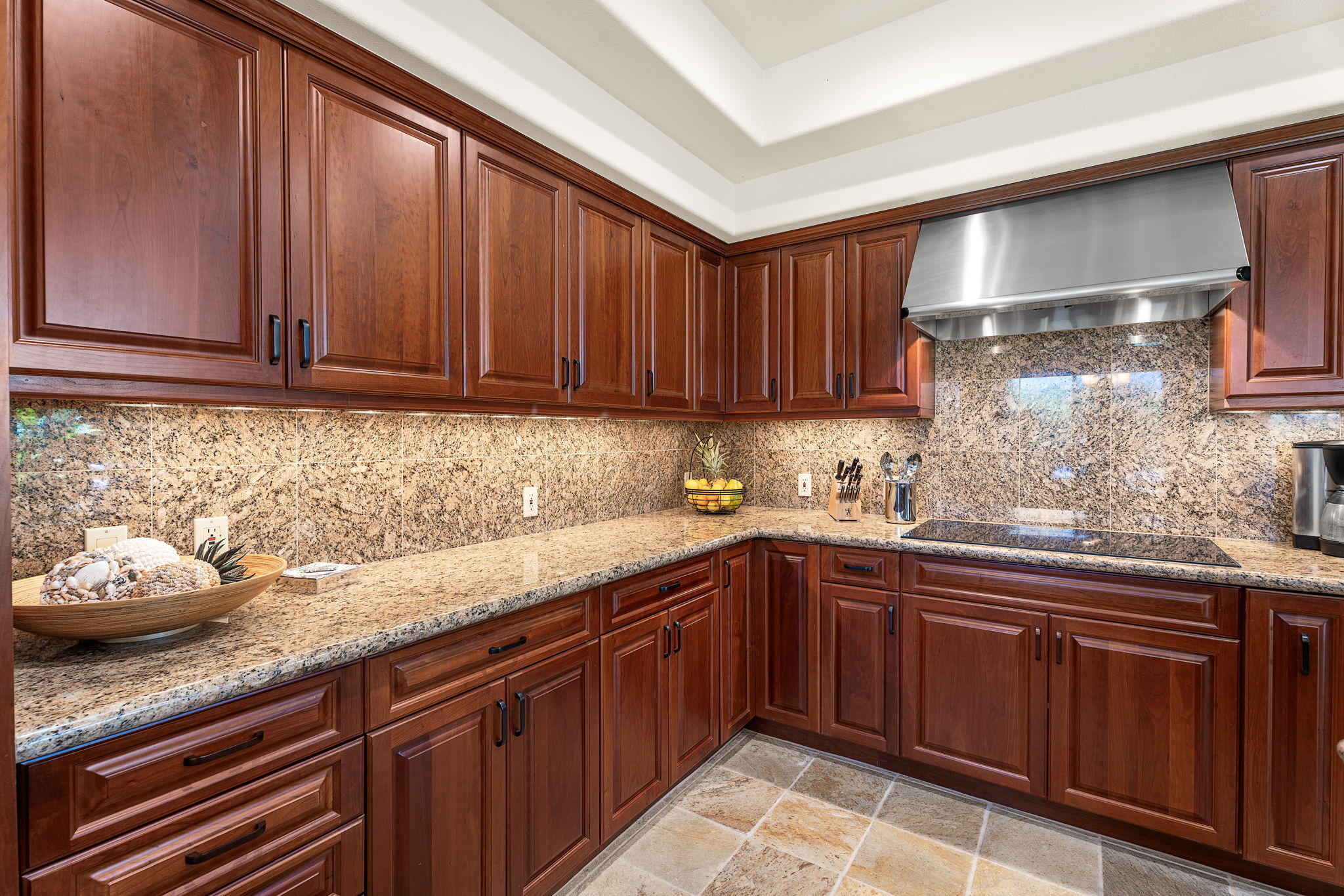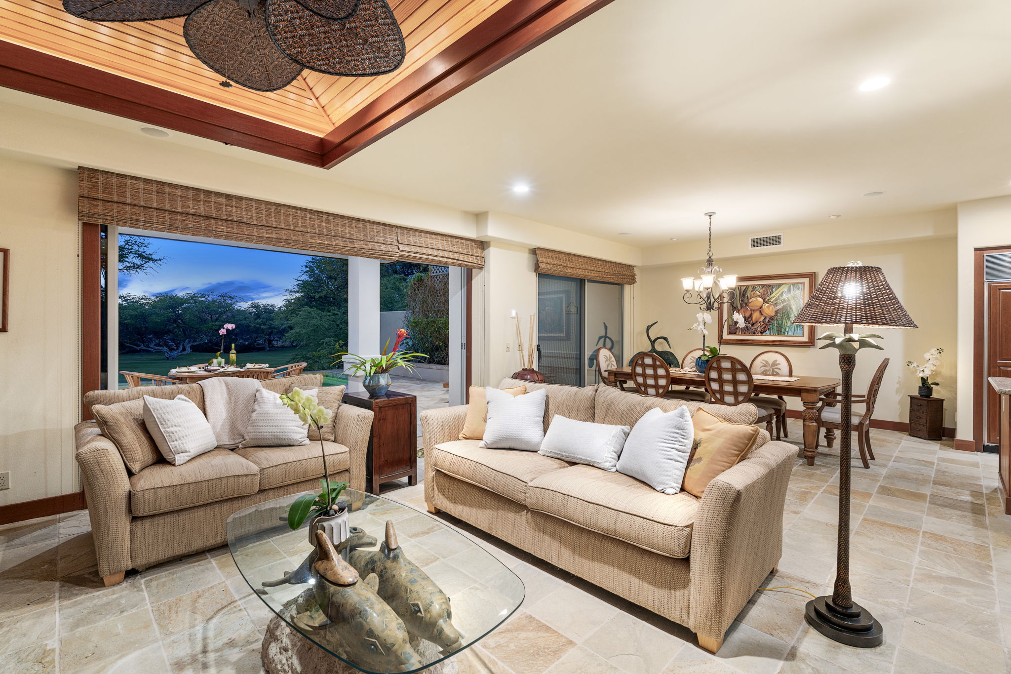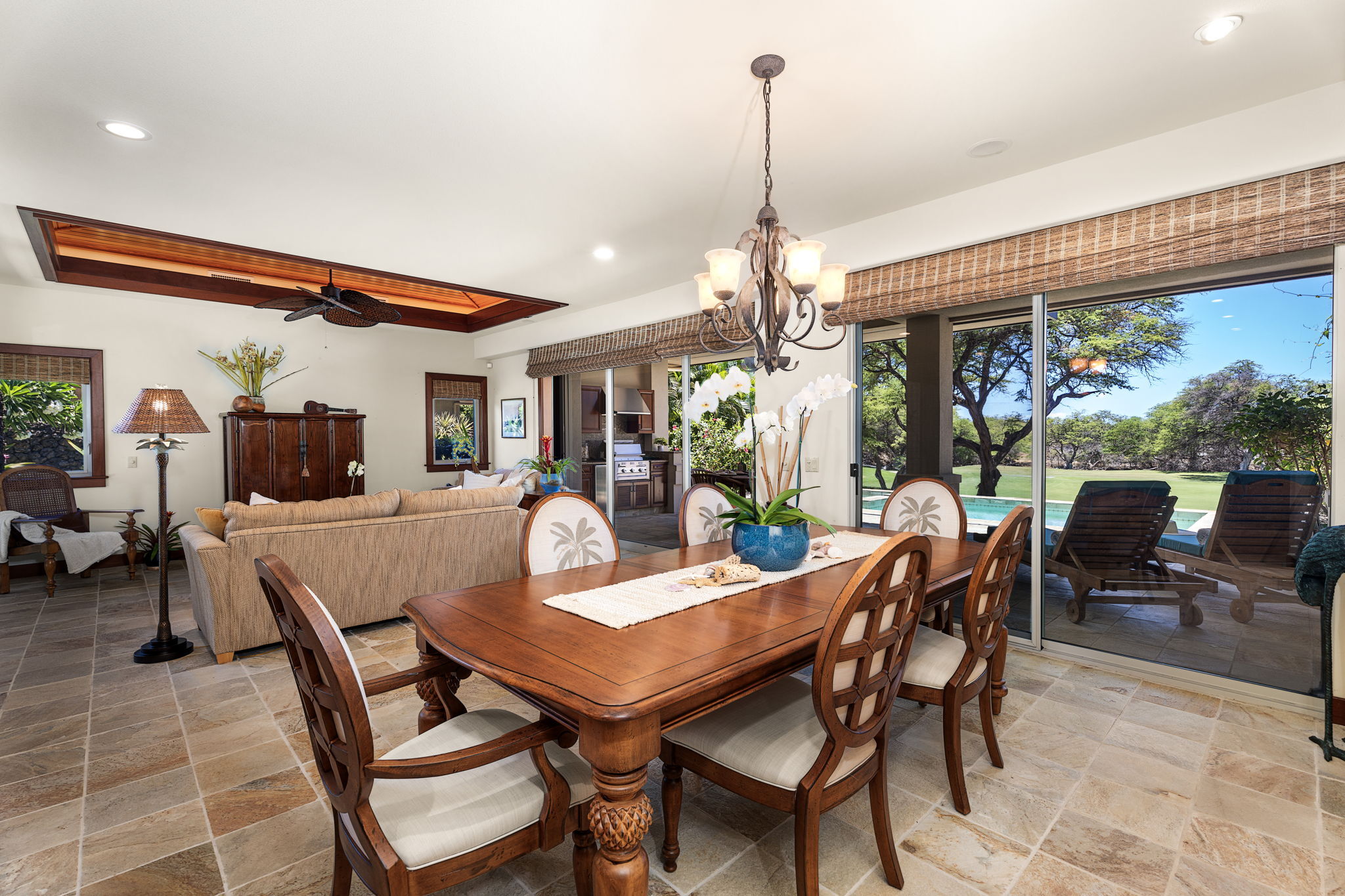 Built by Maryl Construction, the residence features solid mahogany doors, custom millwork, vaulted ceilings, and elegant quartzite flooring that flows seamlessly from the open-concept interior to the deep covered lanai. Designed for effortless indoor-outdoor living, the lanai includes a built-in BBQ, beverage cooler, and wet bar–ideal for entertaining or relaxing poolside in your private tropical oasis.