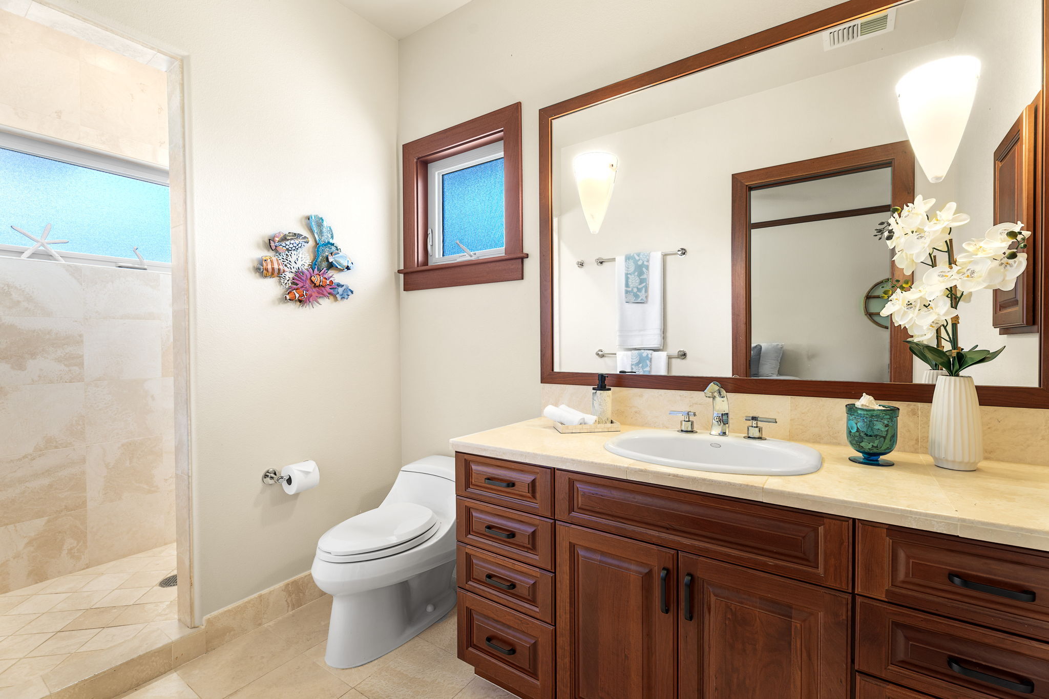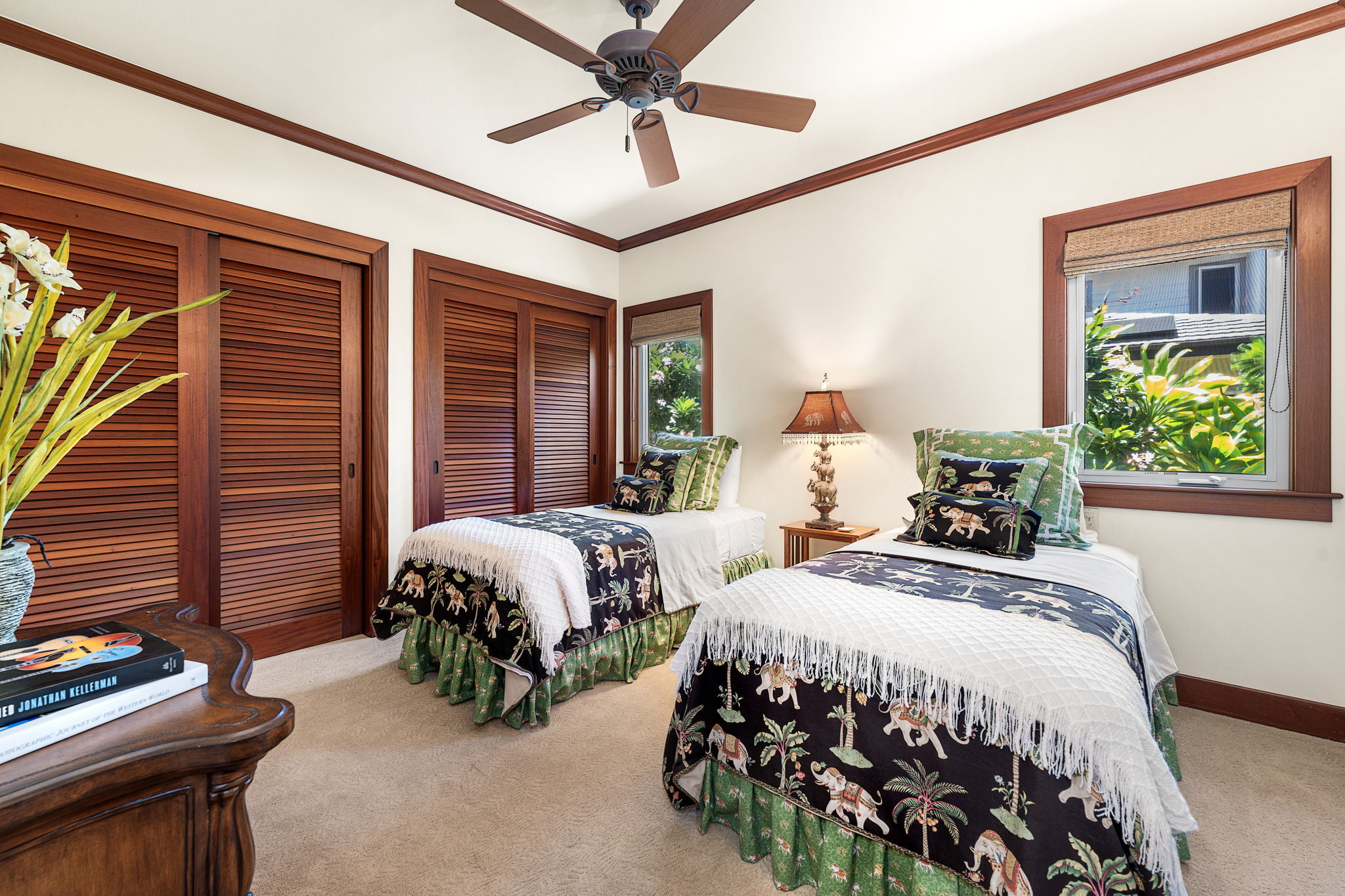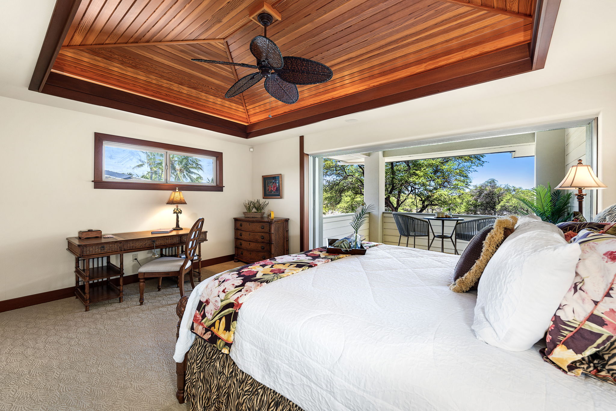 The gourmet kitchen is outfitted with Cherry cabinetry, SubZero, Dacor, and Fisher & Paykel appliances, all wrapped in warm, natural finishes that speak to timeless island style. Three generously sized bedroom suites each offer privacy and an en-suite bathroom.