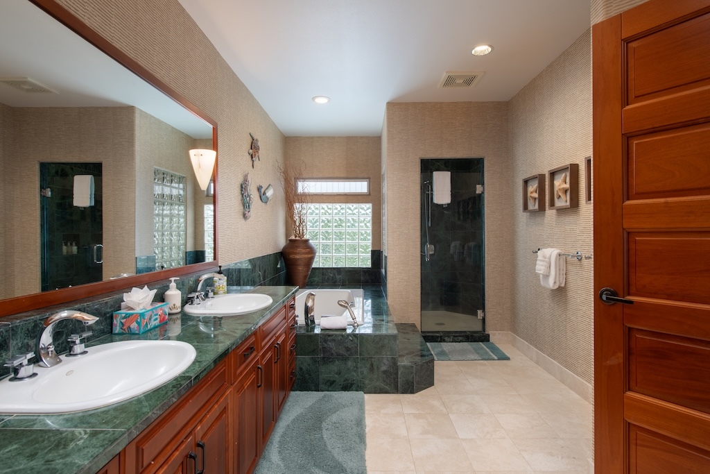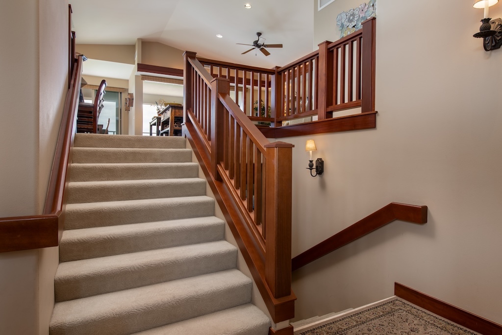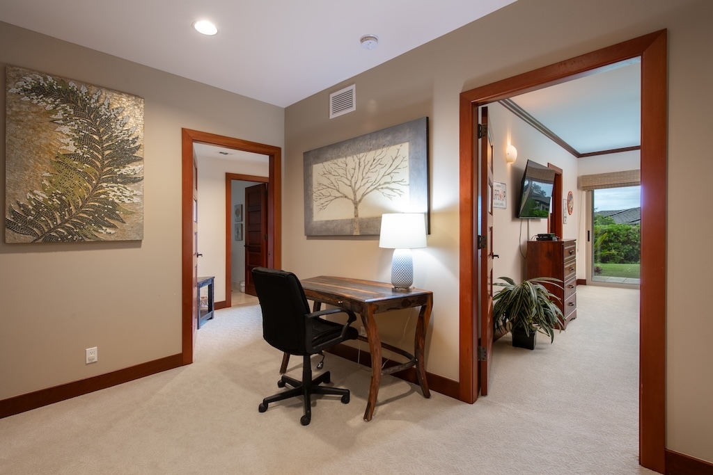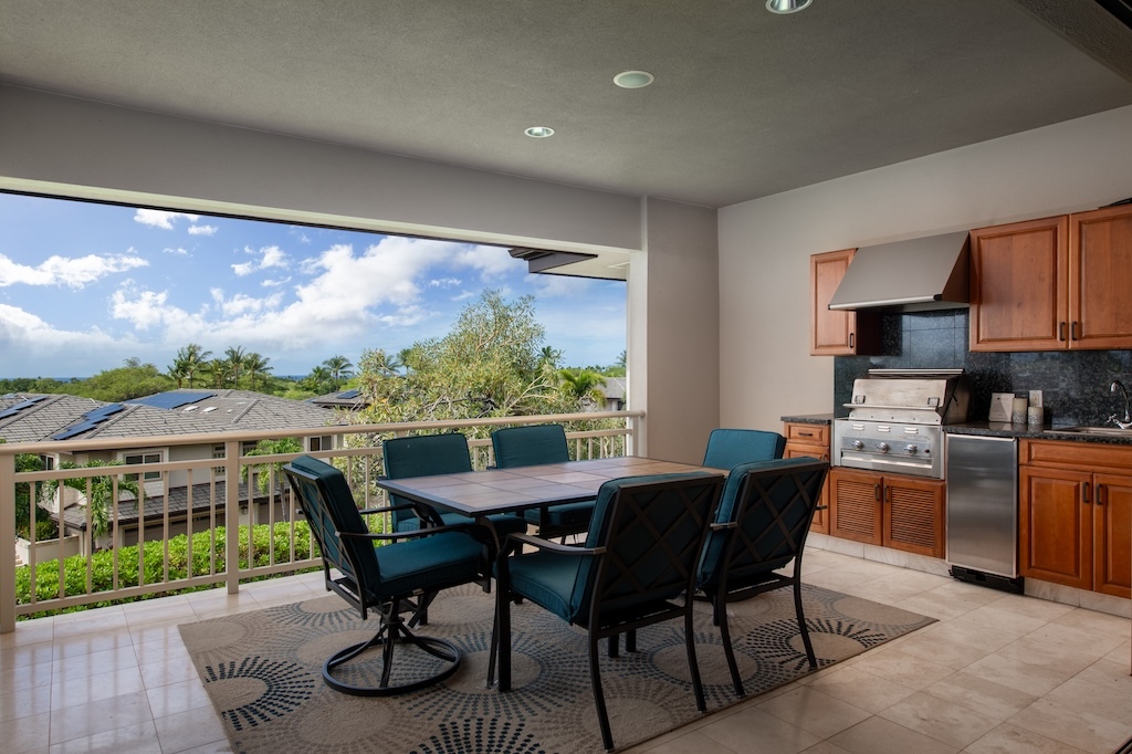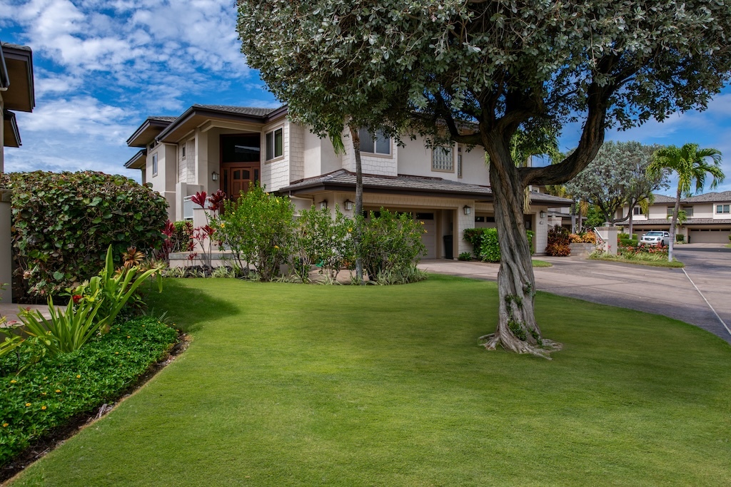 Villages 640 is one of the few elevated west facing villas with panoramic views of Hualalai and distant ocean and sunset views. The highly requested and large Maile floor plan has the primary bedroom suite on the upper level with the great room, dining room and kitchen and two guest bedroom suites and laundry on the lower level with direct access to the 2-car garage. Cherry cabinets, solid mahogany doors and woodwork, stone and carpet flooring, granite and marble counters, Subzero, Wolf, Fisher and Paykel appliances, vaulted ceilings and quality Maryl construction are featured. The lanai has a built in BBQ.
