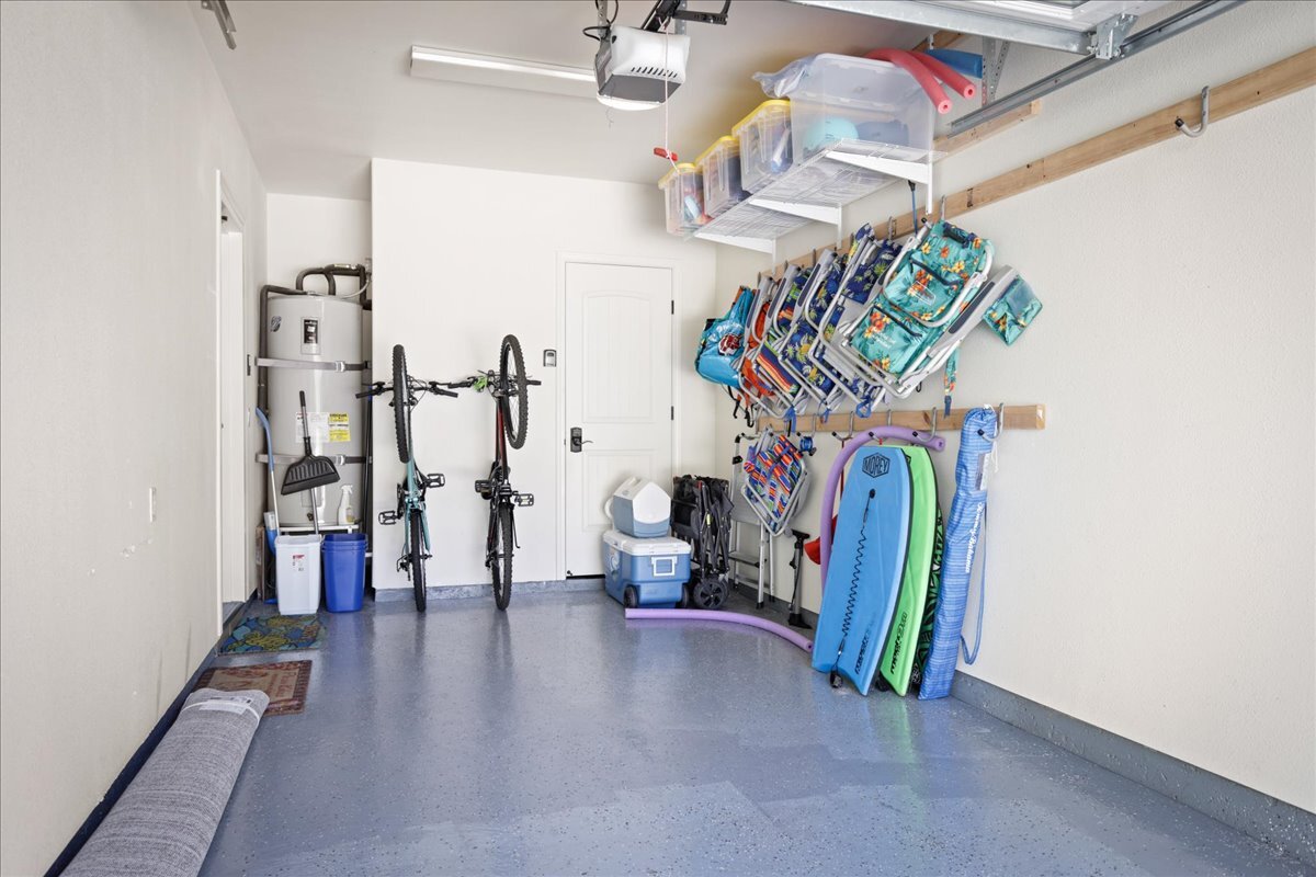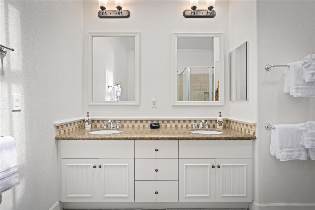 The open kitchen, dining, and living areas extend to a private lanai surrounded by tropical landscaping. The primary suite is located downstairs and features high ceilings, a walk-in closet, and an ensuite bath with dual vanities, soaking tub, and walk-in shower. For visiting guests, a convenient half bathroom is also located on the main level. Upstairs are two additional bedrooms with a full hall bath, providing comfort and privacy for family or visitors. An attached one car garage and desirable corner location add to the home’s appeal.