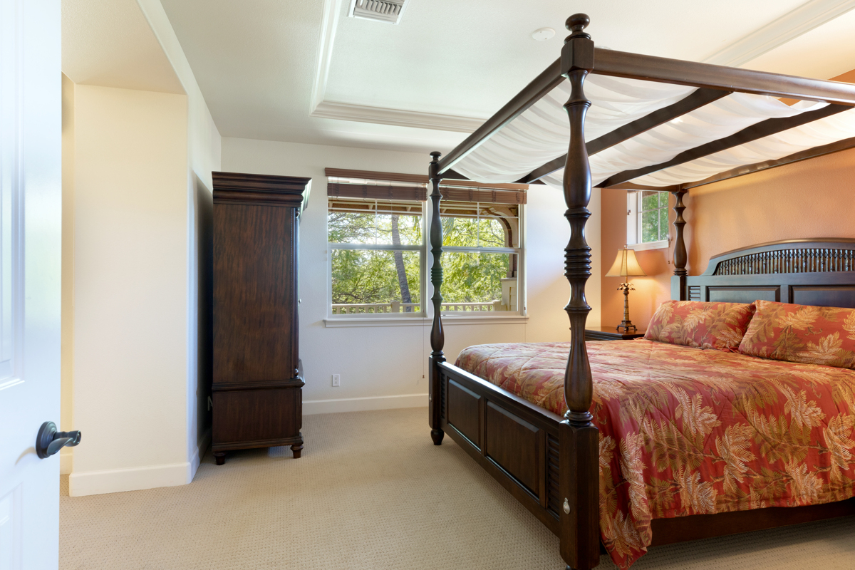Meanwhile, guests will appreciate the privacy of the opposite side of the upstairs, complete with their own well-appointed bathroom area and expansive windows showcasing the natural beauty of the surroundings.