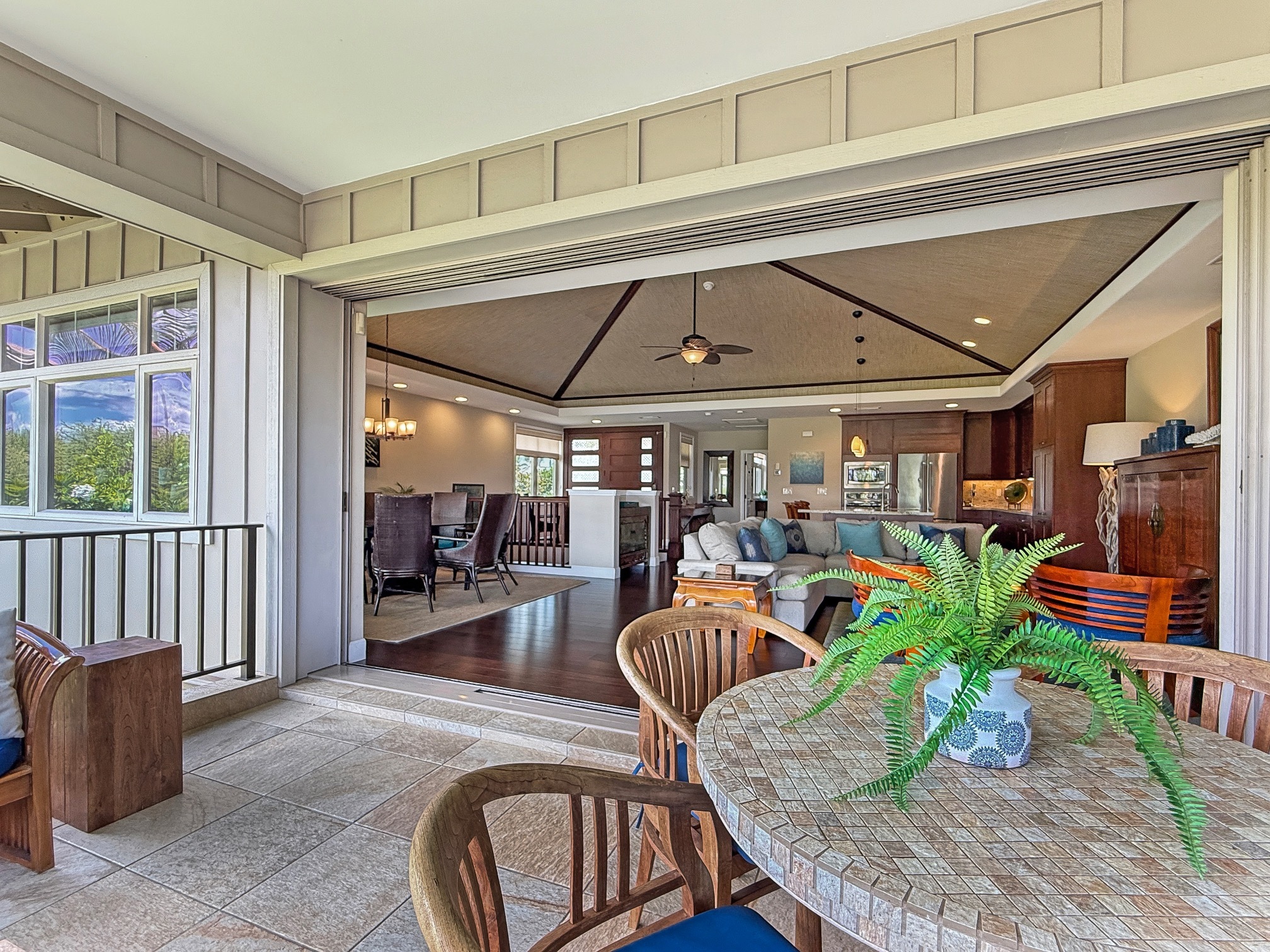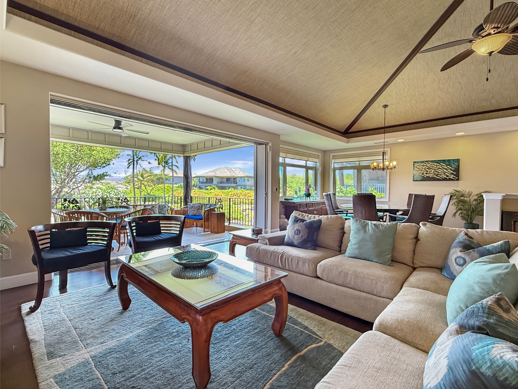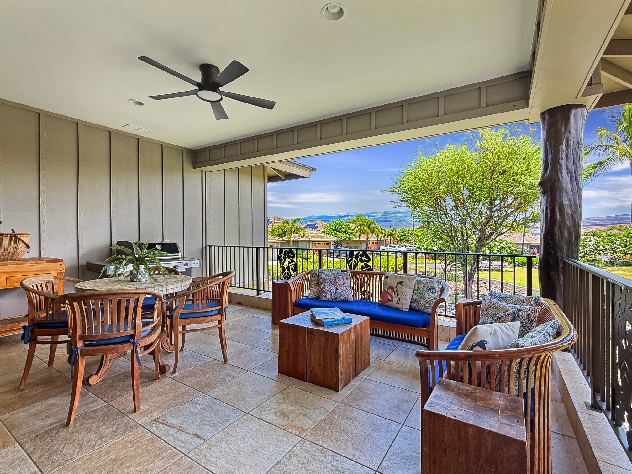 This 4 bedroom, 3-1/2 bathroom two-story townhome is an entertainer's delight with over 3,700 SF of interior and exterior space to gather with family and friends. The open floor plan features pocket doors that open to seamlessly connect the great room with a large lanai. Perched above a lush green space, it is the perfect spot for evening grilling and dining, or morning coffee as you watch the sunrise over Mauna Kea and view the peaceful Kohala Mountains.
